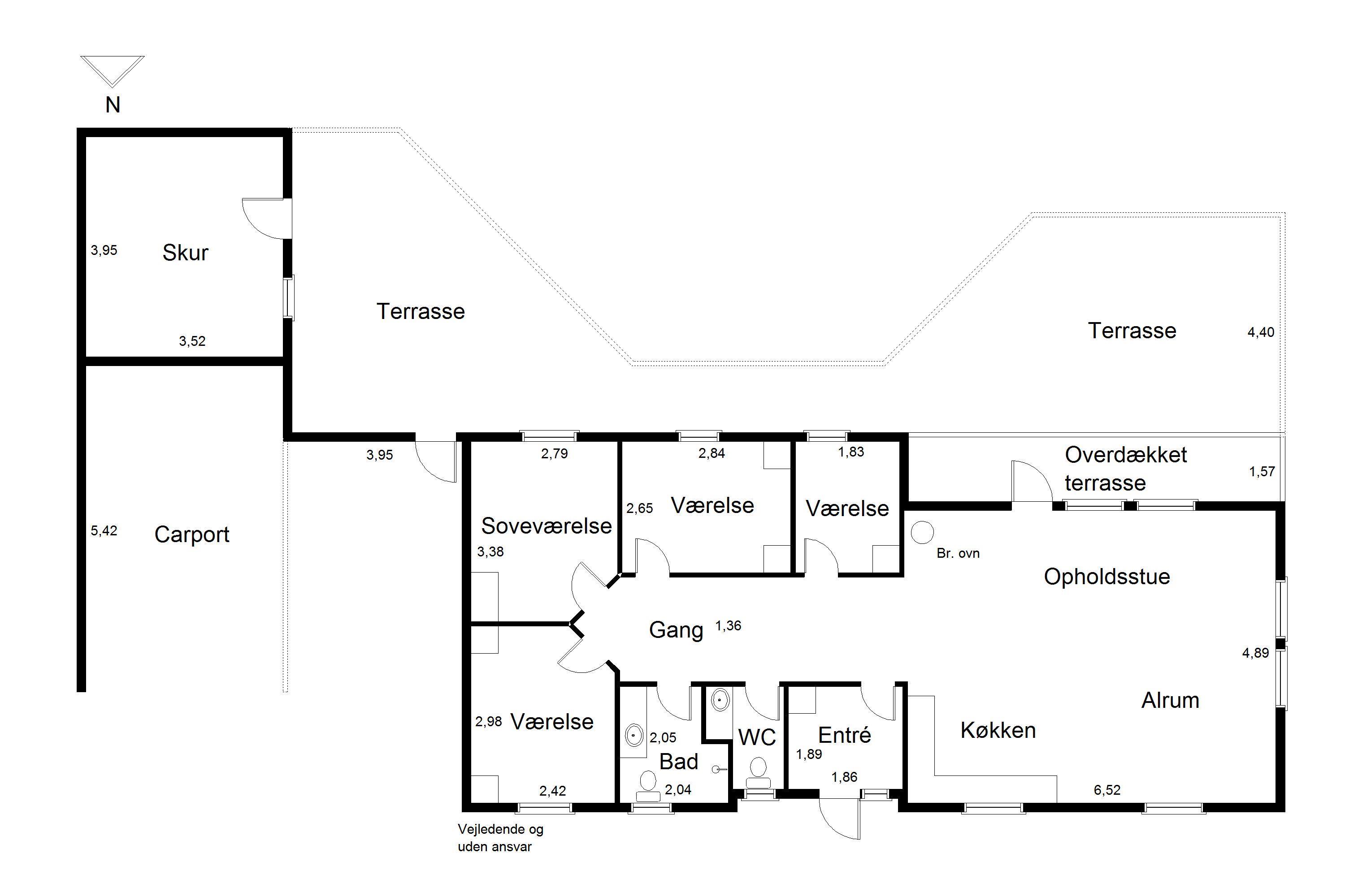 Huset indeholder: entre med god garderobeplads. Fra entreen kommer man over i bred fordelingsgang, her forefindes der 4 soveværelse samt 2 badeværelser. Der er gulvvarme på det store badeværelse. 4 soveværelse: DS + DS + DS + S. Badeværelse med bruseniche, toilet og vaske med underskab, samt et gæstetoilet med toilet og vask med skab. Vaskemaskine med inkluderet tørremaskine i garagen. Stort opholdsrum med køkken-alrum og stuen i åben forbindelse. Åbent hjørne køkken med opvaskemaskine, kombineret køle-/fryseskab, mikroovn, nyt ovn med induktionskogeplade og Induktion med booster-funktion. Spisestueafdeling ligger i åben forbindelse med køkkenet med kig til brændeovnen. Opholdsstuen er i åben forbindelse med køkken alrummet. Opholdsstuen er indrettet med en stor hjørnesofa, Smart-TV med Yousee mellempakke, fra sofaen er der kig til husets brændeovn. Udgang til stor ugeneret delvis overdækket terrasse fra opholdsstuen. På grunden er der et gyngestativ, en trampolin samt et legehus til børnene og en grill som kan benyttes. Grunden er udlagt i græs der giver rig mulighed for at boldspil (der er opstillet 2 fodboldmål). Rygning og husdyr er ikke tilladt. Huset råder over en varmepumpe, som er monteret i stuen. Med denne energibesparende varmepumpe kan el-omkostningerne reduceres. Der betales ekstra for vand. Byggeår 1968, er inden for de seneste år renoveret fra A-Z.