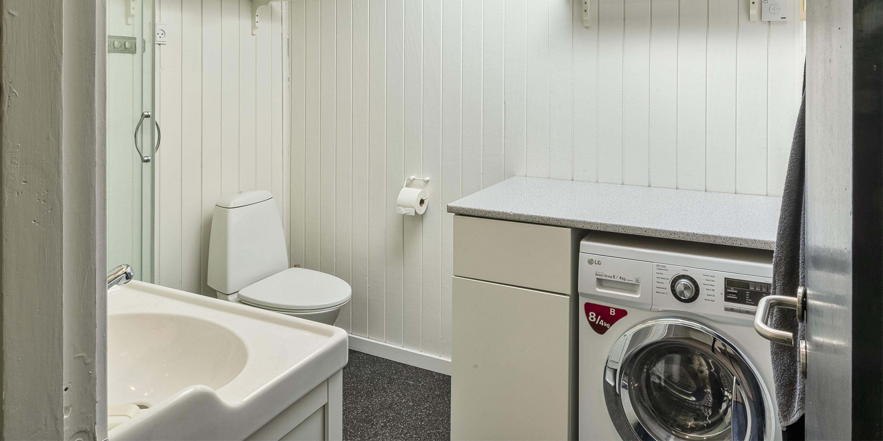Bad med toilet, bruser og vask