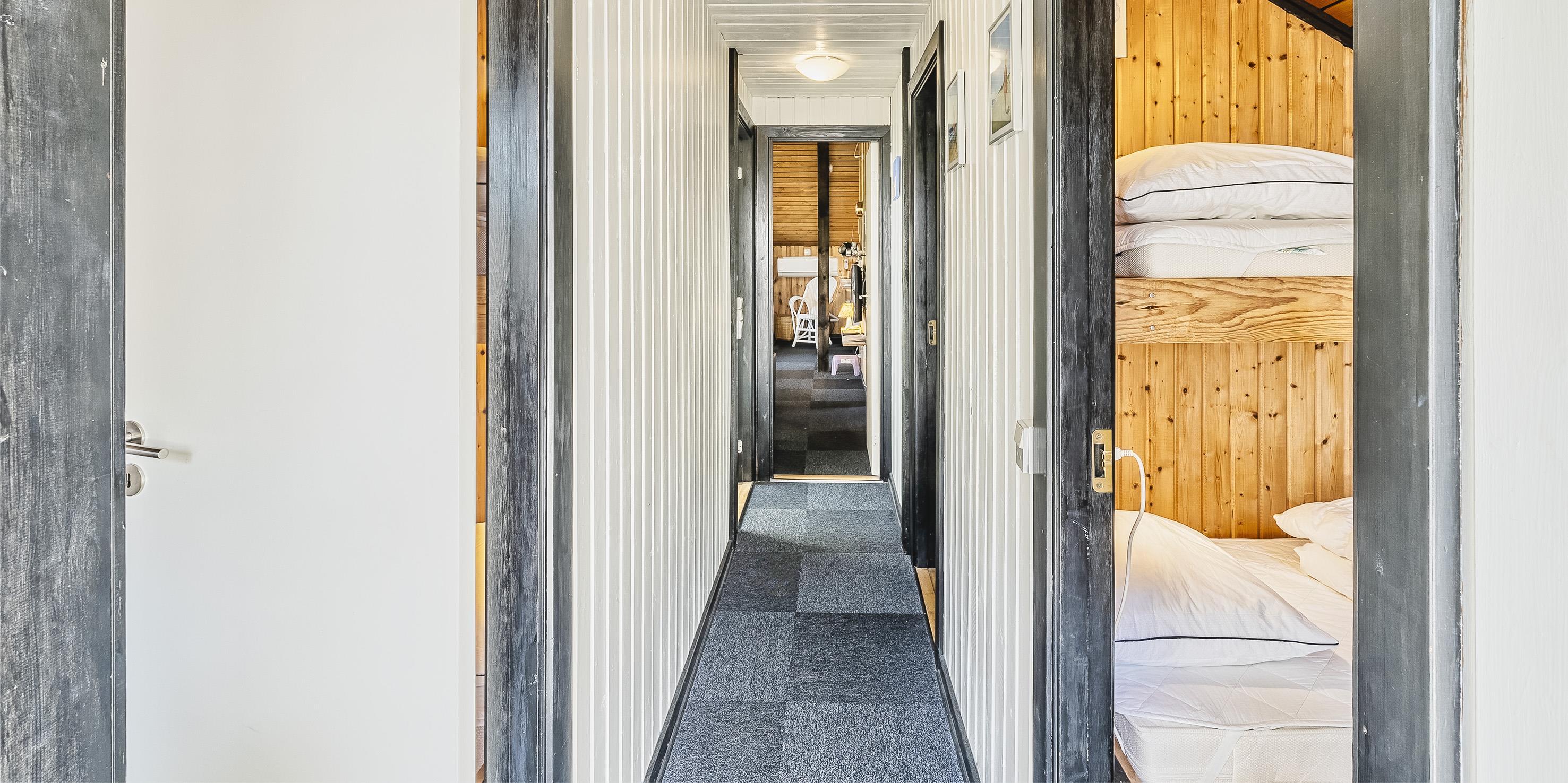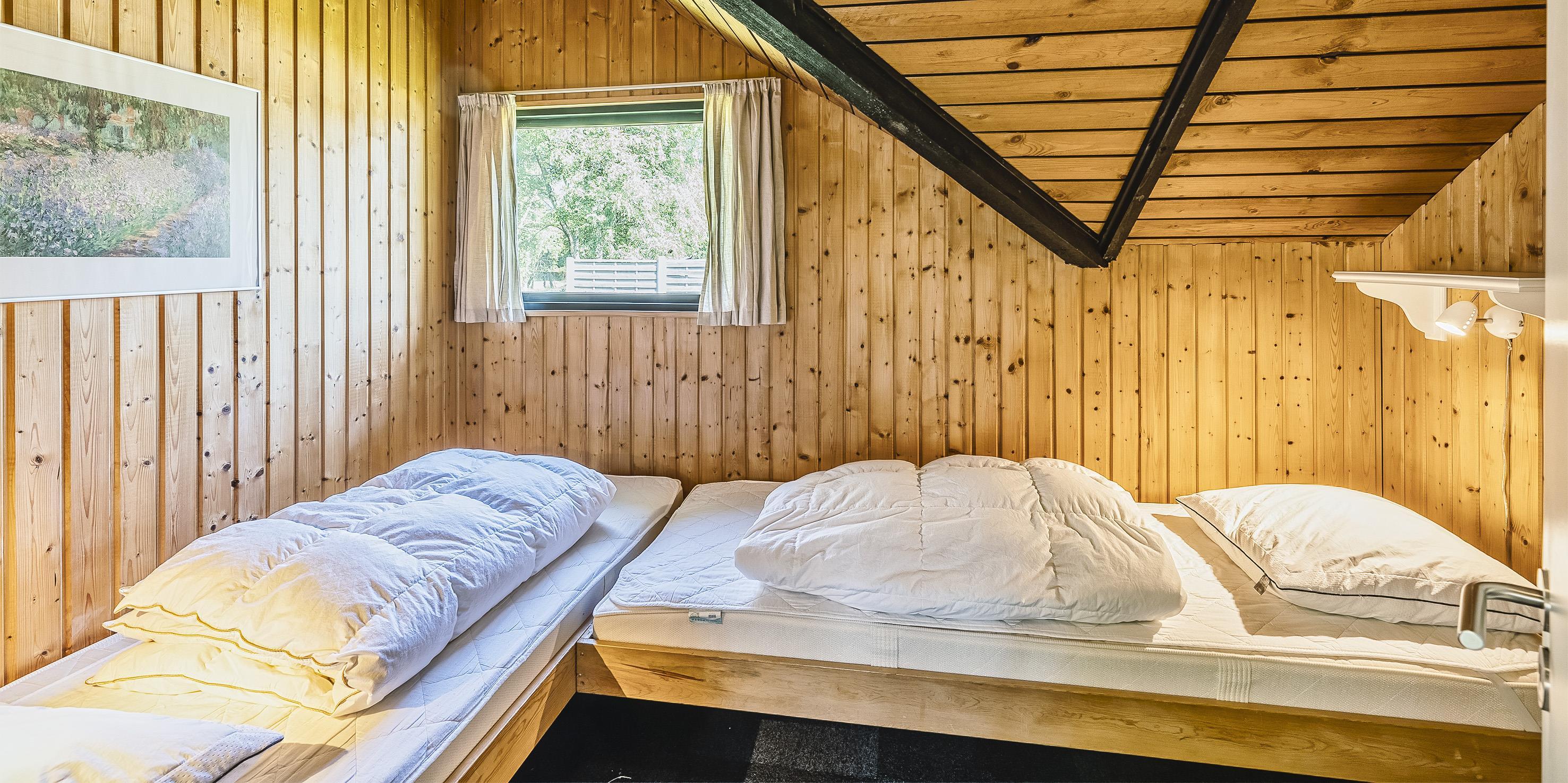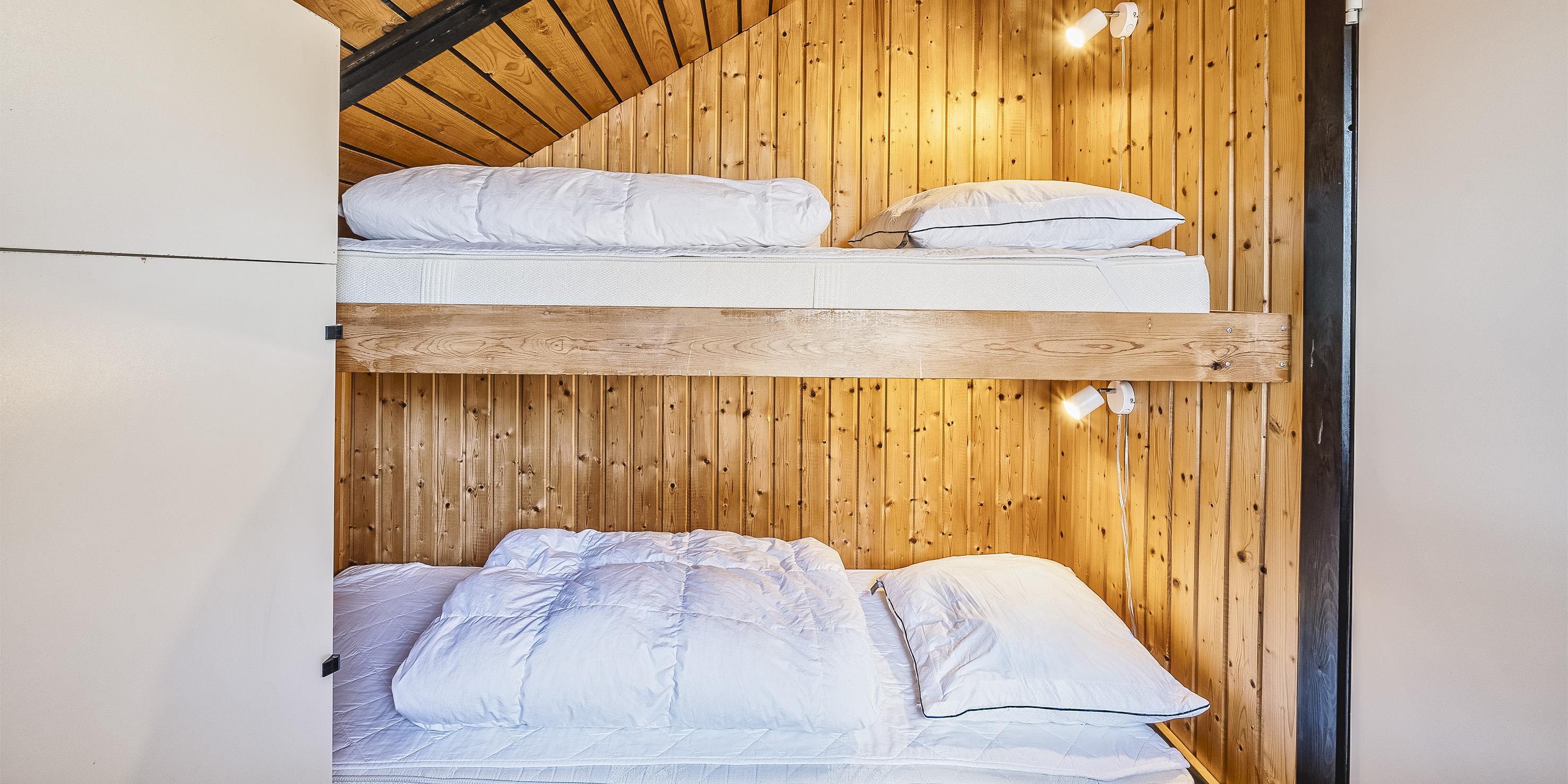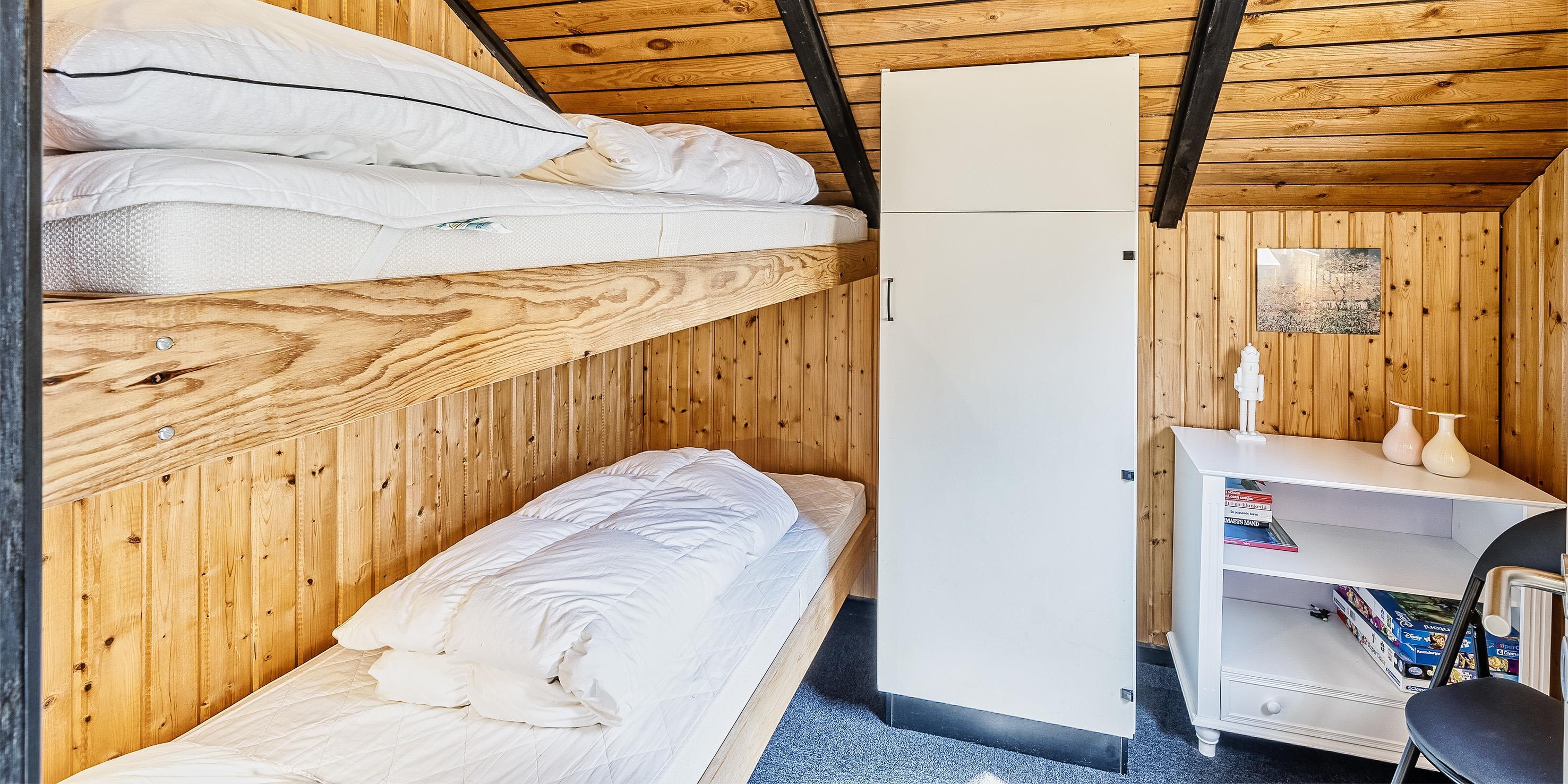 3 soveværelser. 1 med 2 enkeltsenge (á 90x200 cm). 2 med køjeseng.