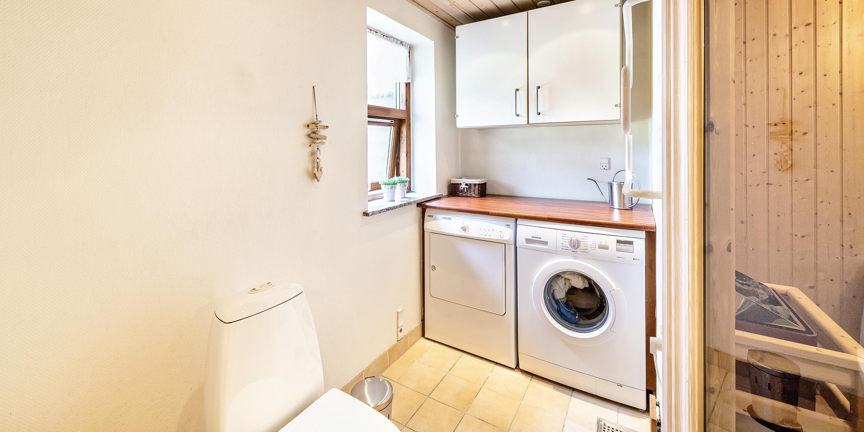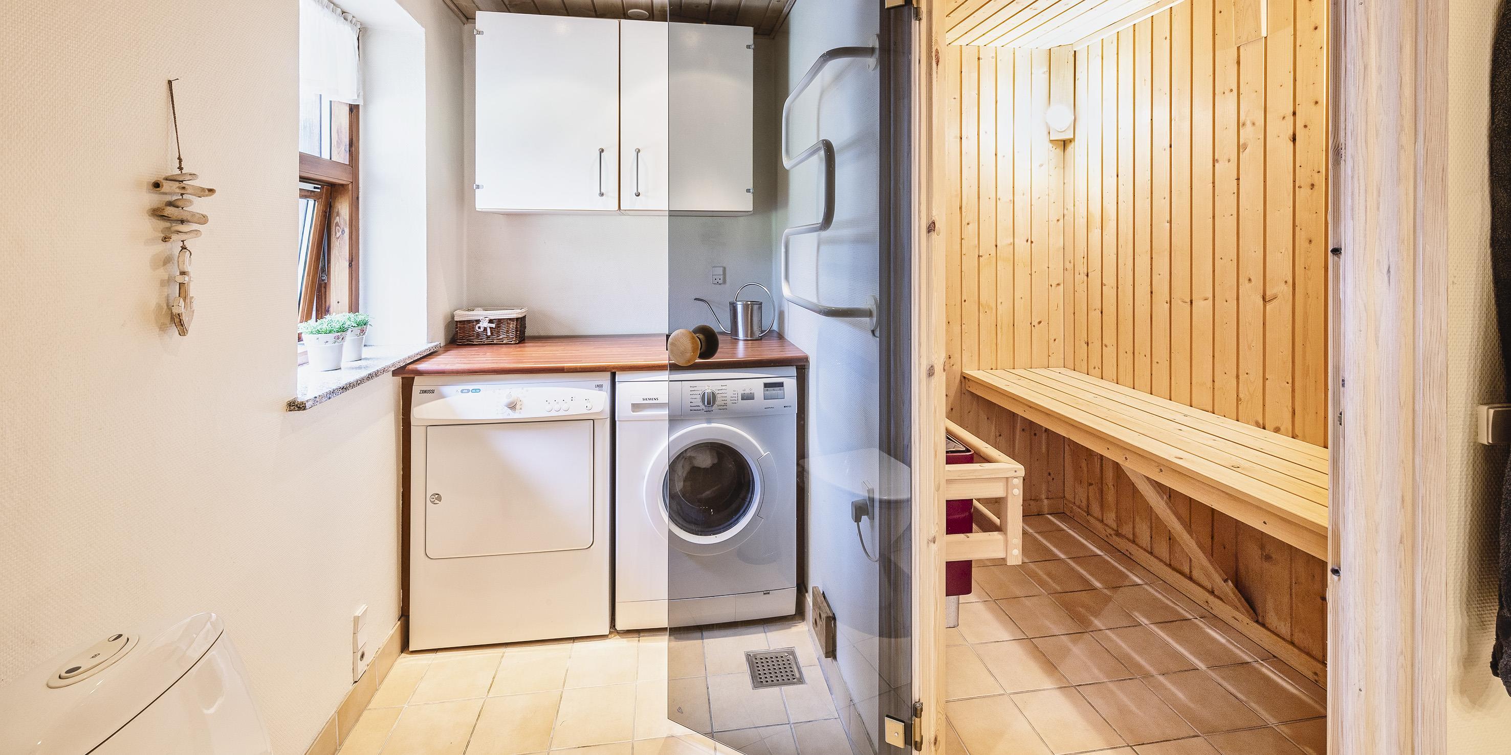 Dejligt stort badeværelse med brusekabine, samt direkte adgang til sauna. I badeværelset er der gulvvarme, vaskemaskine, tørretumbler og håndklædetørrer.