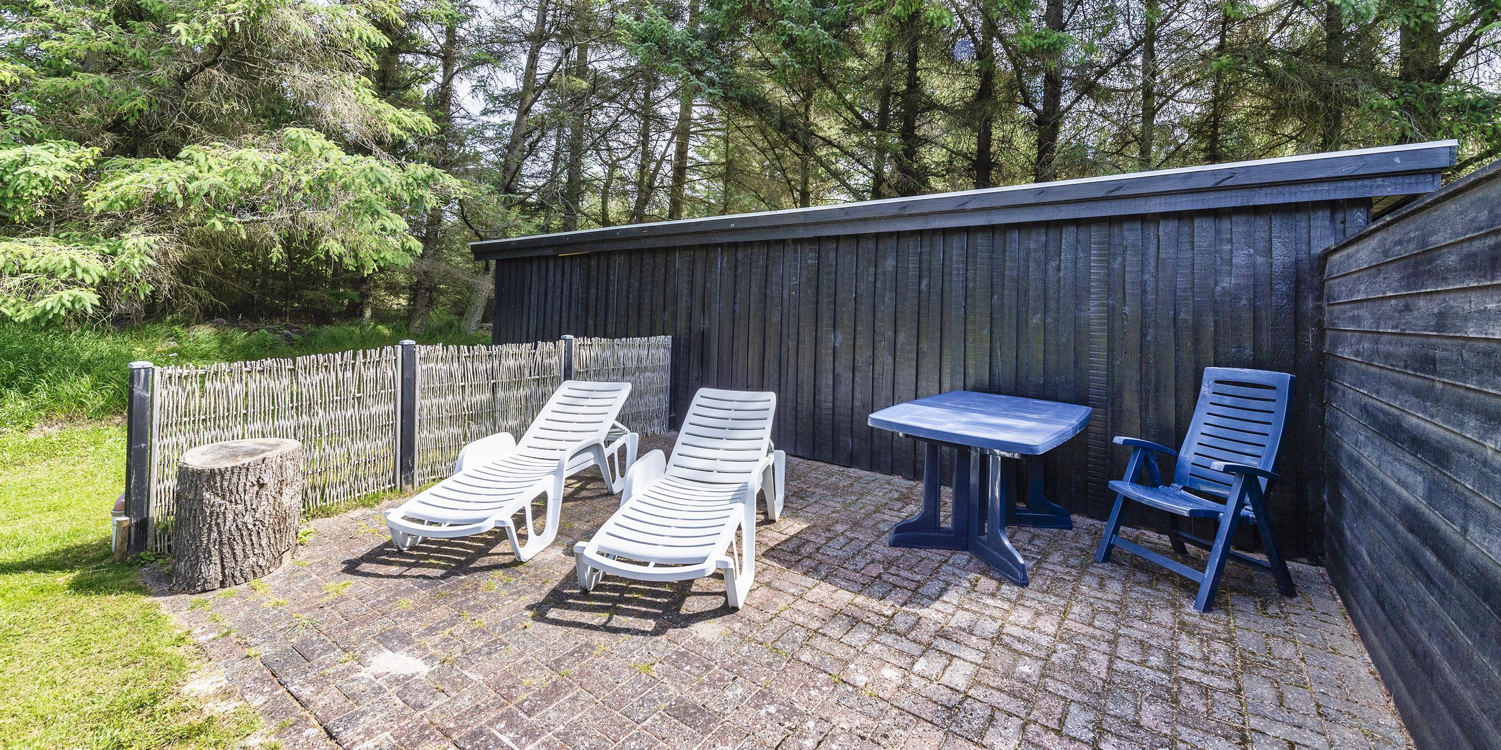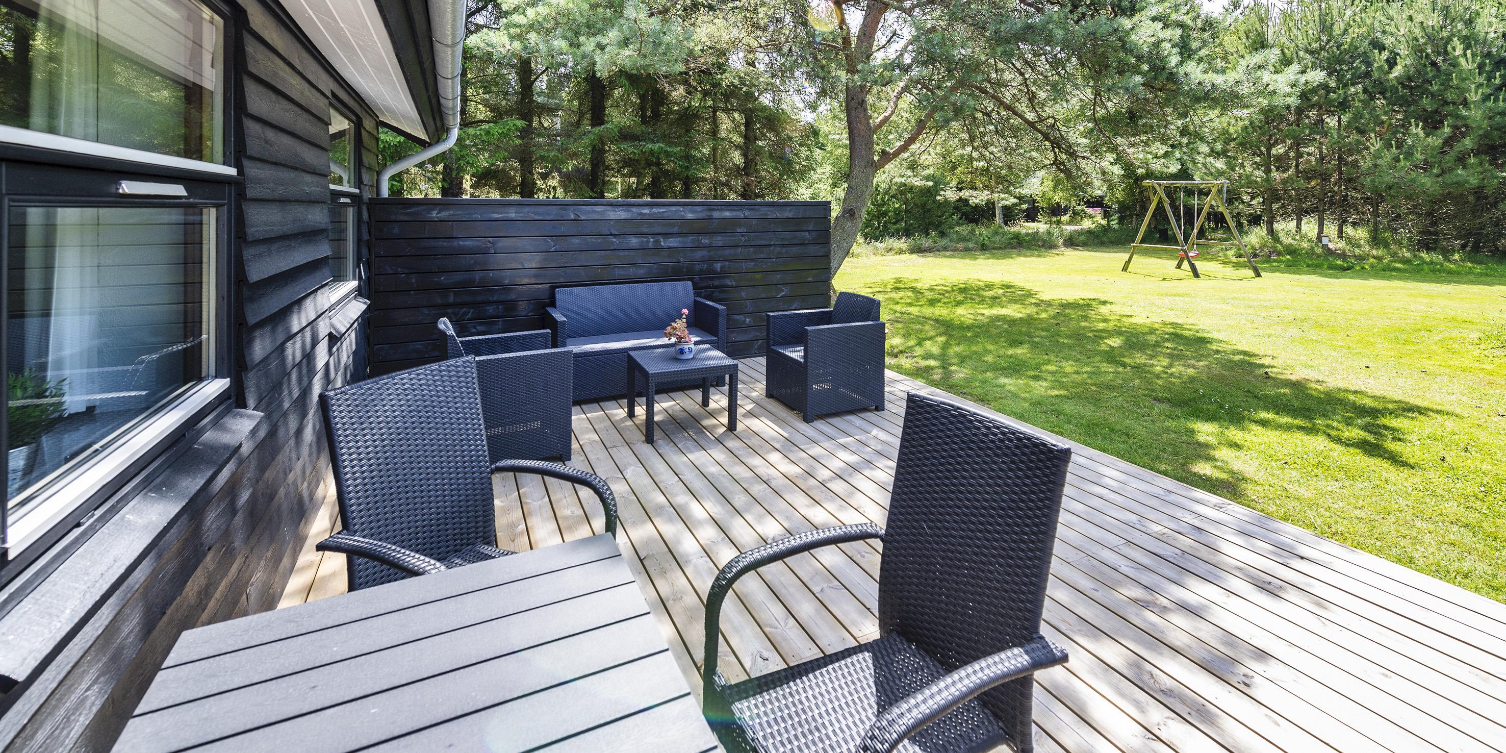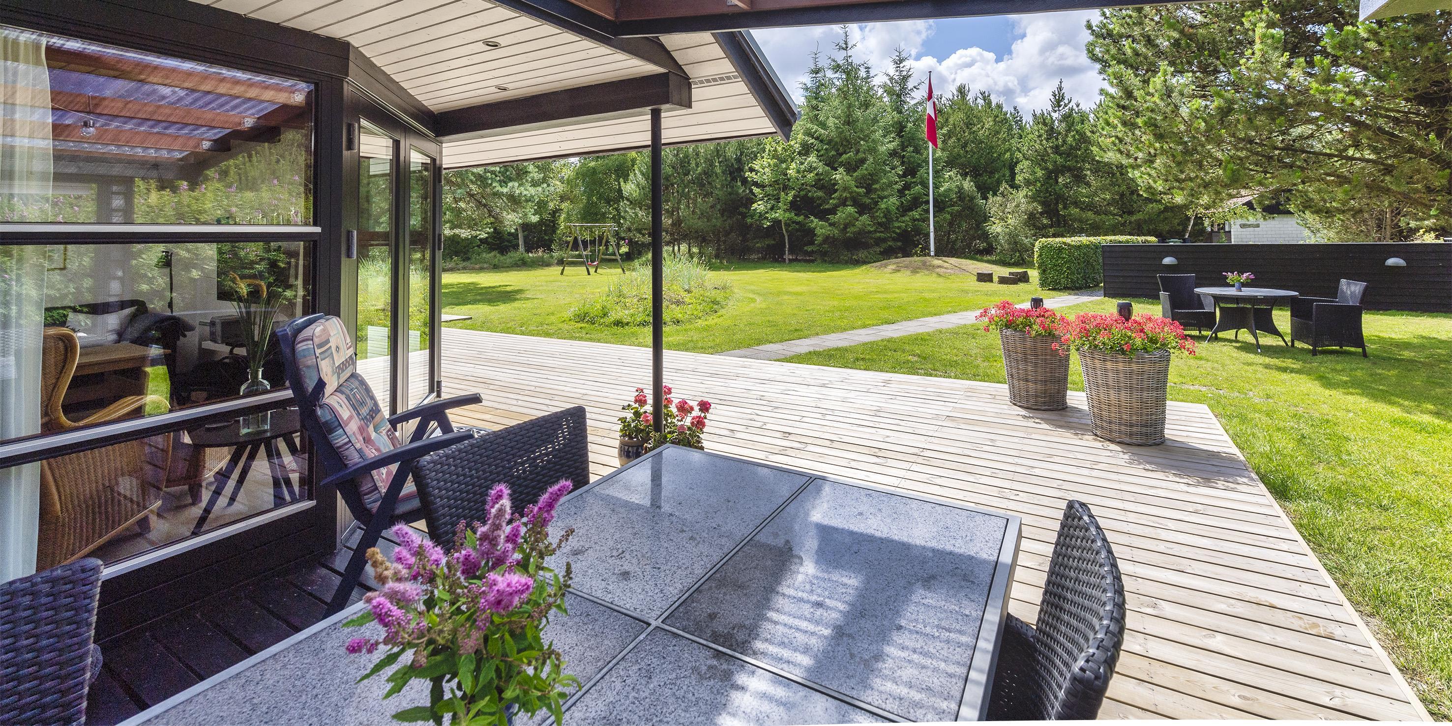 Der er altid mulighed for at finde en læfyldt hyggekrog på grunden, idet der er en stor nyanlagt terrasse på såvel nordsiden som sydsiden af huset. Udendørsarealet er veludstyret med havemøbler.
