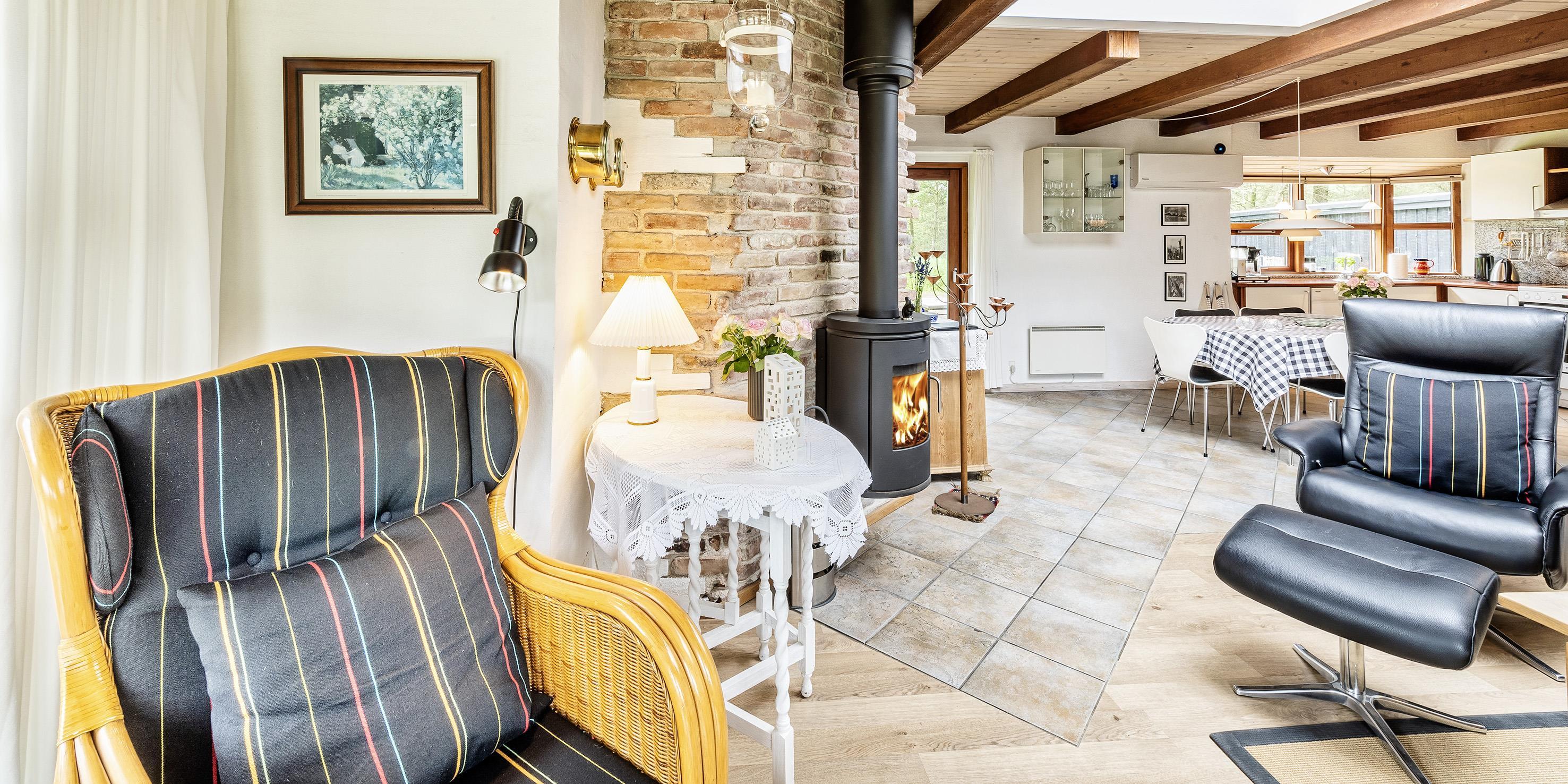 Der er åbent køkken i forbindelse med stuen, hvor der er et dejligt lysindfald gennem ovenlysvinduer i taget Fra stuen er der direkte adgang til en overdækket terrasse samt udgang til terrasse på nordsiden af huset. I stuen er der brændeovn, smart TV med google chrome cast, parabol samt DR tv.