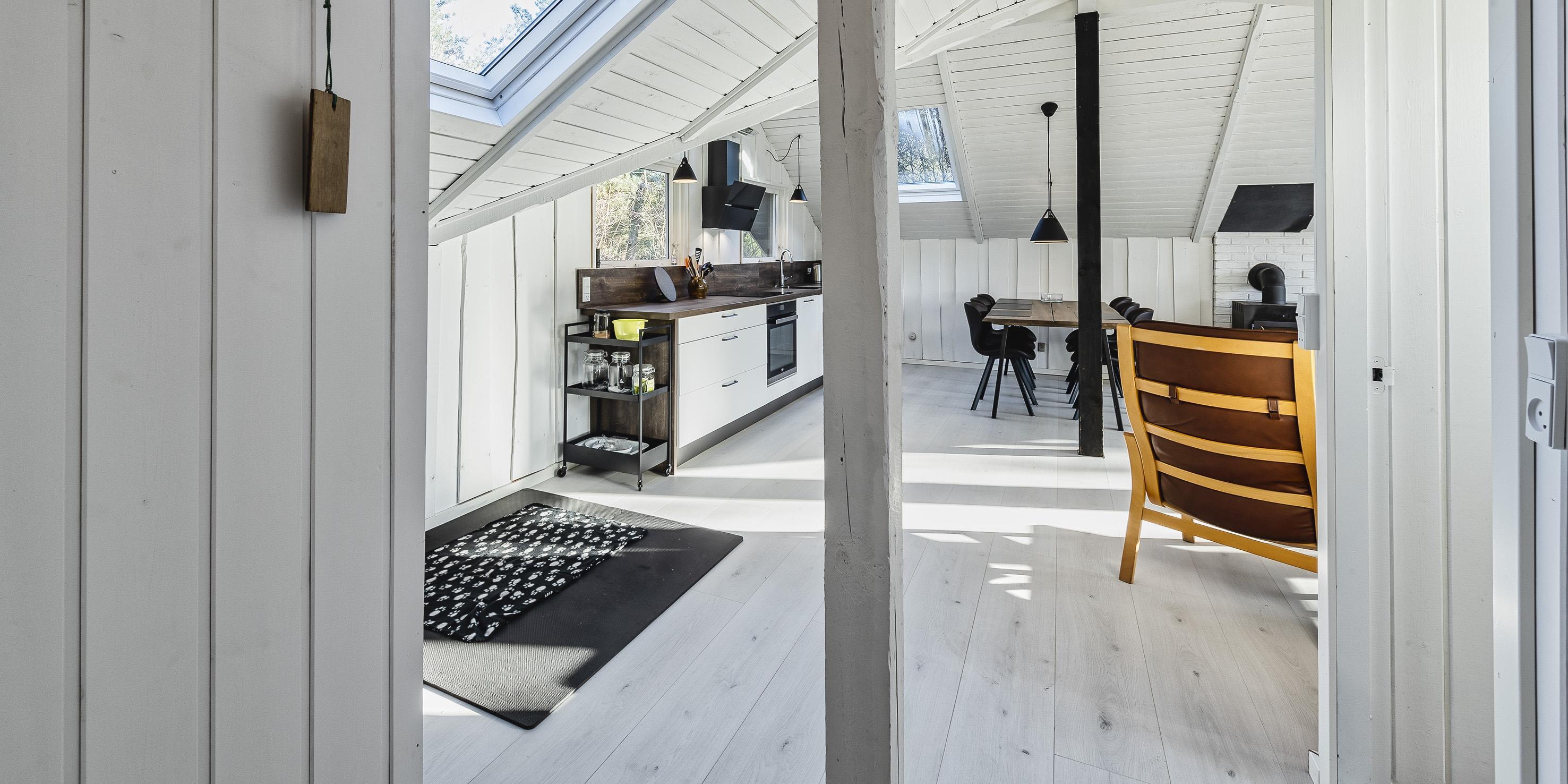 Huset byder på en entre/fordelingsgang. Herfra er der adgang til 2 soveværelser: DS + 2S, soveværelserne har ingen klædeskabe til rådighed. Mindre badeværelse med toilet, vaskearrangement og bruseniche samt en topbetjent vaskemaskine. Fra fordelingsgangen kommer man ind til opholdsstuen, der er i åben forbindelse med et nyt køkken. Det nye køkken fremstår med induktion kogeplade, indbygningsovn, emhætte (kulfilter), opvaskemaskine og køleskab med lille frostboks. Indbyggede opbevaringsskabe. Dejligt lyst spiseområde med tagvindue og hyggeligt sofahjørne med fjernsyn med Yousee streamings TV-kanaler, trådløs internet (200/200) forbindelse og brændeovn. Brændeovnen kan både nydes fra sofahjørnet og fra spisestueafdelingen. Mod syd forefindes et stort vinduesparti med havedør ud til en delvis lukket træterrasse og delvis overdækket. Huset fremstår endvidere med nye parketgulve i hele huset, loft til kip i opholdsrummet, og lysnede vægge samt lofter der giver den rigtige sommerhusstemning. Huset er el opvarmet der suppleres med ny varmepumpe og brændeovn. Der er en elladestander til biler ved huset. Husdyr er velkomne, men rygning indendørs er ikke tilladt. Byggeår er 1972, men huset er renoveret i 2020. Elbiler kan oplades ved huset.