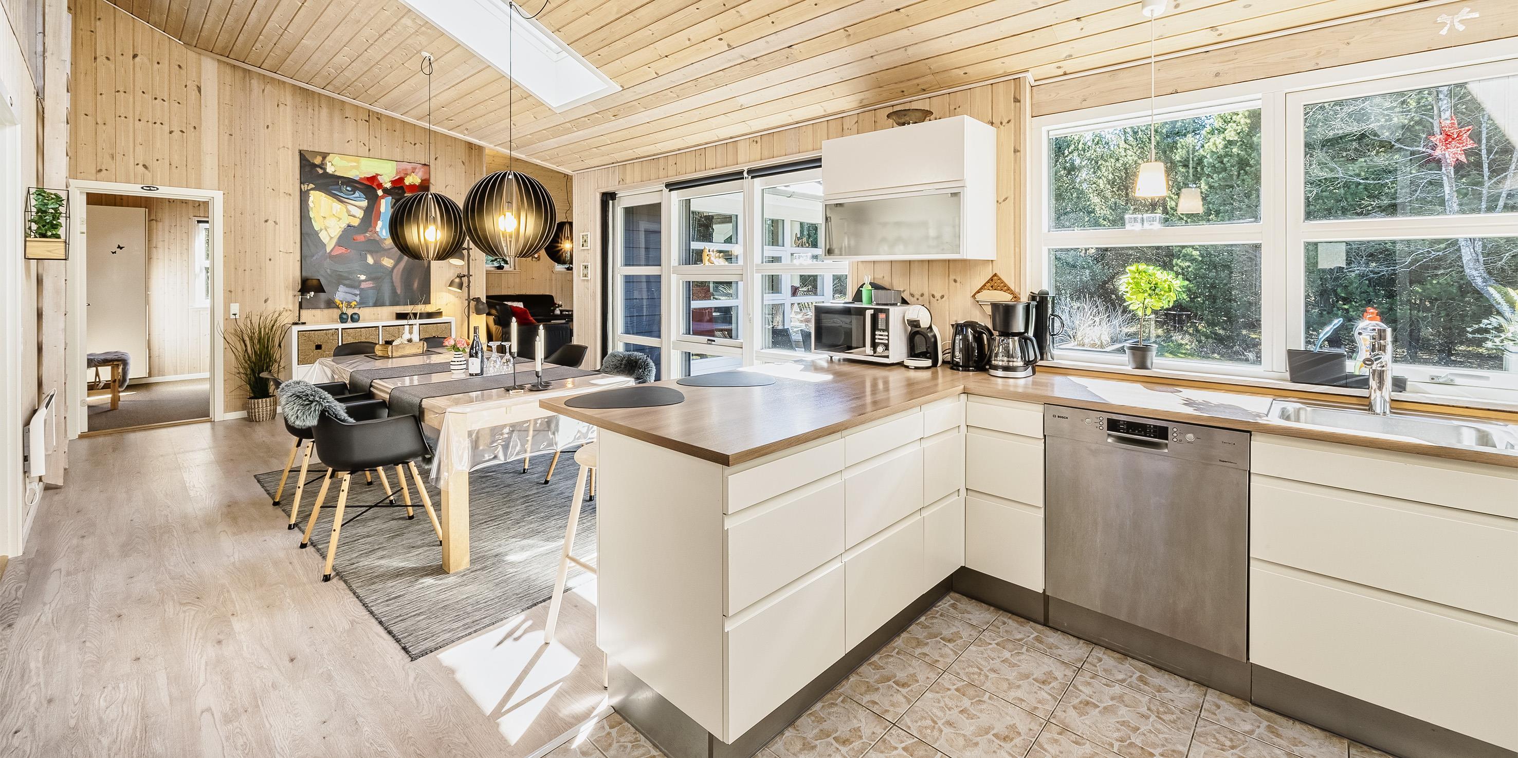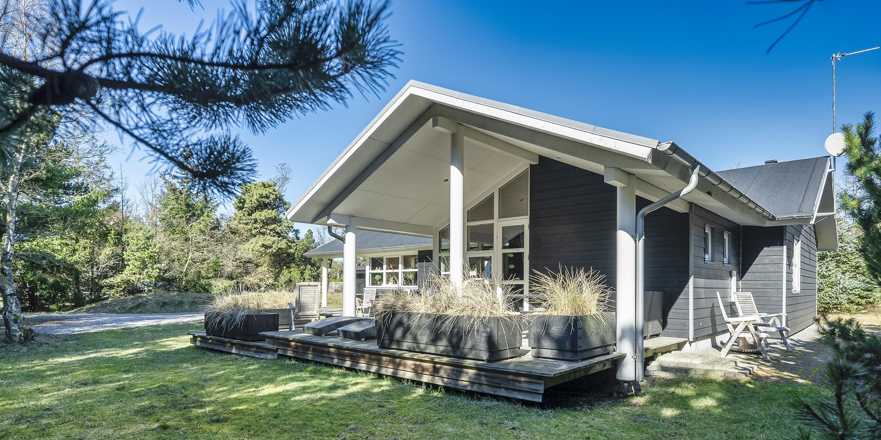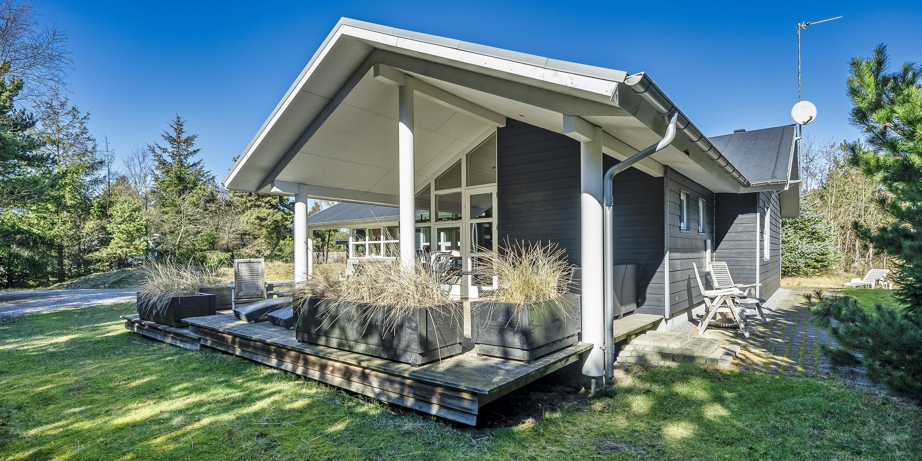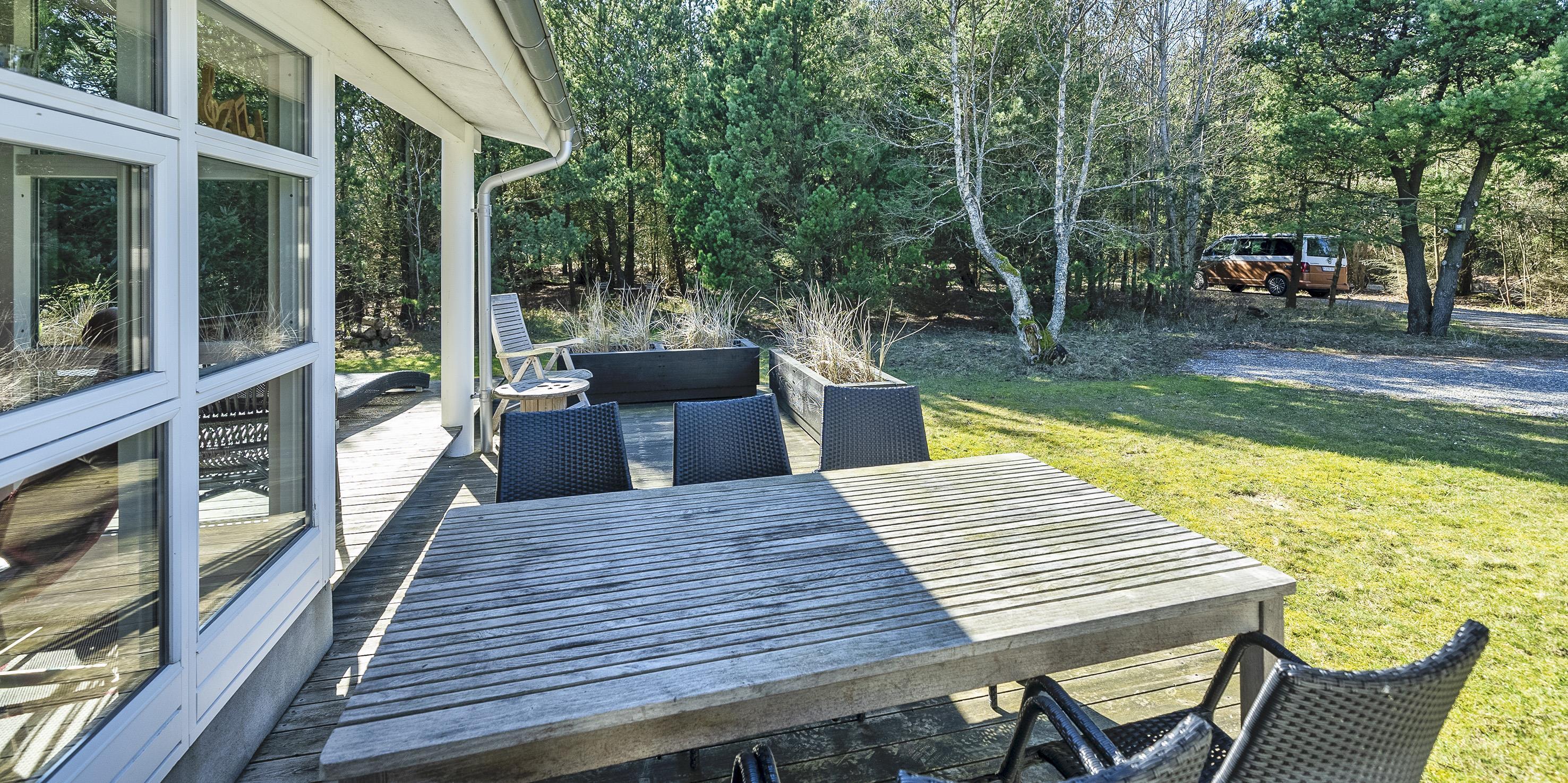 Moderne og velindrettet sommerhus til 6 personer, ca. 1.500 meter fra stranden, beliggende på stor delvis lukket grund. Mange træer er fældet rundt om huset sådan at solen rigtig kan komme ind og man kan nyde det på den skønne terrasse. Stor træterrasse i flere niveauer og en delvis overdækket terrasse. Huset indeholder: Entre indgangsparti med garderobeplads og vaskemaskine. Fra entré kommer man over i det store køkken-alrum med loft til kip, delvis flisegulve som parketgulve. Lyst og venligt vinkelkøkken med bageovn, keramisk kogeplade, opvaskemaskine, mikroovn og køle-/fryseskab. Stor spisestue med godt lysindfald fra 2 tagvinduer. Fra køkken-alrummet er der 2 hemse. Fra spisestuen går man et trin op i en hyggelig opholdsstue med brændeovn, fjernsyn med tv kanaler over Stofa (lille pakke). Smart-Tv. Trådløs internet (50/50). Playstation 3 samt diverse spil. Varmepumpe . Der er 3 soveværelser: DS + DS + DS. Master badeværelse med bruser/wc, sauna og spa. Gæstetoilet med bruser. Der er tilladt 2 små hunde med en ryghøjde på max. 40 cm – eller én stor hund. Katte er ikke tilladt! Cykelskur med mere ude på grunden. Byggeår 2009.