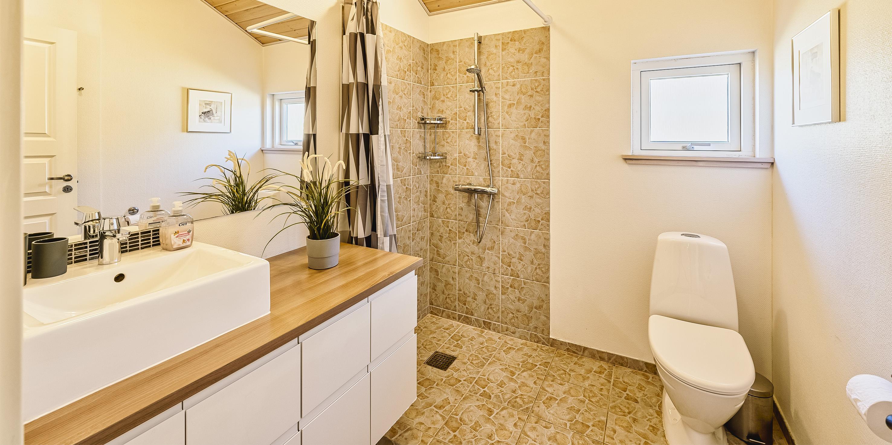 Bad med toilet, bruser og vask