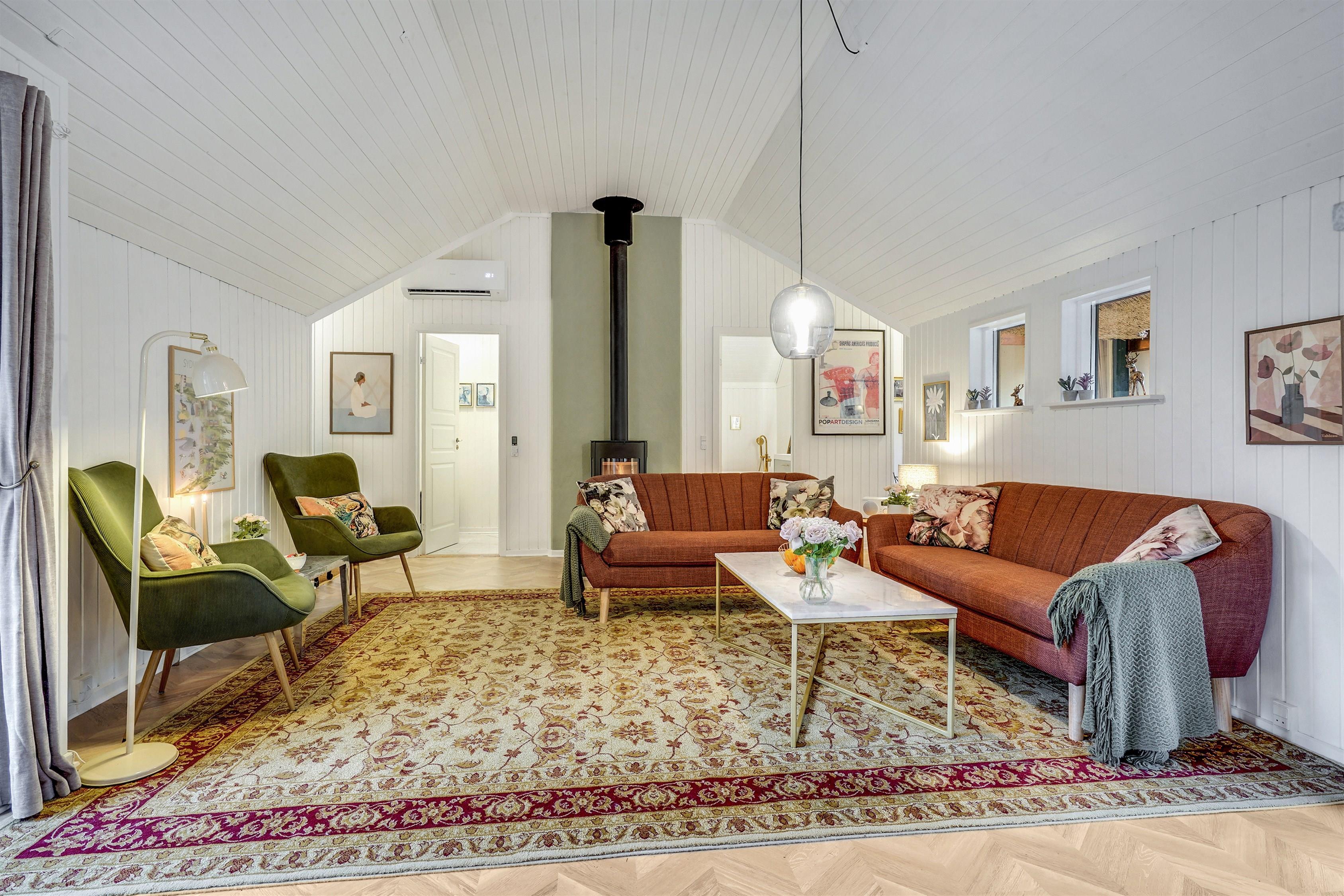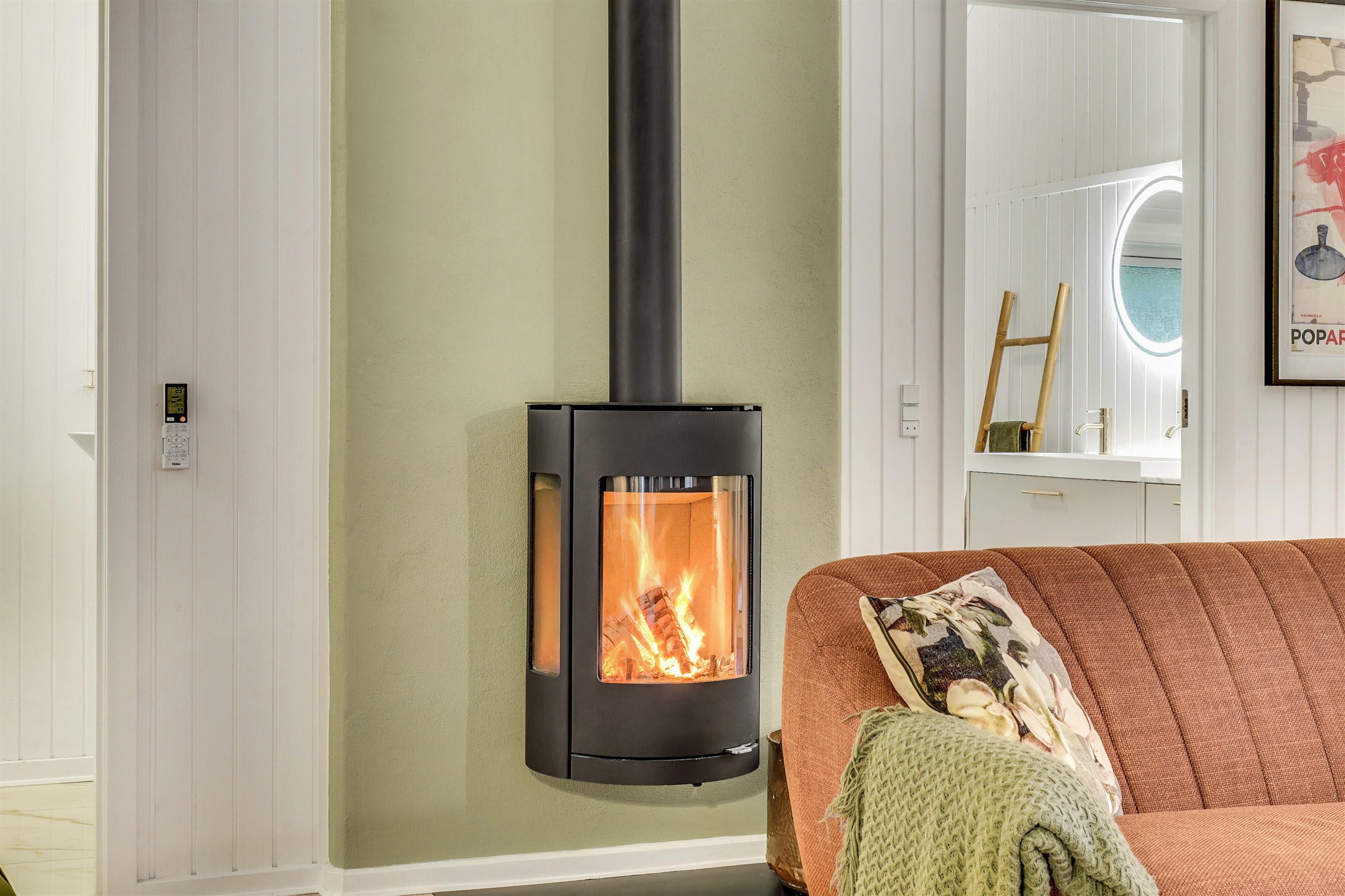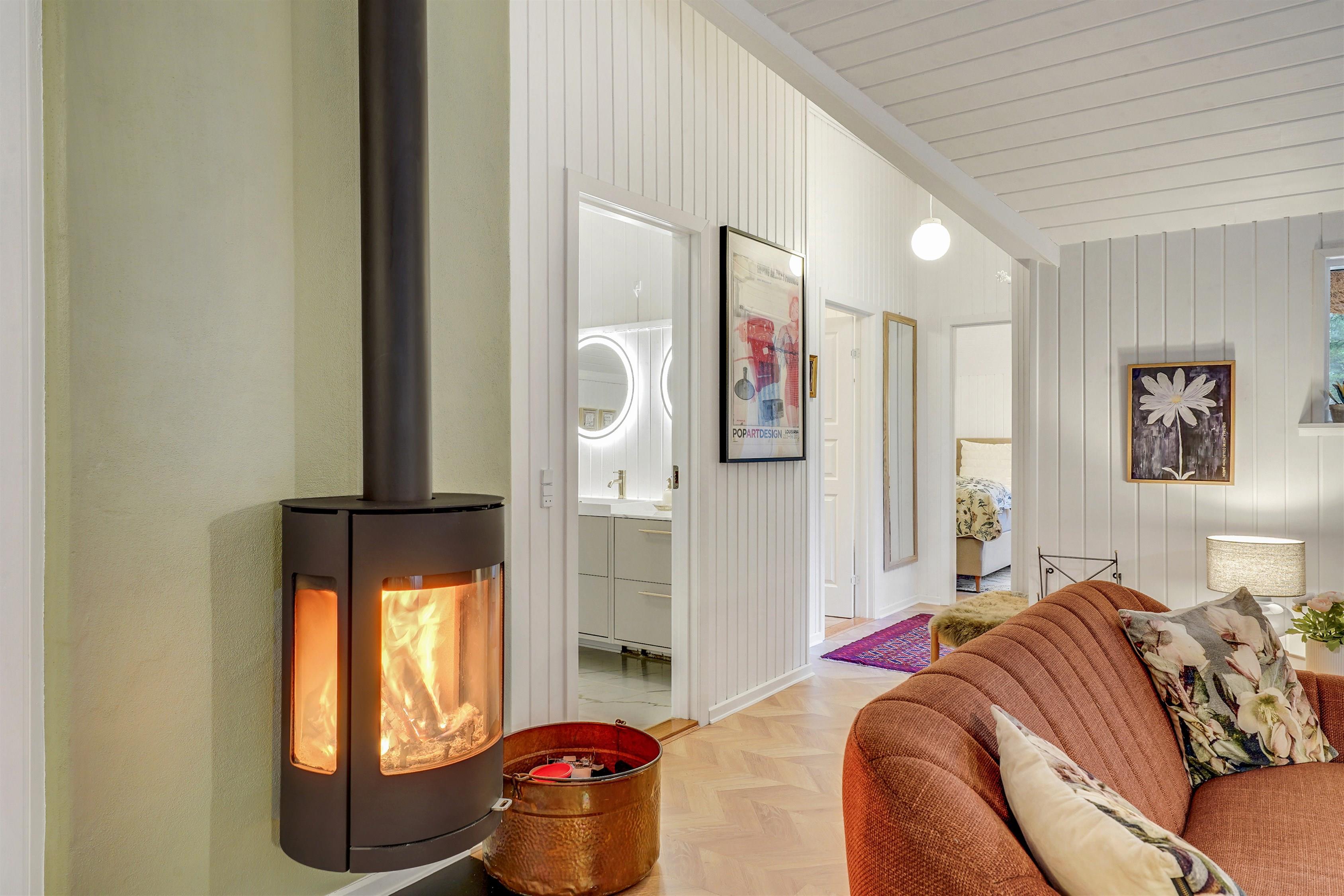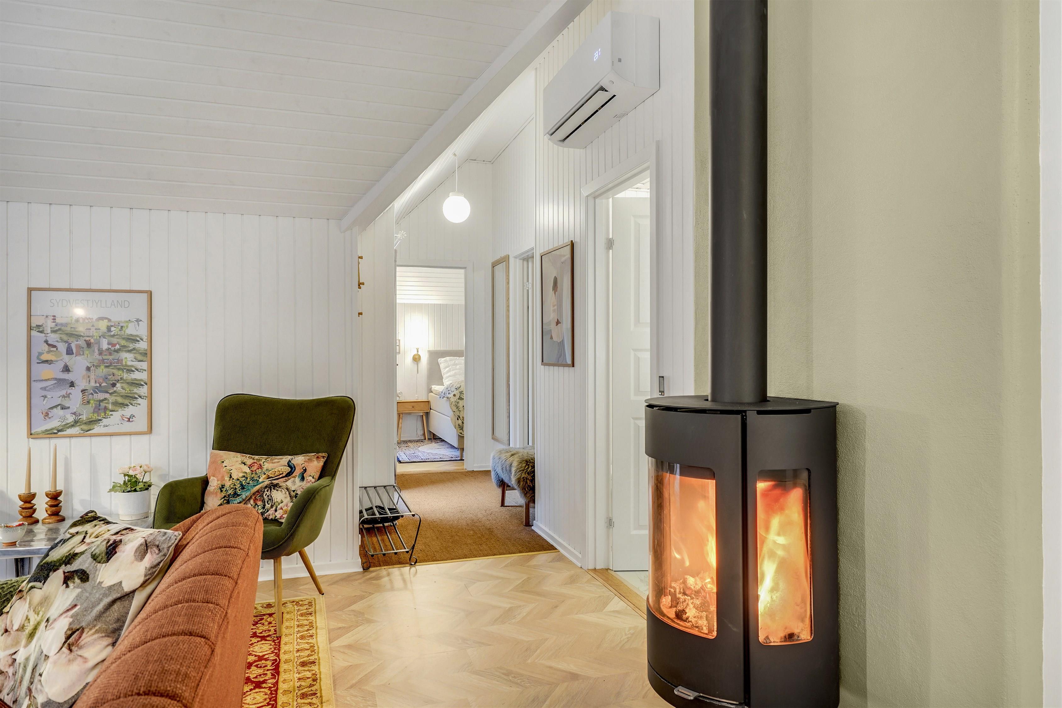 Huset opvarmes med energivenlig luft/luft varmepumpe, brændeovn og el-radiatorer på værelserne.