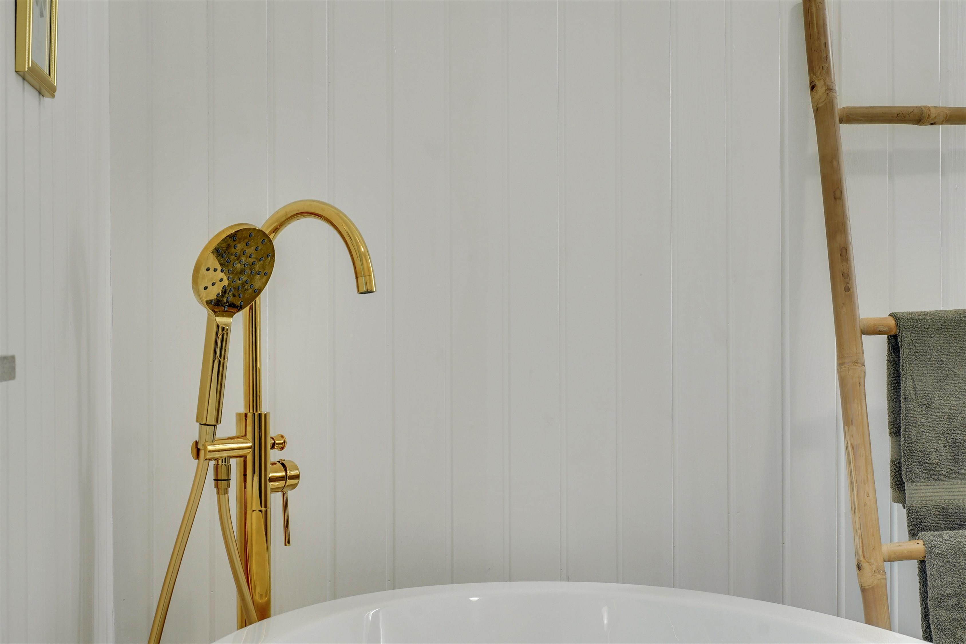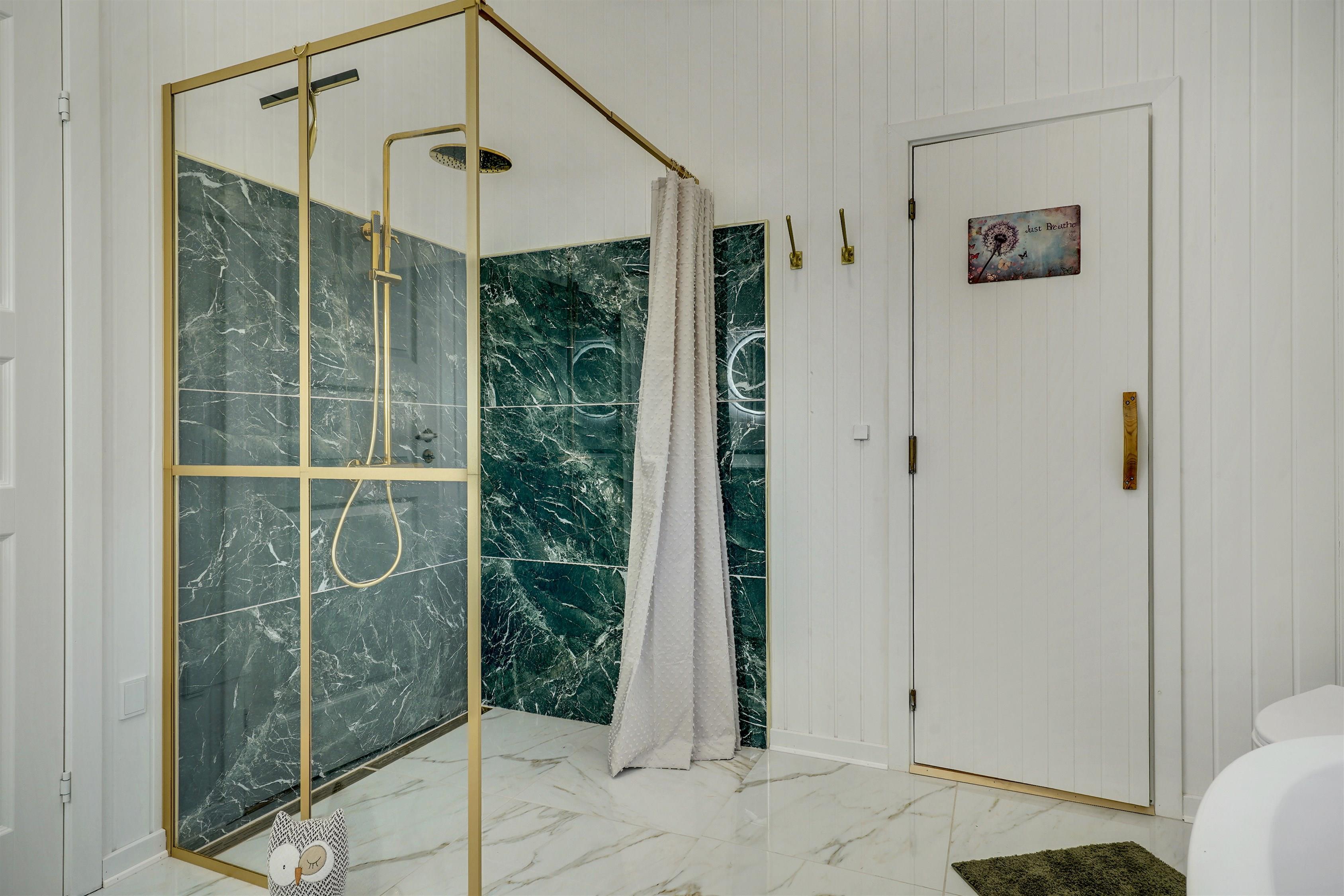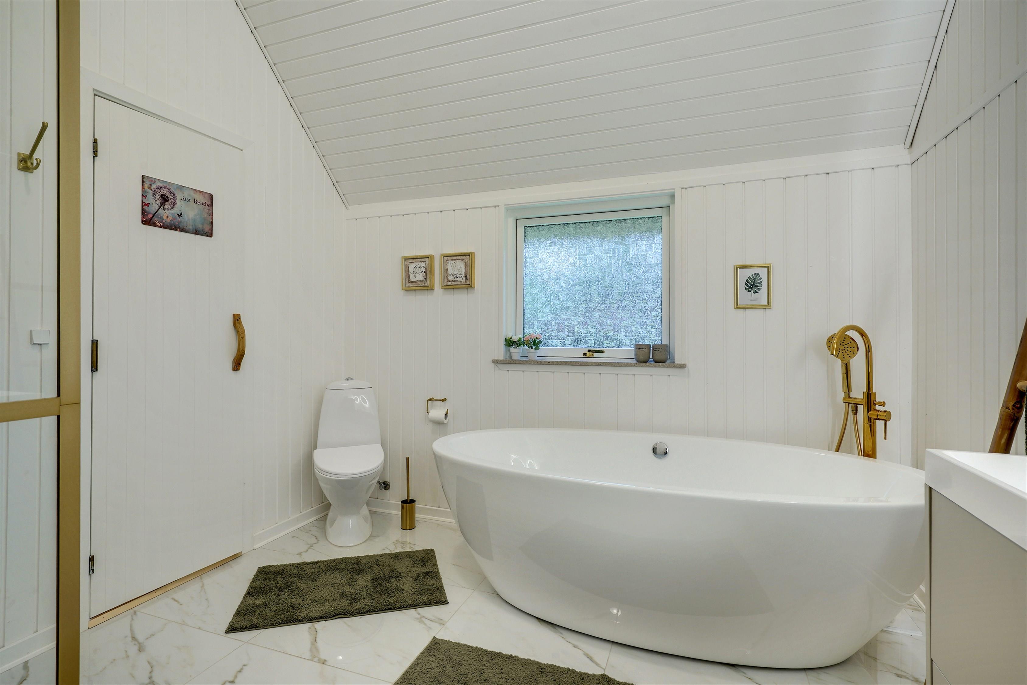 Badeværelse med gulvvarme, bruser og badekar.