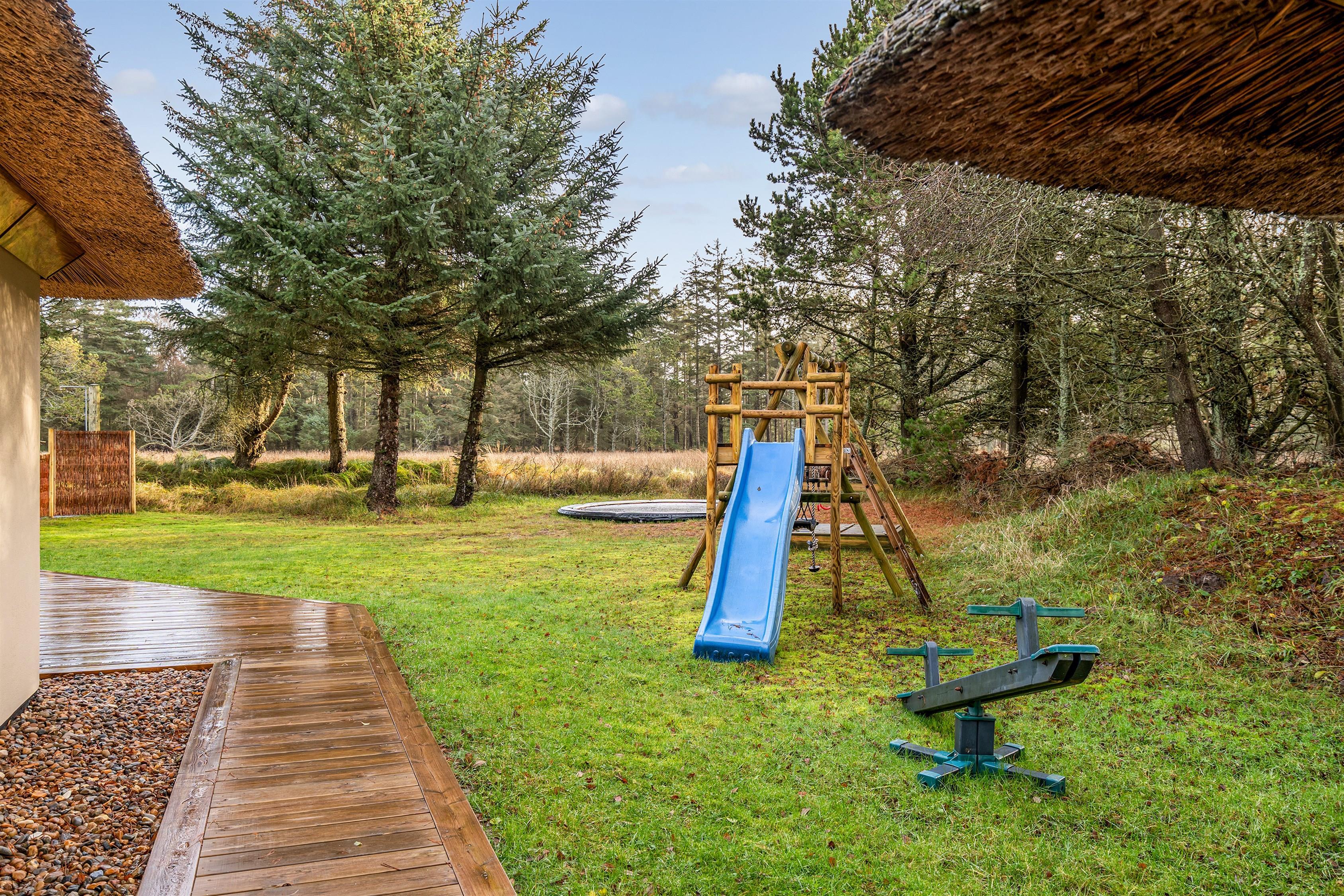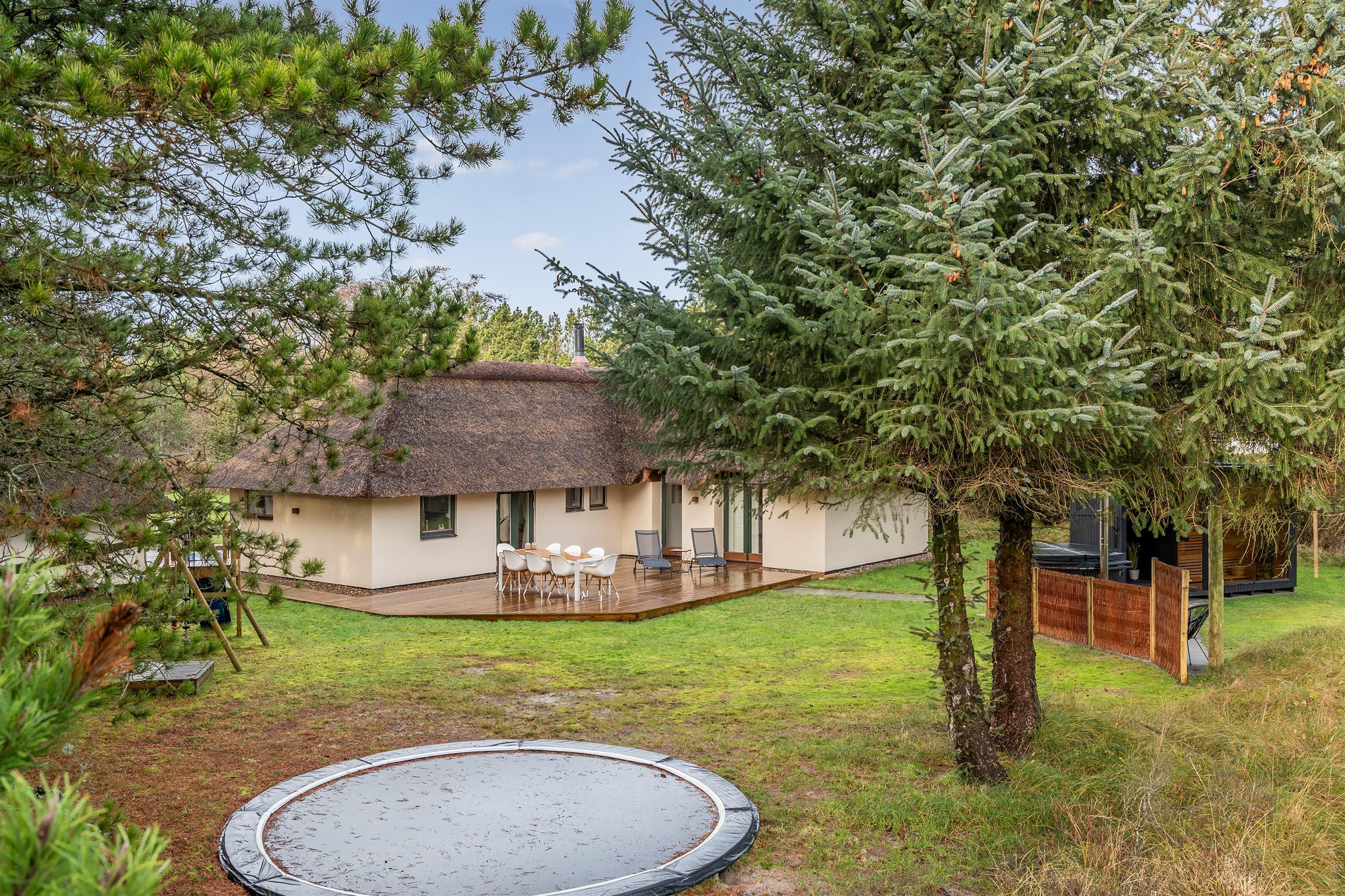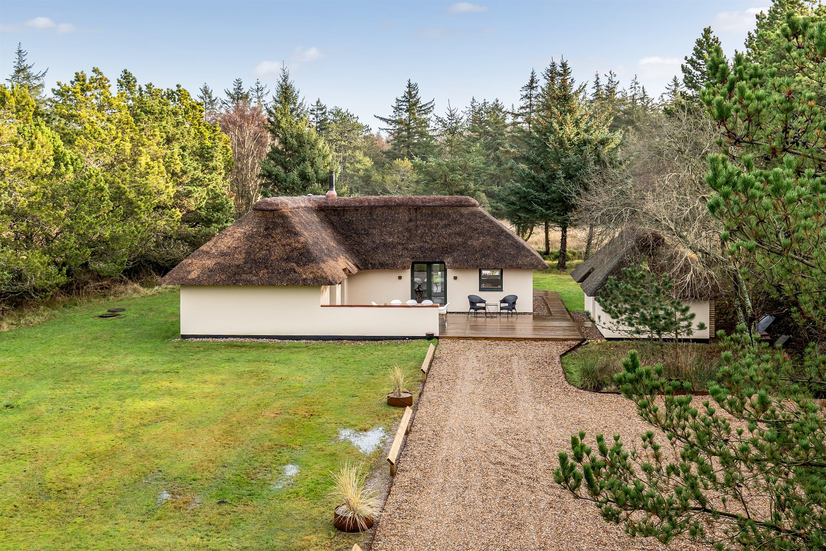 Udenfor fremstår huset i pudset sten med nyt stråtag og kobberinddækninger. Når vejret tillader det, giver de 2 træterrasser rige muligheder for at nyde såvel morgenmaden som aftensmaden udenfor. Den store græsplæne og legeredskaberne vil blive brugt flittigt af de yngste familiemedlemmer.