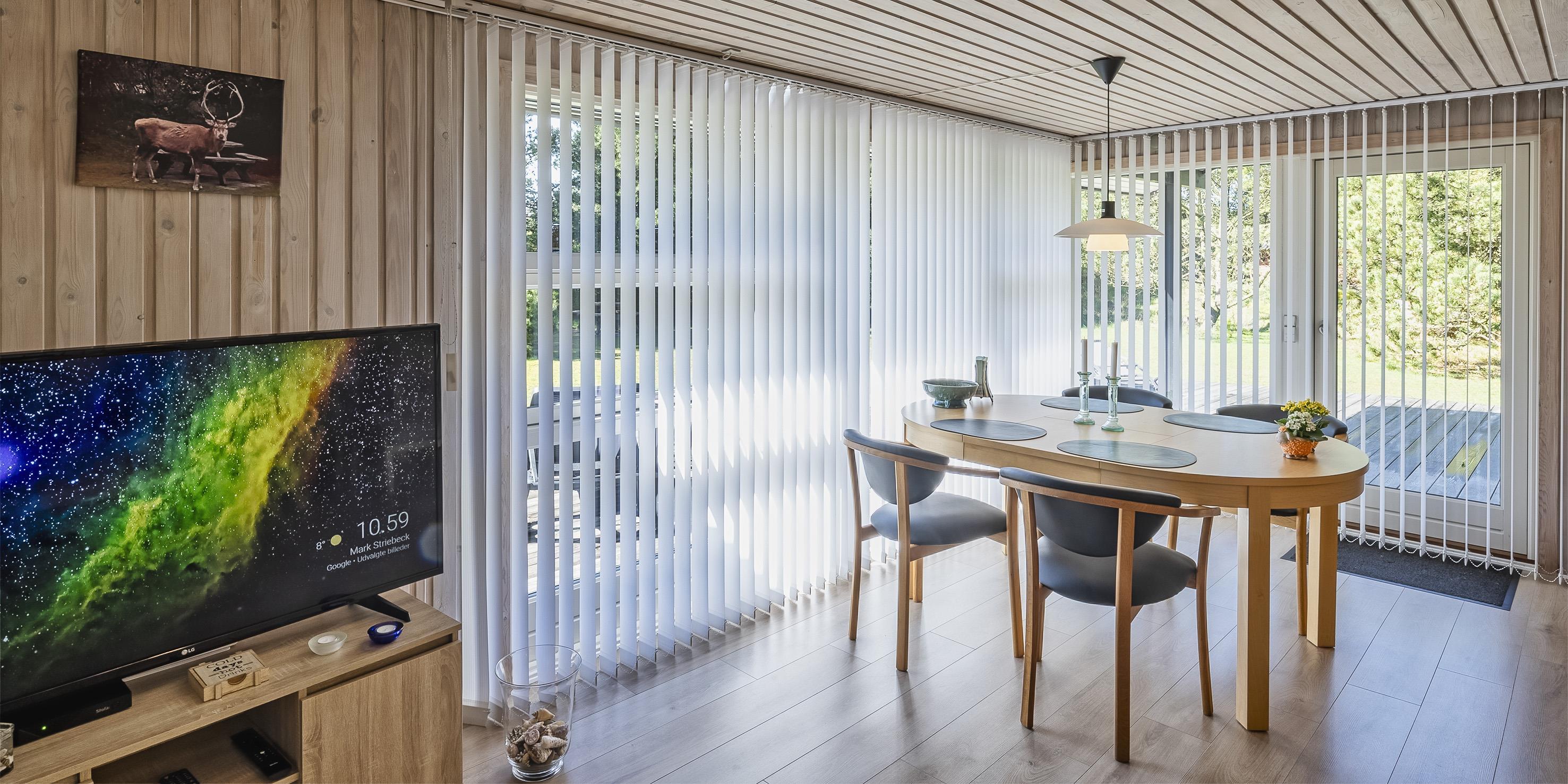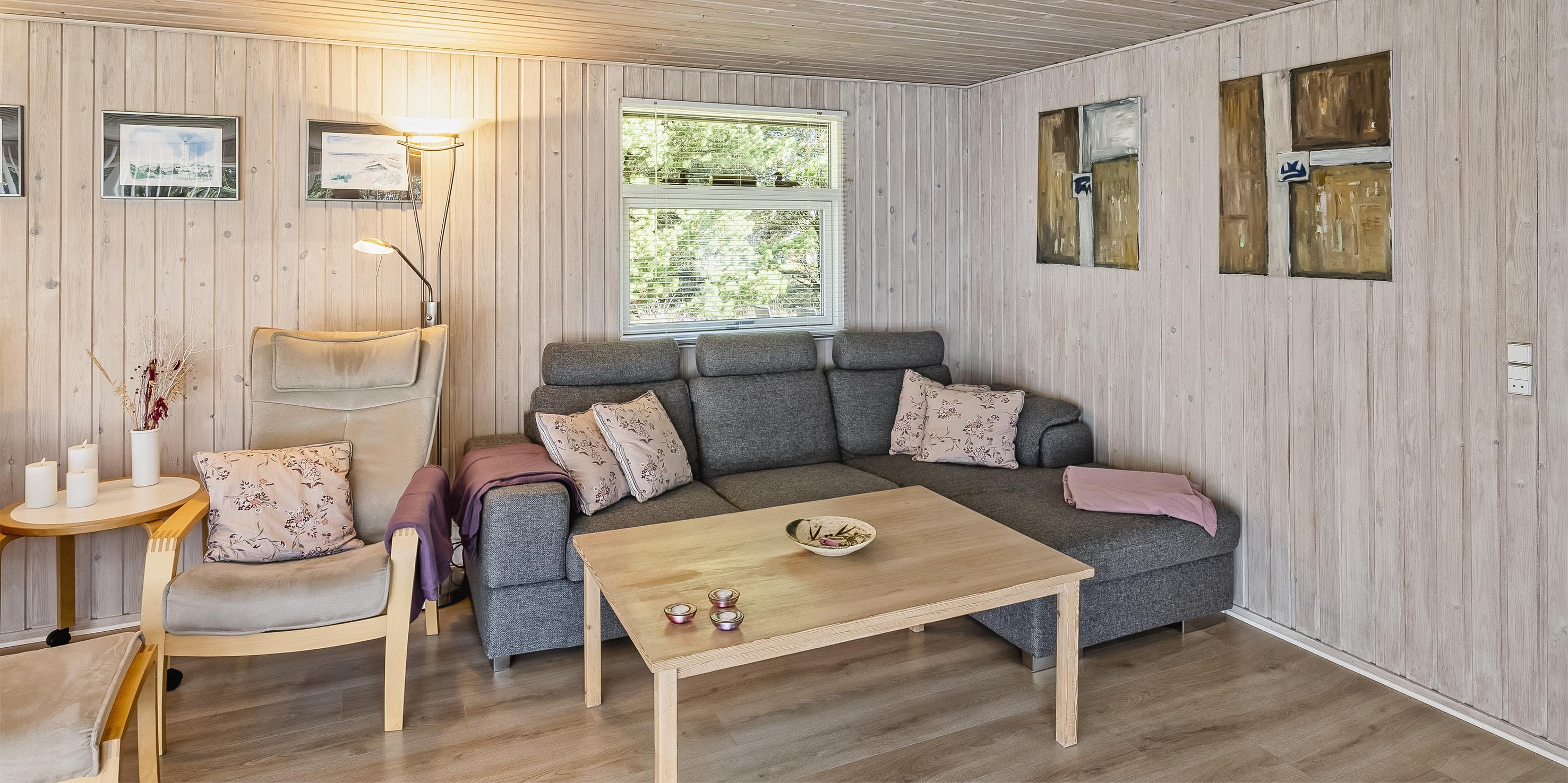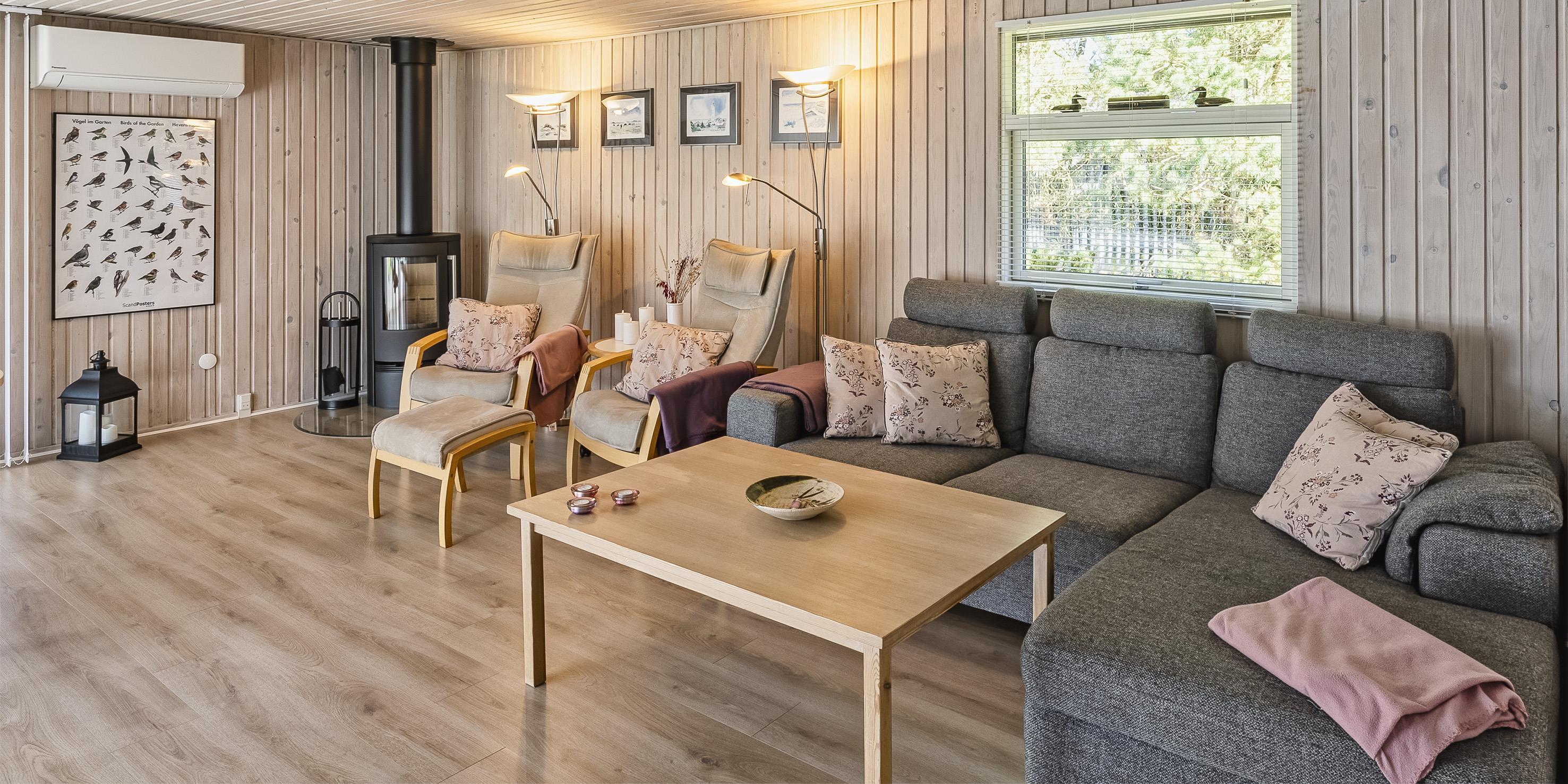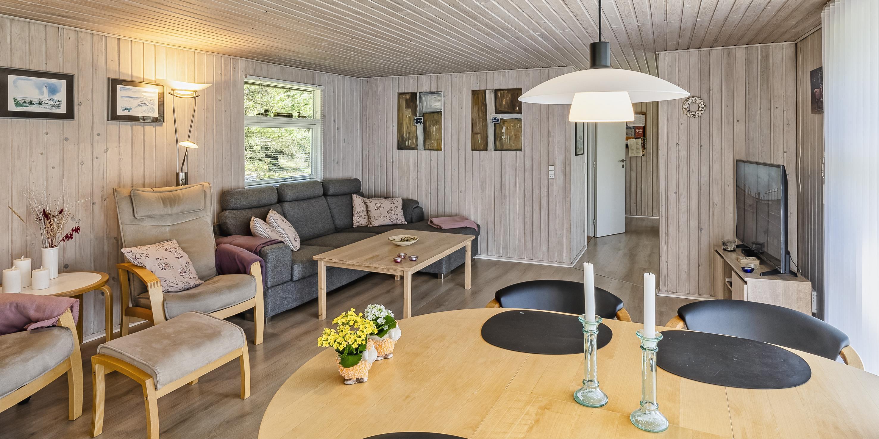 Huset indeholder: lille entré, nyere badeværelse, 2 soveværelser: DS + 2S, køkken og stue. Det ene soveværelse har to enkeltsenge og det andet en dobbeltseng med udgang til en lille ugeneret terrasse bagved huset. Badeværelse med bruseniche, toilet og håndvask med underskab samt gulvvarme. Åbent køkken med stort vinduesparti ud mod grunden. Køkken med opvaskemaskine, køleskab mned frysefag, mikroovn, bageovn og kogeplader. Spiseafdelingen ligger i forbindelse med stuen og med udsigt til brændeovnen og den skønne natur på grunden. Opholdsstuen er lys og venlig indrettet med stort vinduesparti og udgang til den store træ terrasse. Stuen er med sofagruppe, brændeovn, trådløst internet, smart-tv, Stofa sommerhuspakke og Google Chrome Cast, og tyske kanaler over parabol. Huset råder over en varmepumpe, som er monteret i stuen. Med denne energibesparende varmepumpe kan el-omkostningerne reduceres. Udgang til stor ugeneret delvis overdækket træterrasse fra opholdsstuen. Bagved huset ligger en mindre terrasse. Grunden er udlagt i græs, der giver rig mulighed for at boldspil og leg samt gode muligheder for at få besøg af kronvildt. Rygning er ikke tilladt i huset. Da er en vaskemakine til rådighed. Der er tilladt en lille hund. Byggeår 1977 og renoveret i 2005.