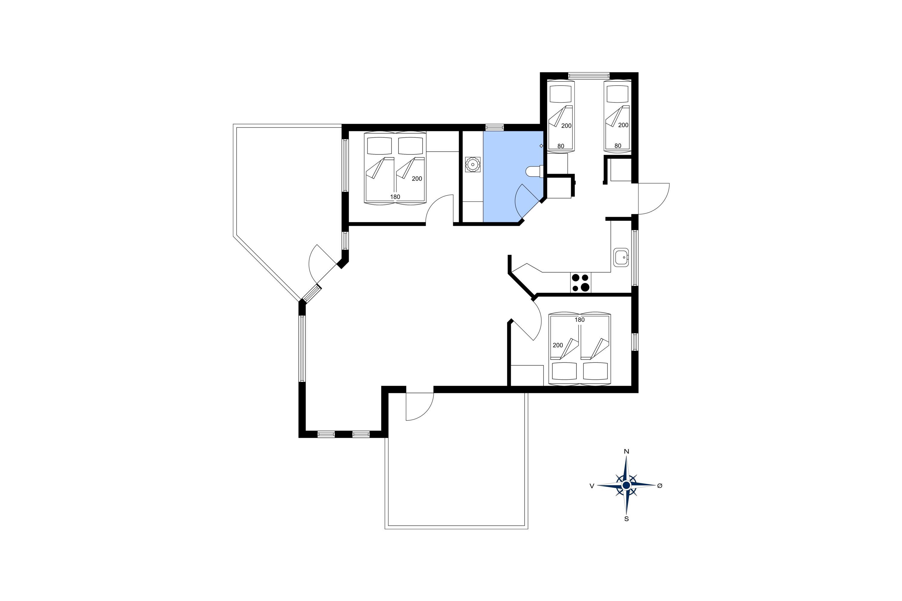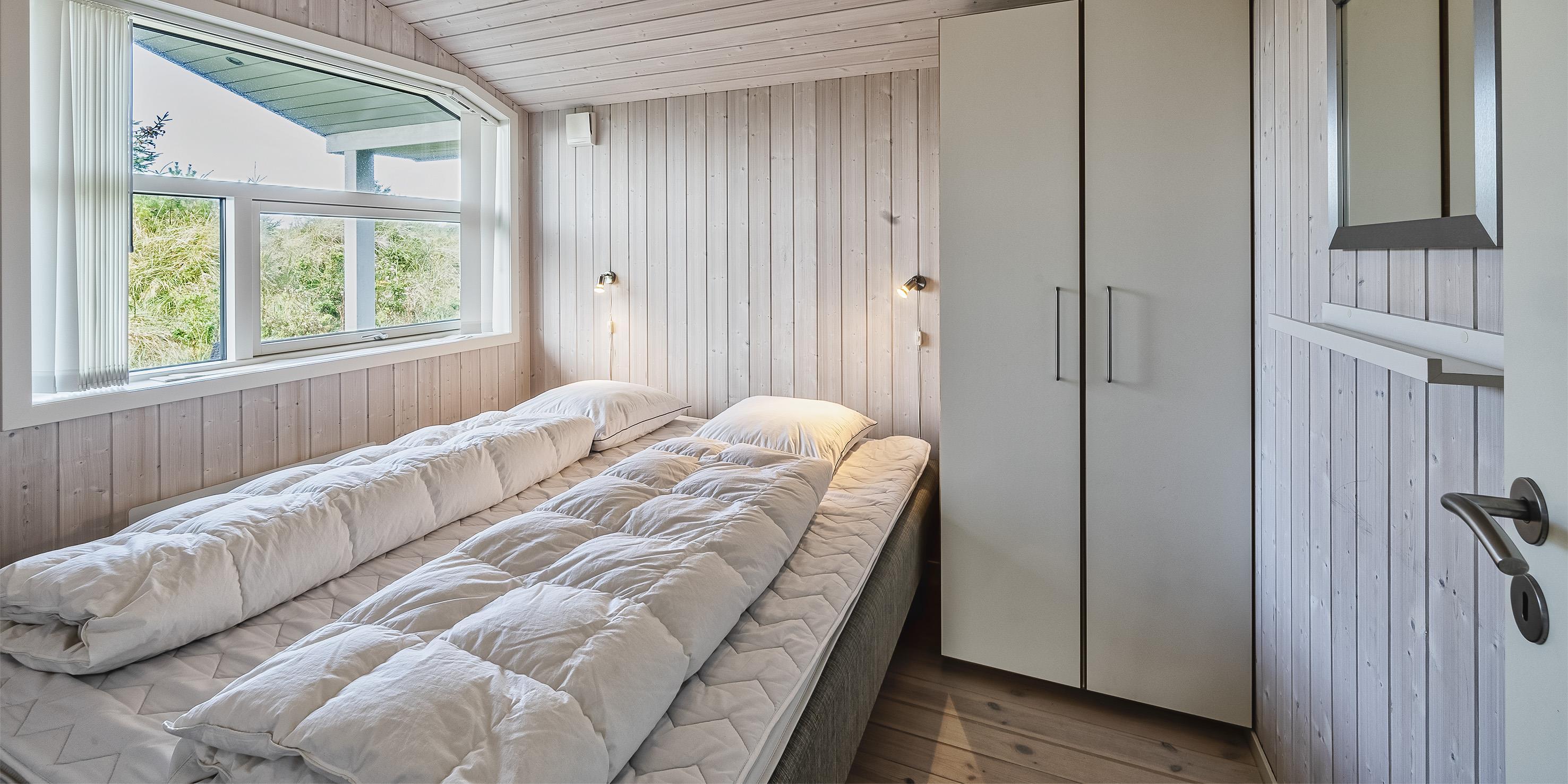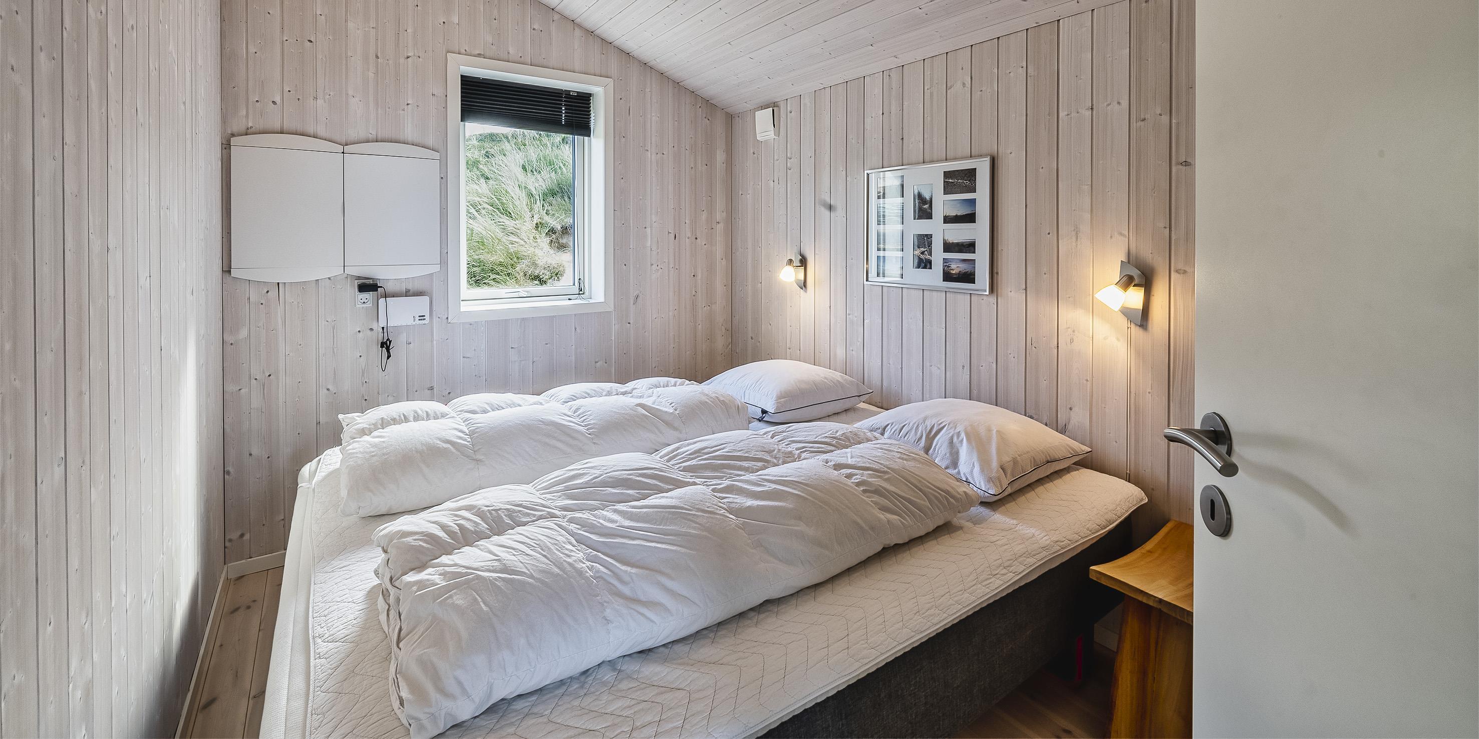 3 soveværelser. 2 med dobbeltseng 180x200 cm. 1 med 2 enkeltsenge (á 90x200 cm)