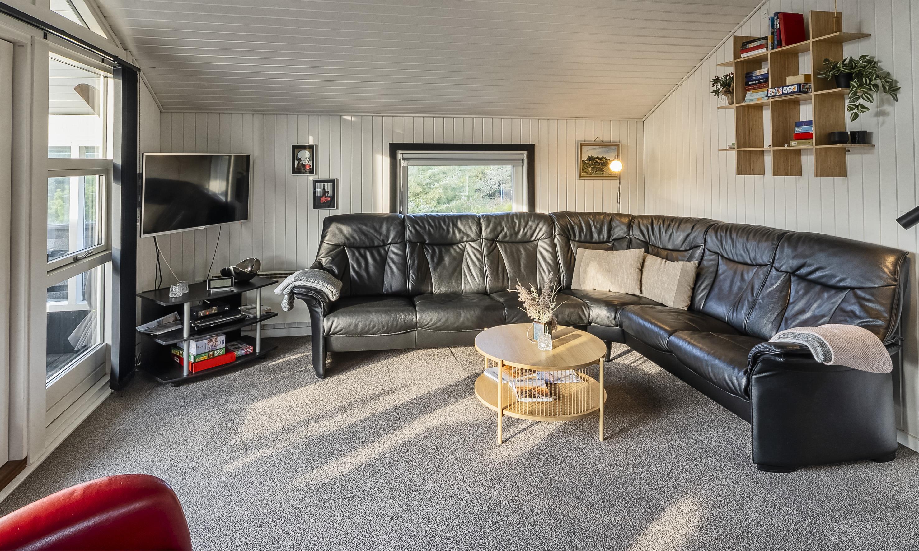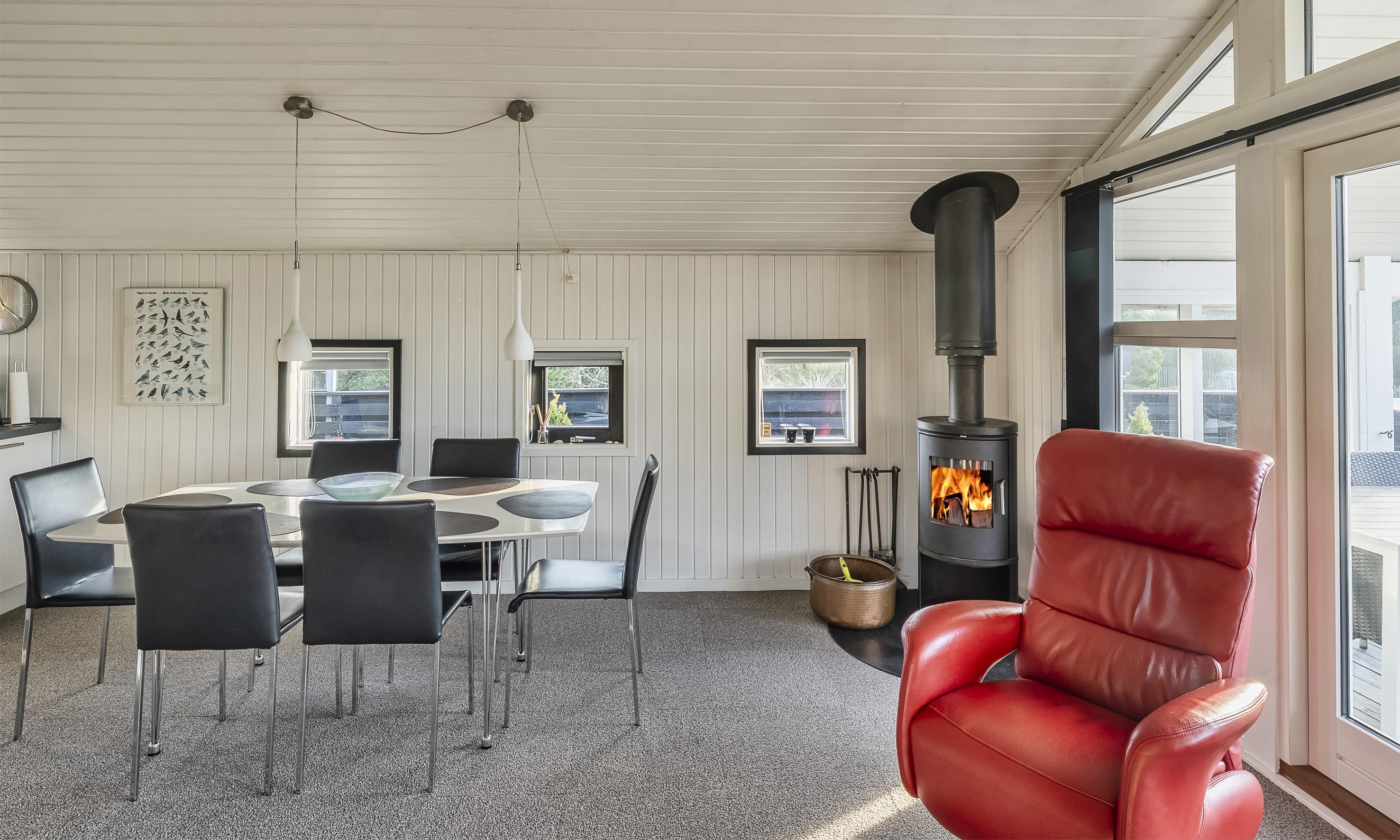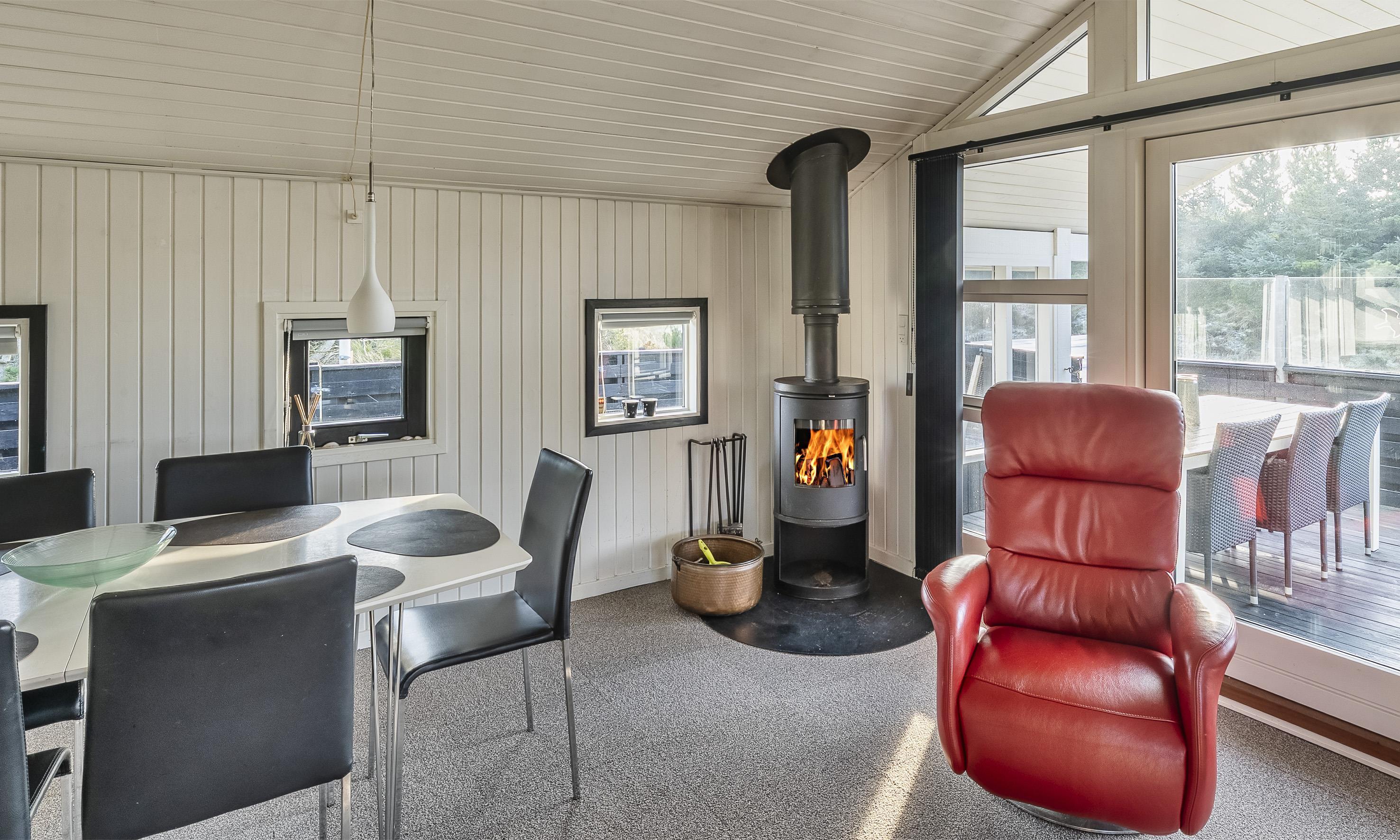 Sommerhuset er skabt til hygge, ro og samvær. Træd indenfor i den varme og indbydende stue, hvor en knitrende brændeovn sørger for hyggelige aftener, mens store vinduespartier lukker dagslyset og naturen helt ind.