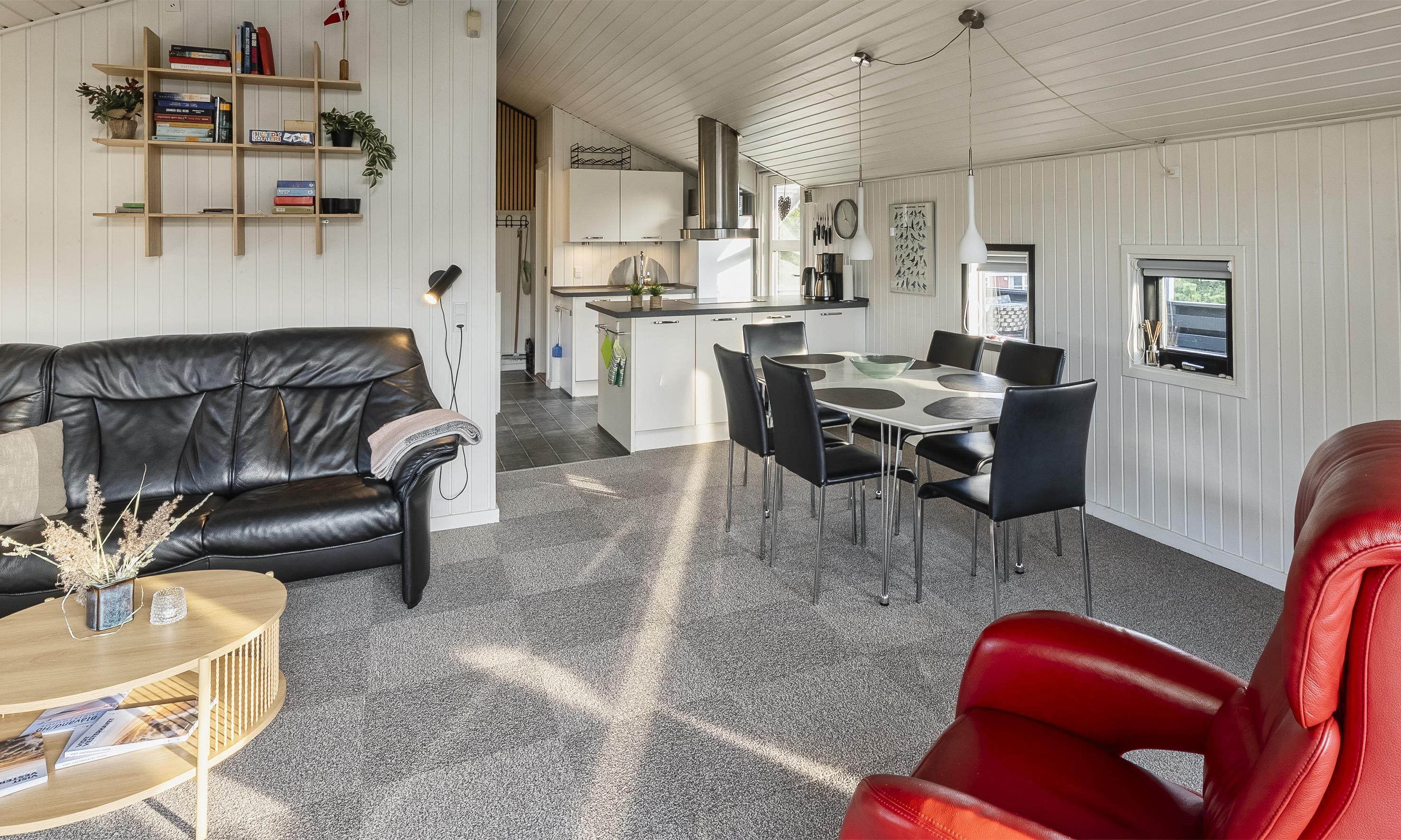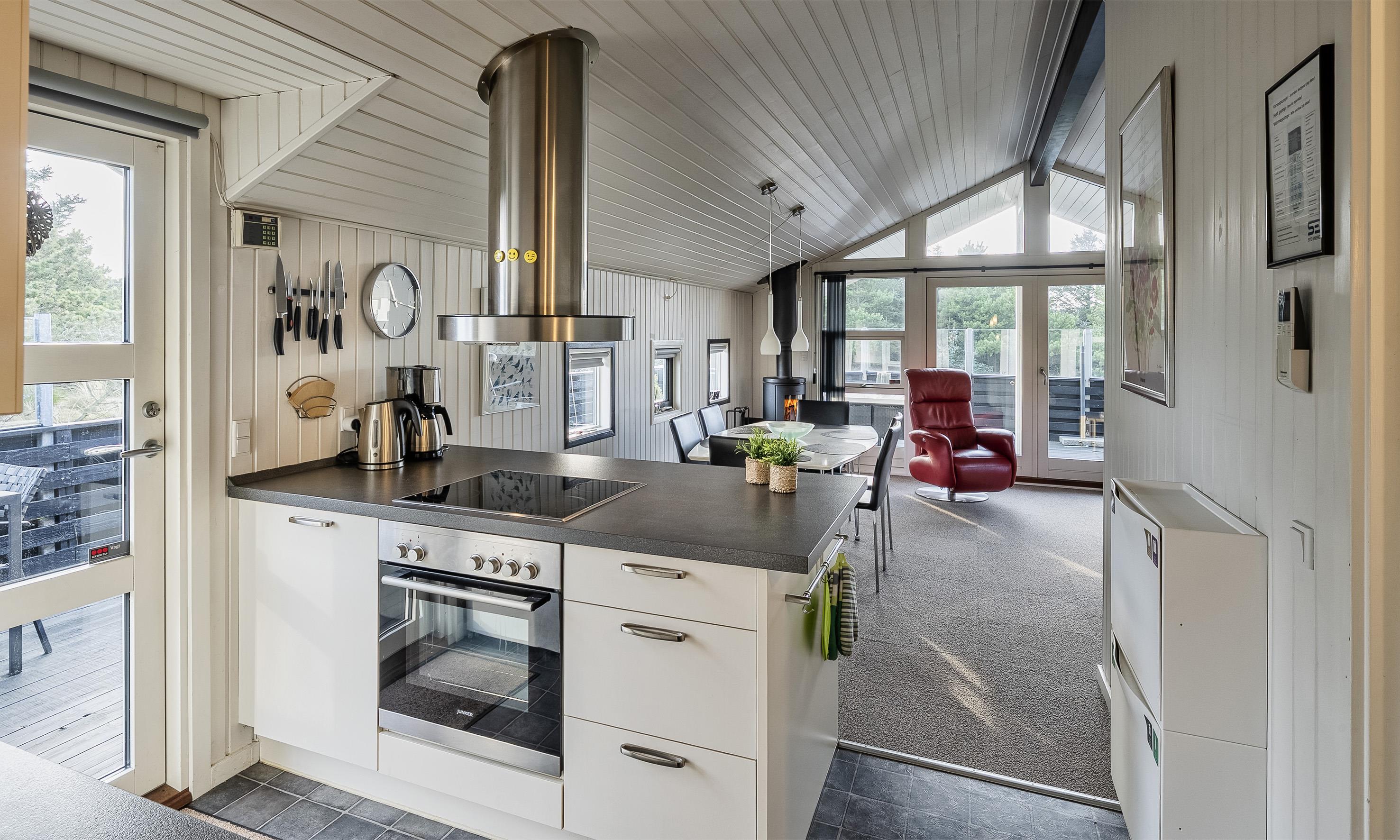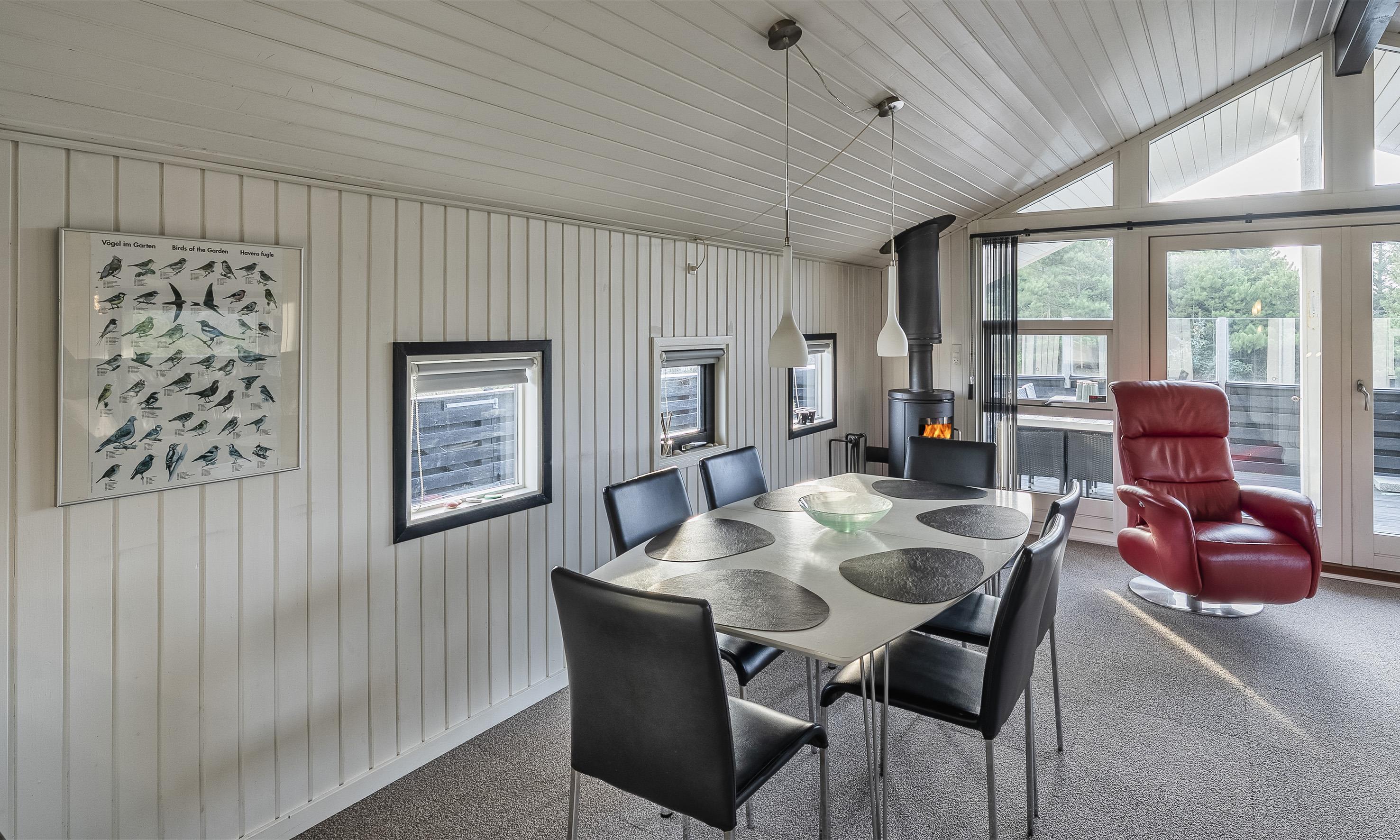 Sommerhuset er skabt til hygge, ro og samvær. Træd indenfor i den varme og indbydende stue, hvor en knitrende brændeovn sørger for hyggelige aftener, mens store vinduespartier lukker dagslyset og naturen helt ind.