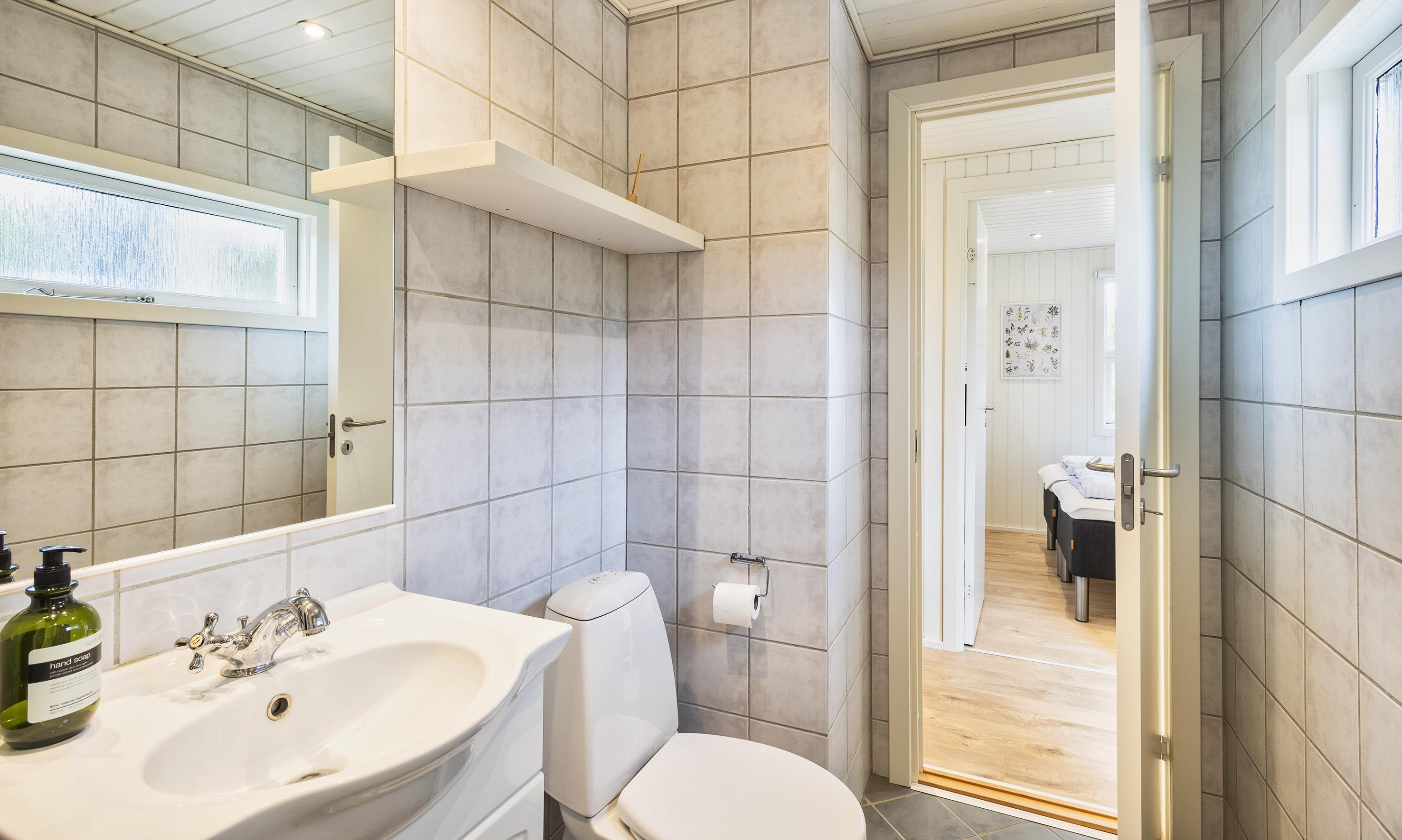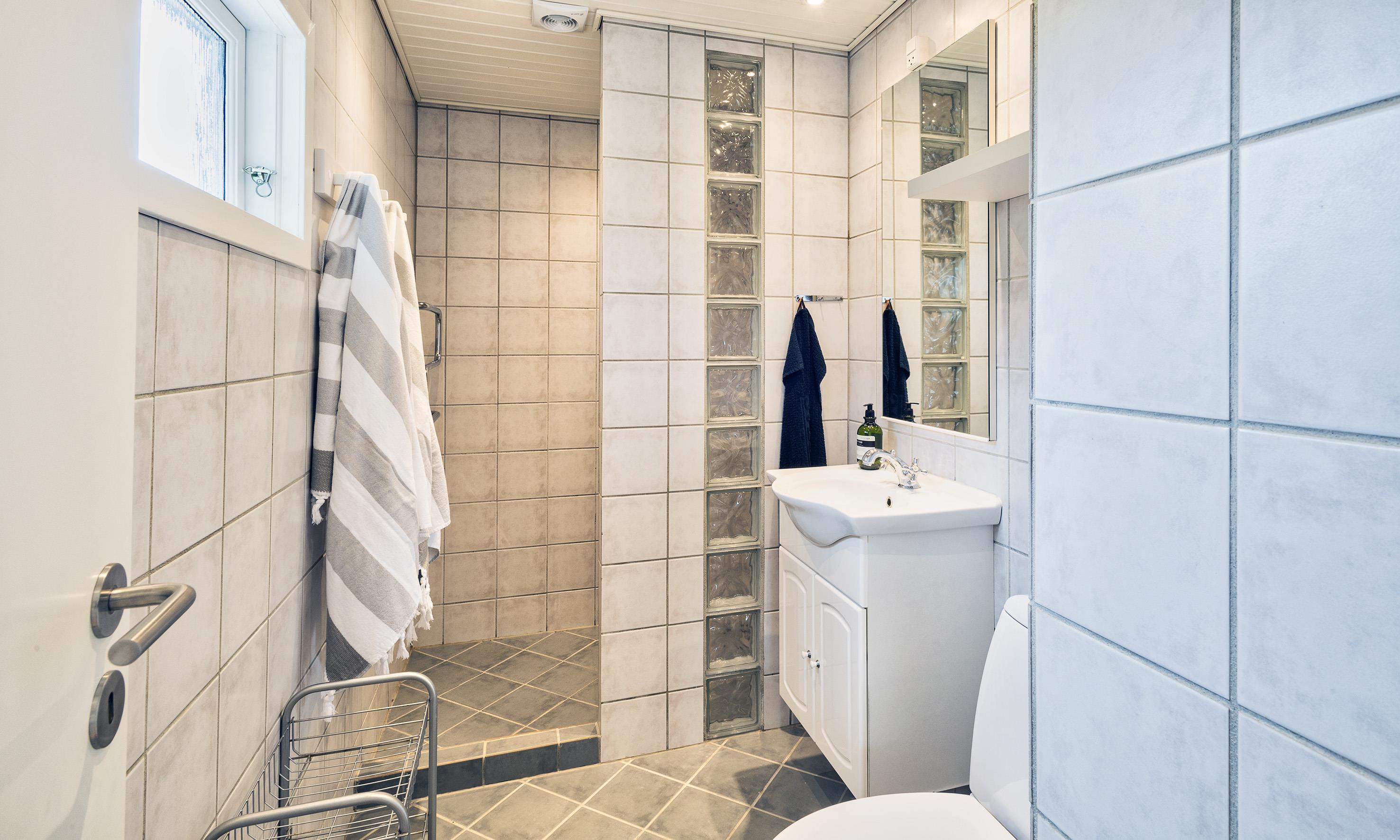 Bad med toilet, bruser og vask