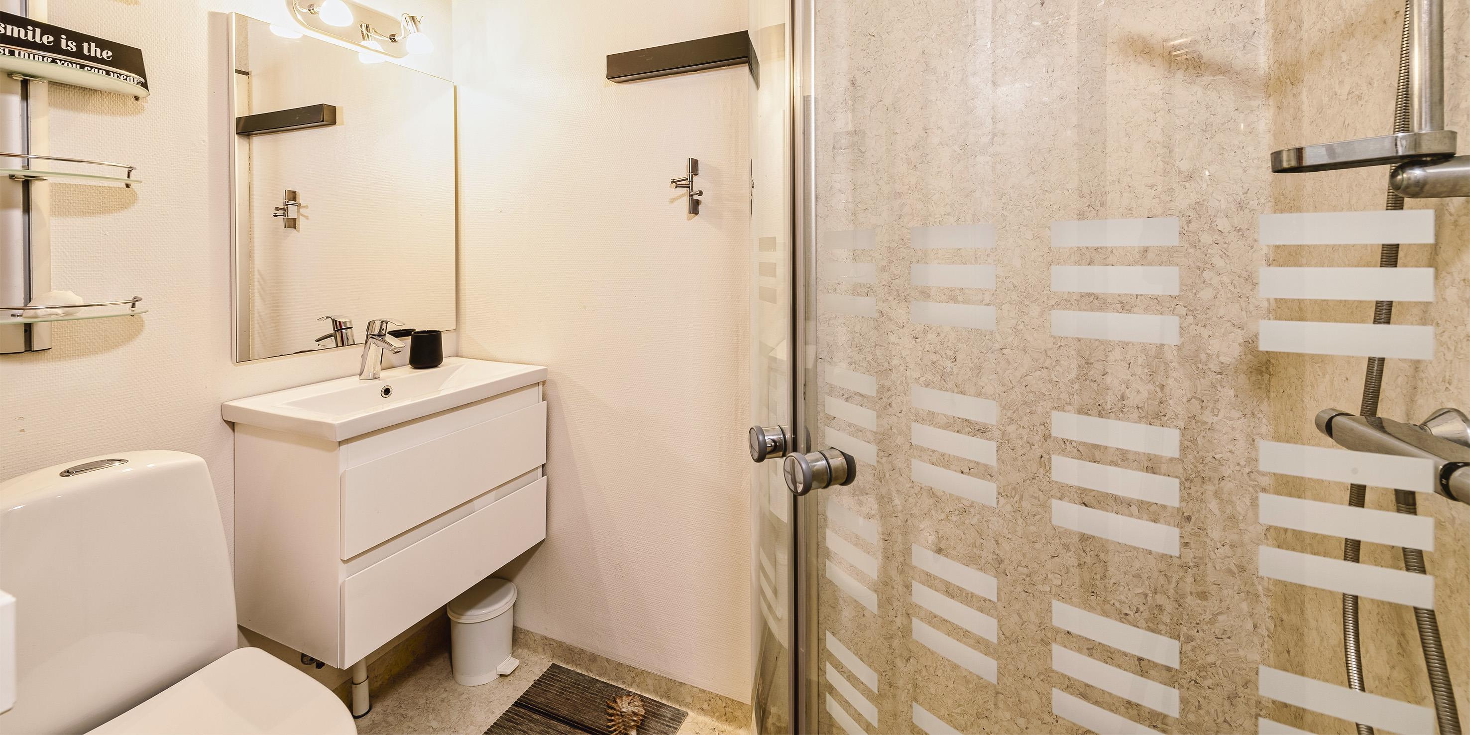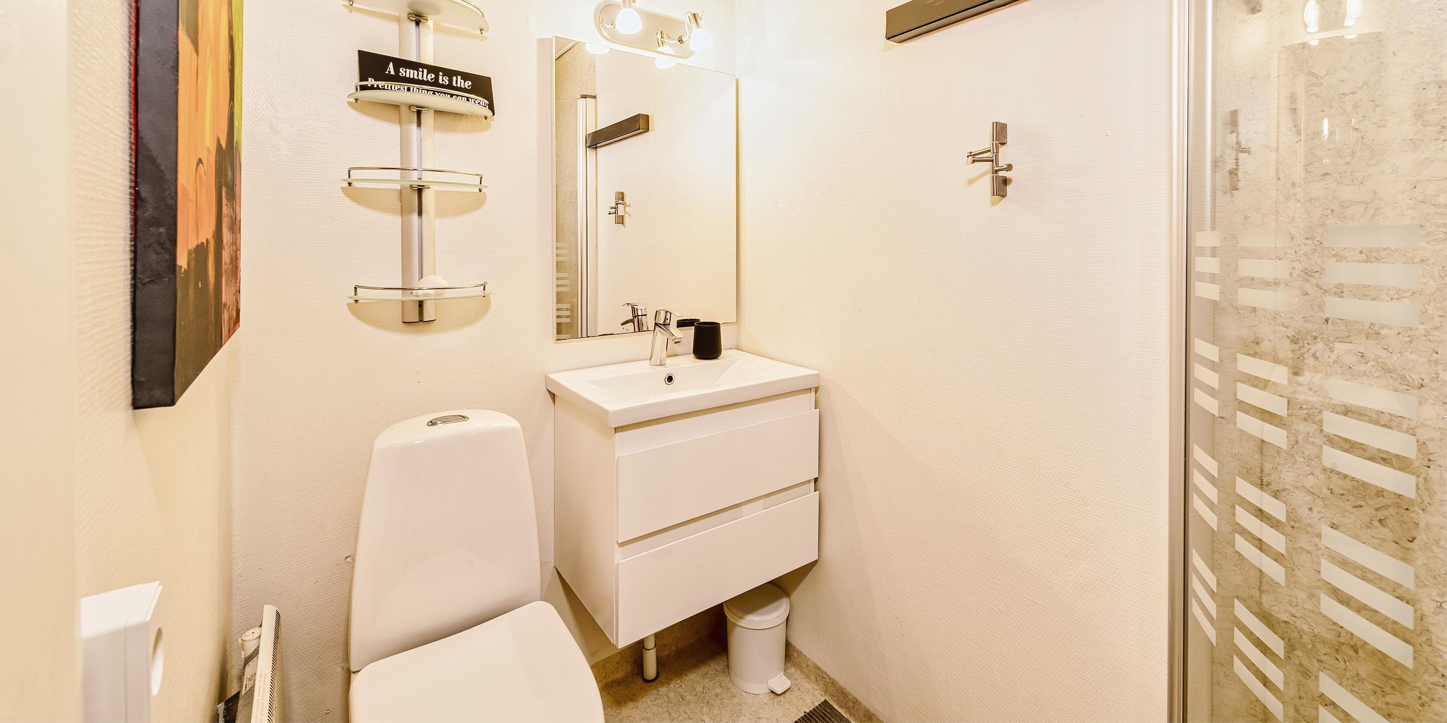 Bad med toilet, bruser og vask