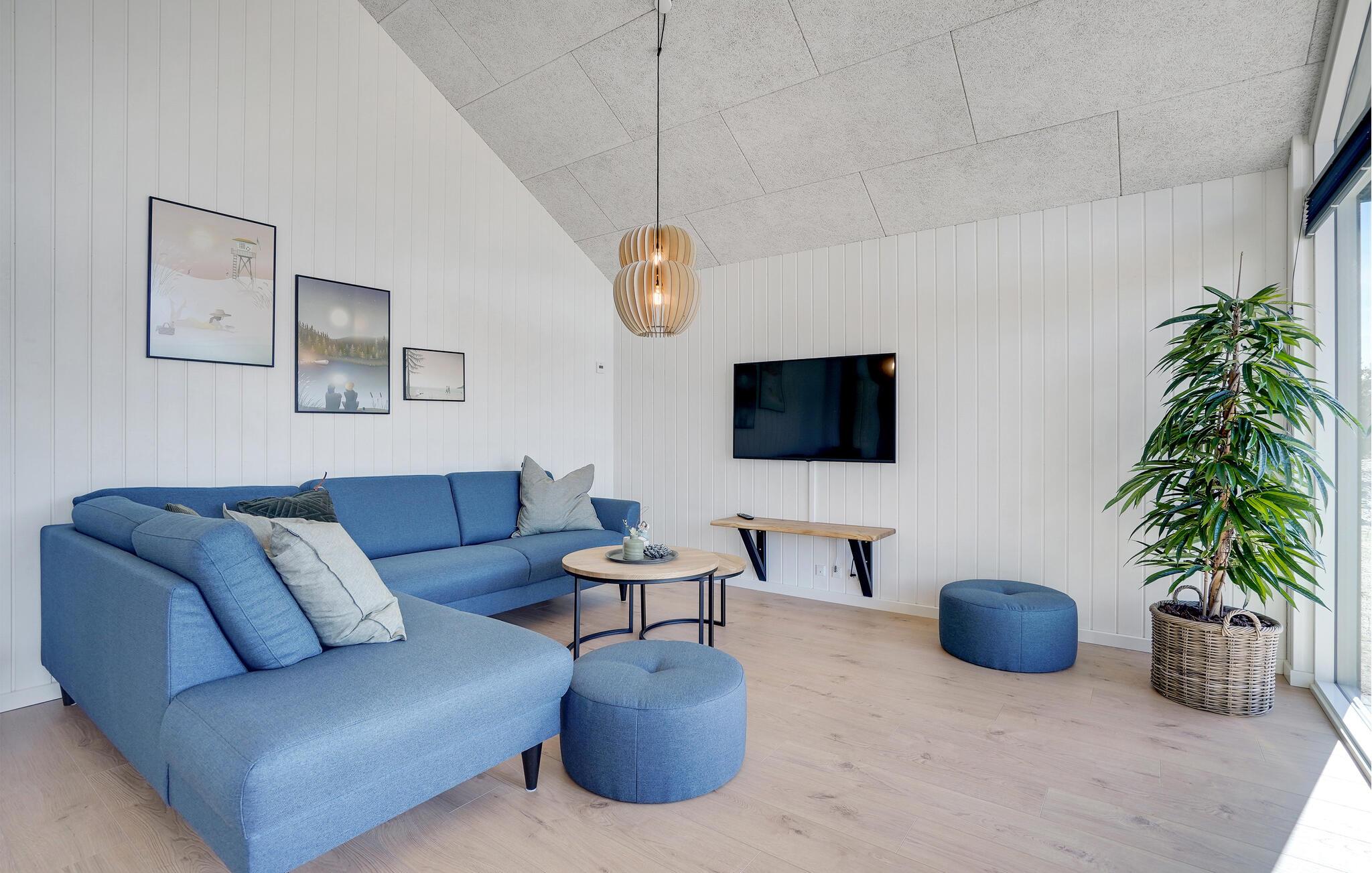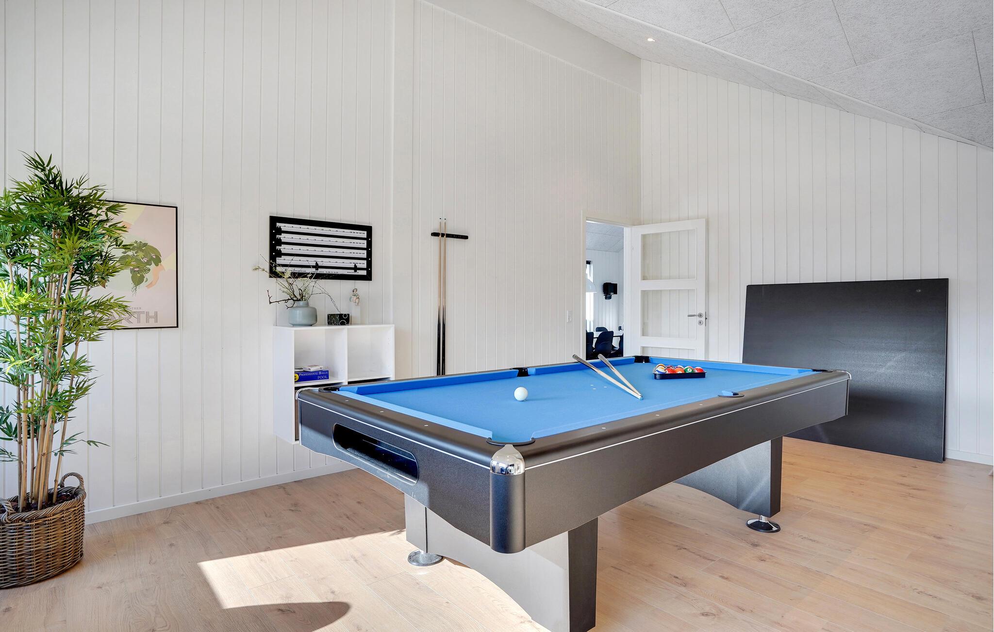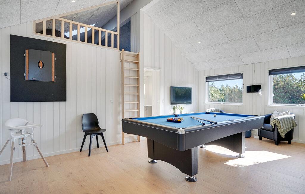 Det indre af dette sommerhus byder jer velkommen med et moderne design og rummelige, lyse værelser. Føl jer godt tilpas i den smagfuldt indrettede stue med en god film, spil billard eller dart og forkæl jer selv med afslappende timer i den indendørs pool eller sauna. Tilbered kulinariske delikatesser sammen i køkkenet af høj kvalitet.