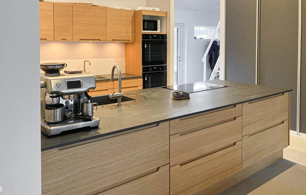 Det åbne opholds- og spiseområde virker indbydende, og store vinduer giver udsigt til det omkringliggende landskab. Tag plads i de komfortable siddemøbler, og tilbring rolige aftener med en god film eller hyggesnakke. Tilbered måltider i kvalitetskøkkenet med store arbejdsflader. Saml jer omkring det lange spisebord, og nyd hyggelige stunder sammen. Svøm baner i poolen, og lad børnene prøve vandrutsjebanen. Slap derefter af i spabadet, eller udfordr hinanden i et spil billard eller dart.