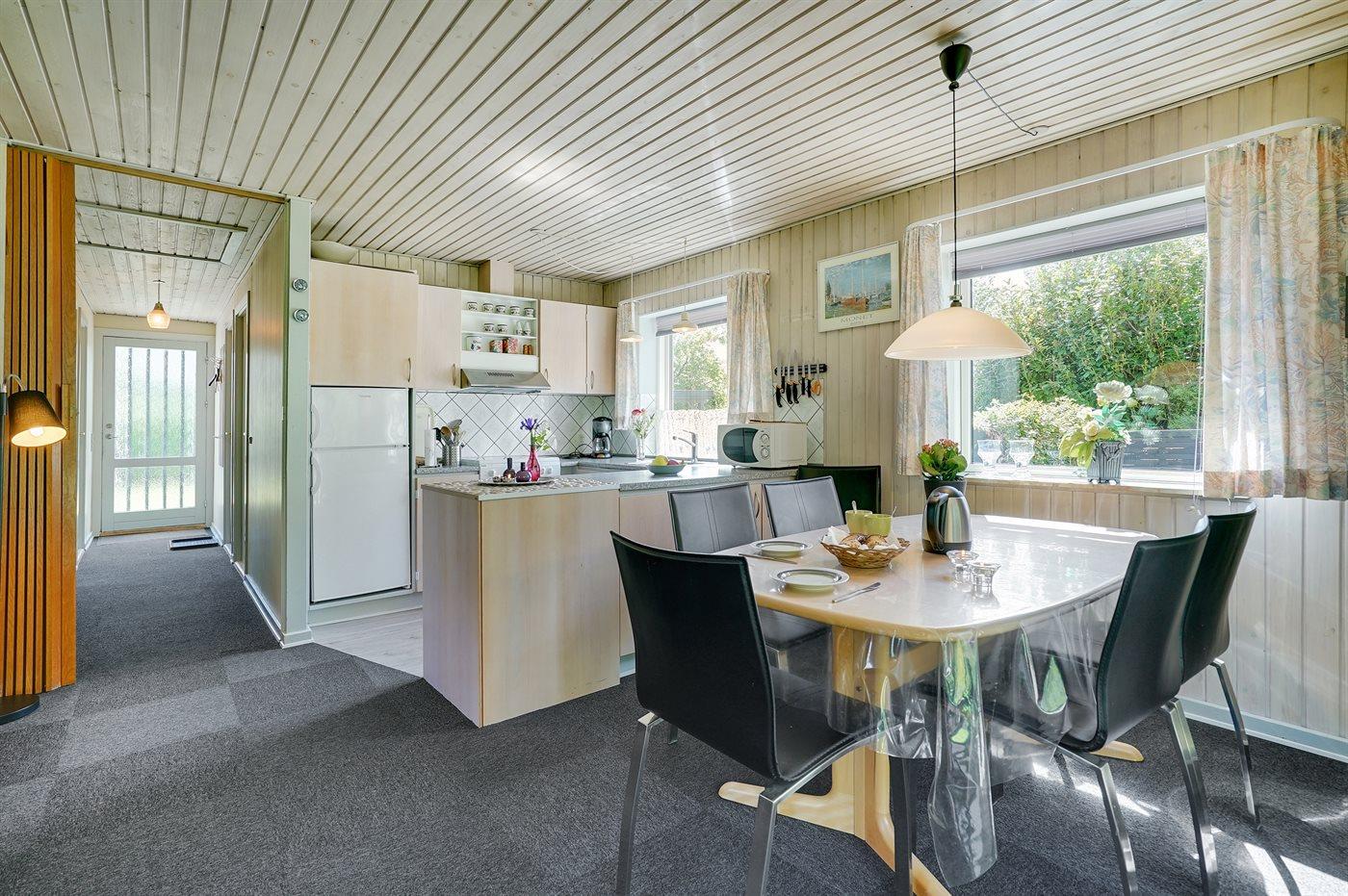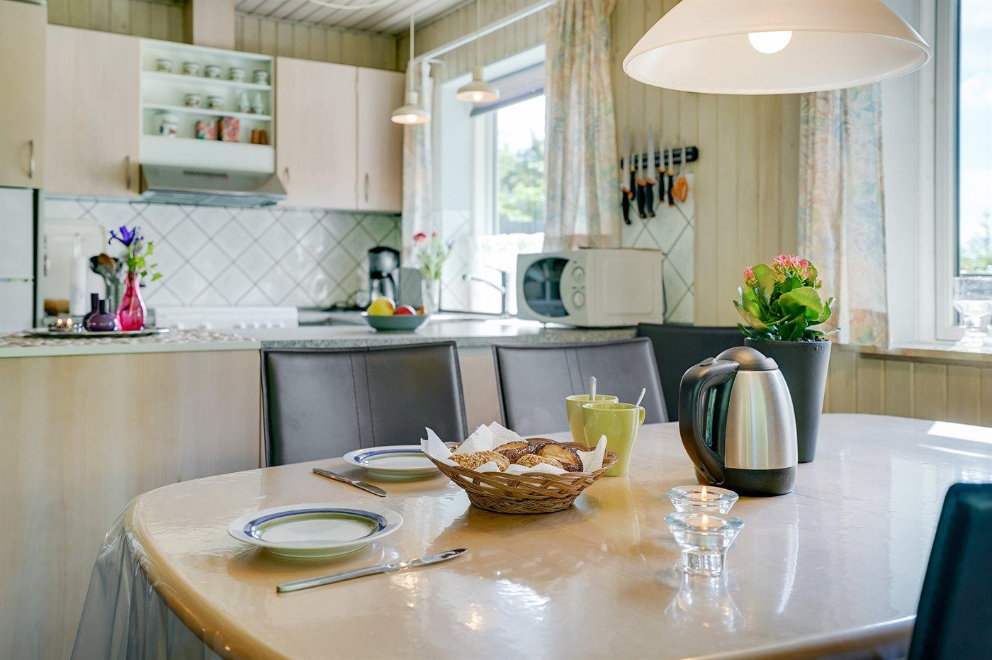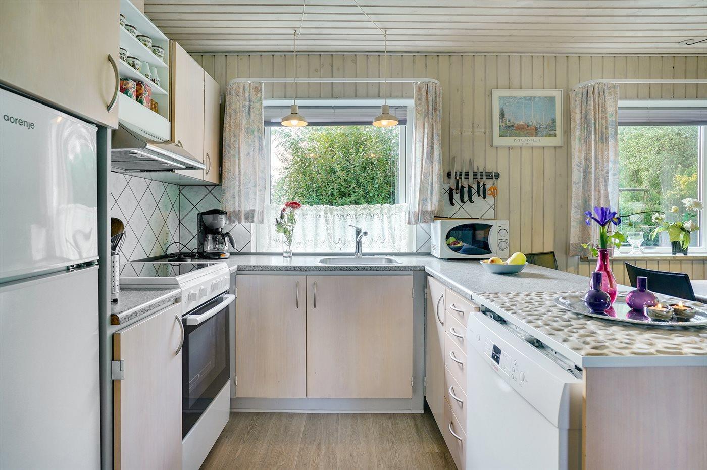 Køkkenet er udstyret med 1 køleskab. Der er 4 elkogeplader, bageovn, mikrobølgeovn samt opvaskemaskine.