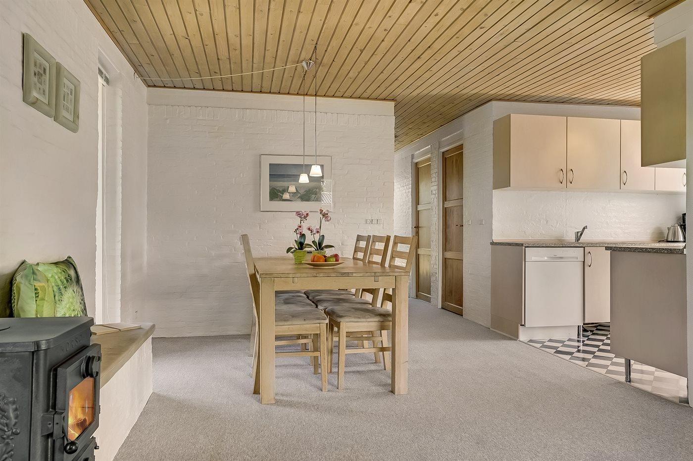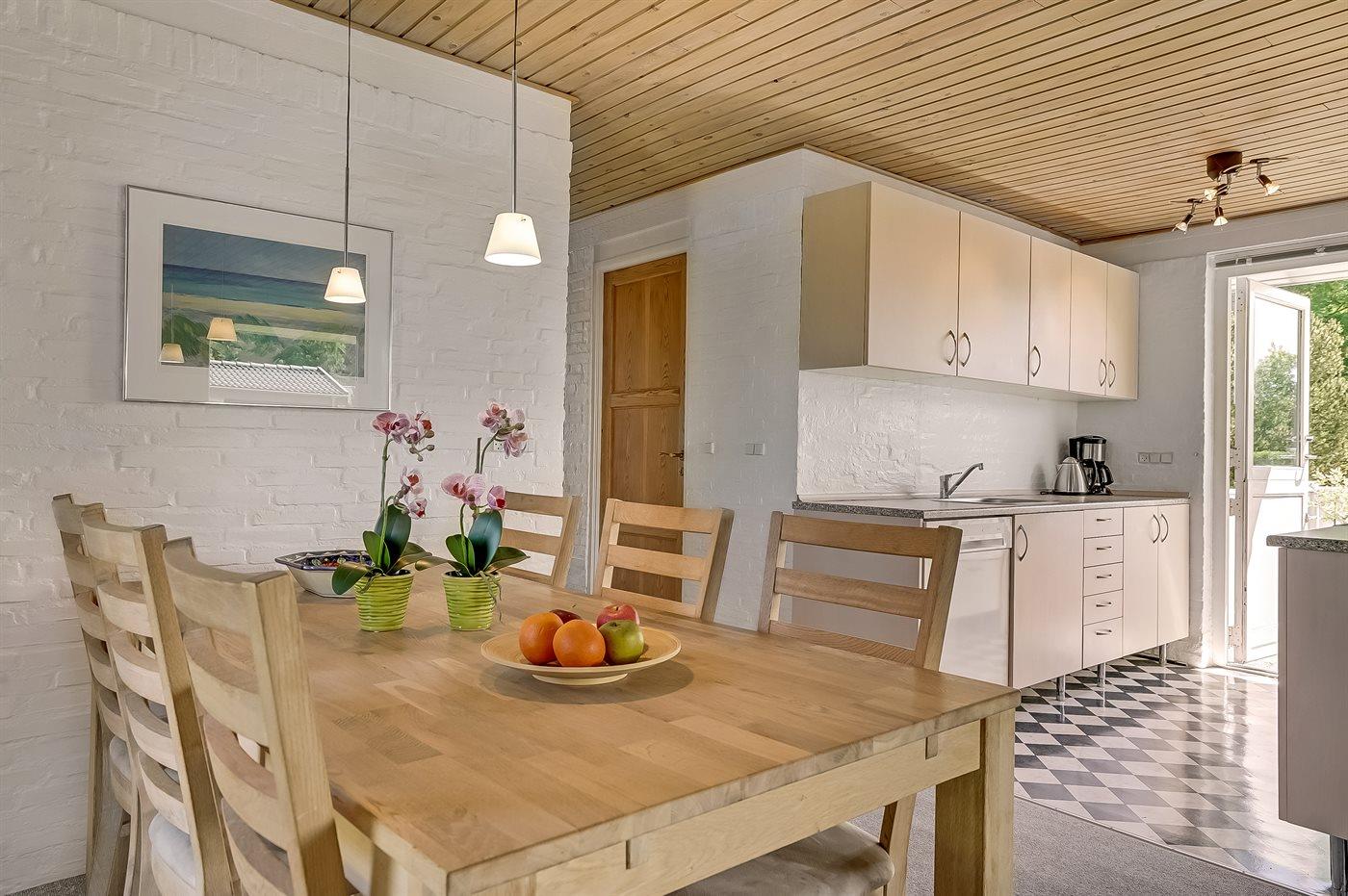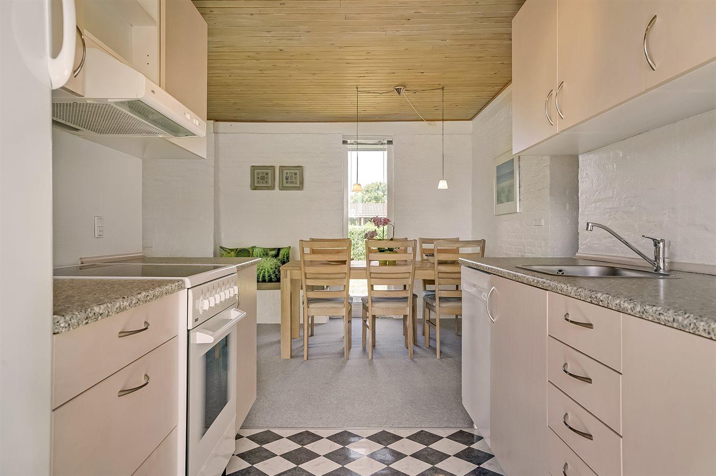 Køkkenet er udstyret med 1 køleskab. Der er 4 elkogeplader, bageovn samt opvaskemaskine.