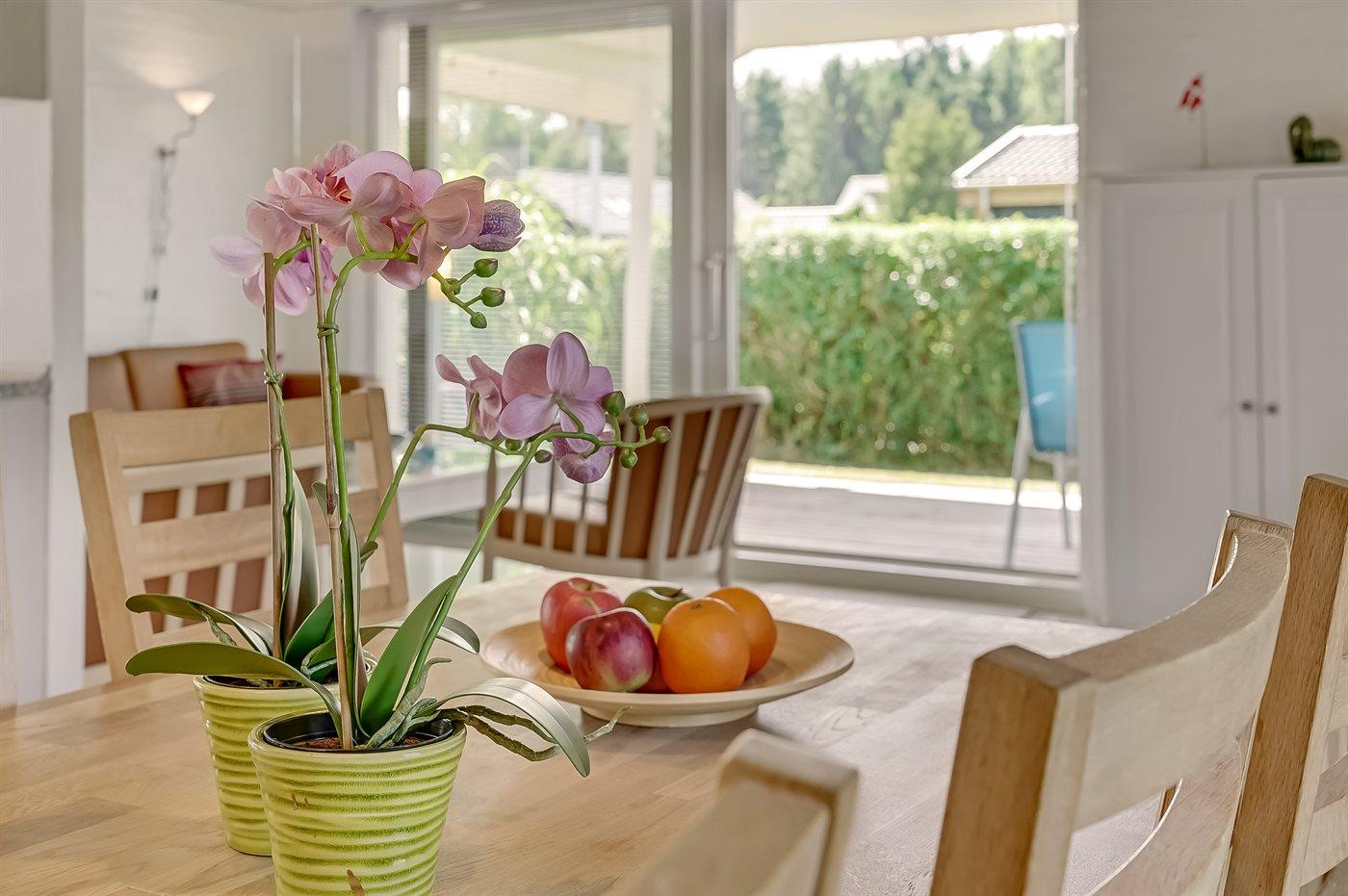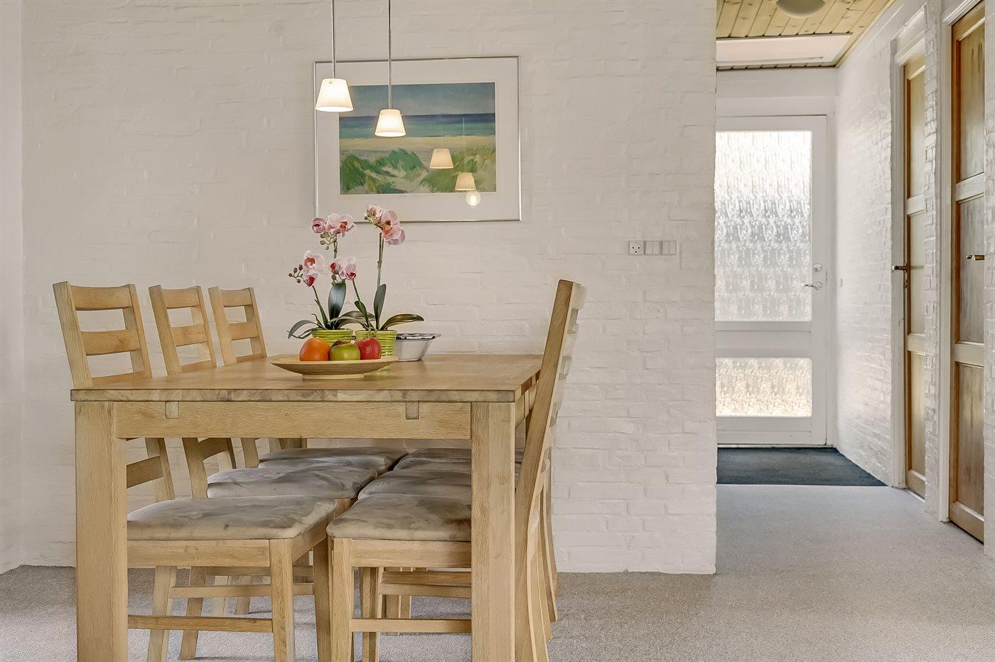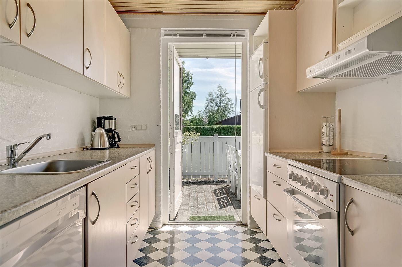 Køkkenet er udstyret med 1 køleskab. Der er 4 elkogeplader, bageovn samt opvaskemaskine.