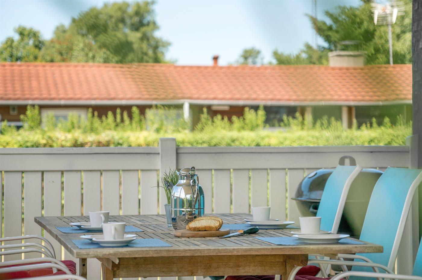 Ferieboligen er beliggende på en 890 m² stor havegrund. Der er 300 m til havet. Nærmeste forretning er beliggende i en afstand af 300 m. Der er en golfbane i en afstand af 8000 m. Til ferieboligen hører 30 m² terrasseareal. Desuden er der 20 m² overdækket terrasse. På lune aftener sørger en udendørs pejs for hyggelig stemning. Grill til rådighed. Parkering ved ferieboligen.