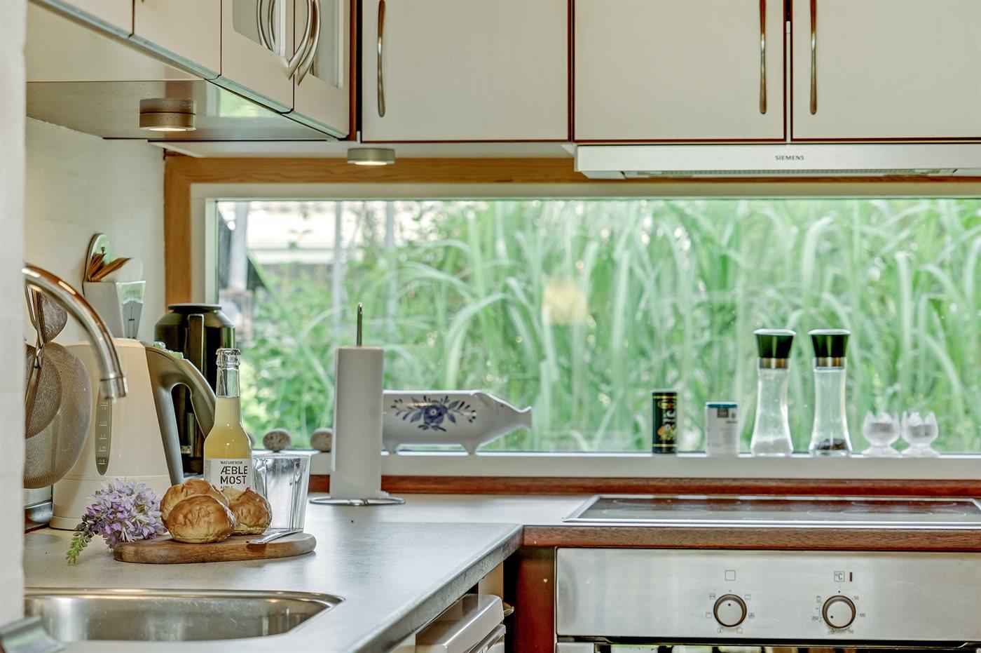 Køkkenet er udstyret med 1 køleskab. Der er 4 keramiske kogeplader, varmluftovn.