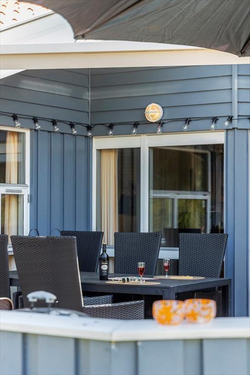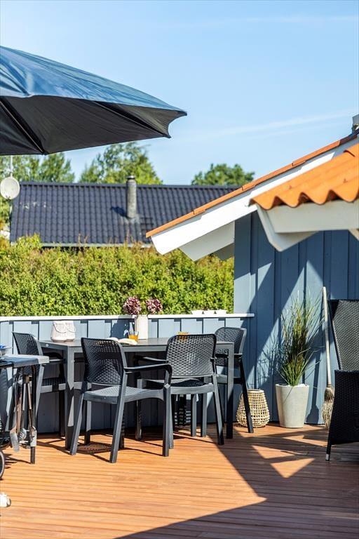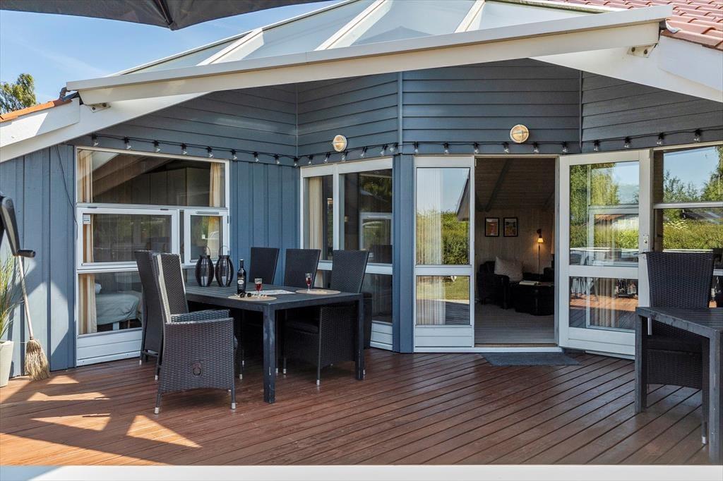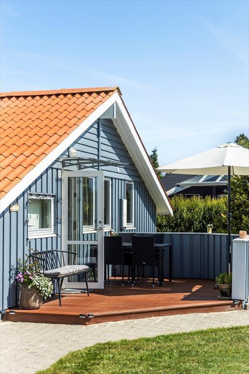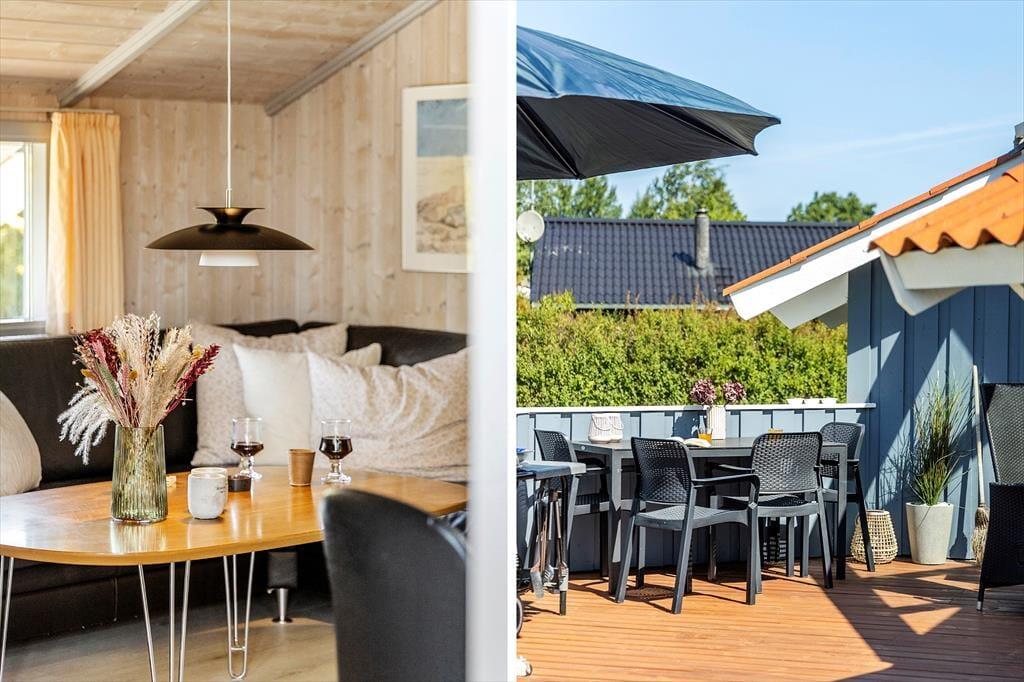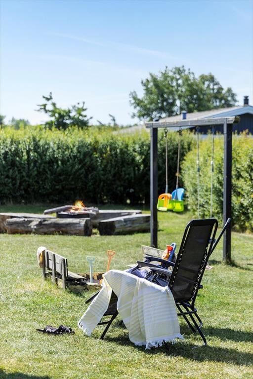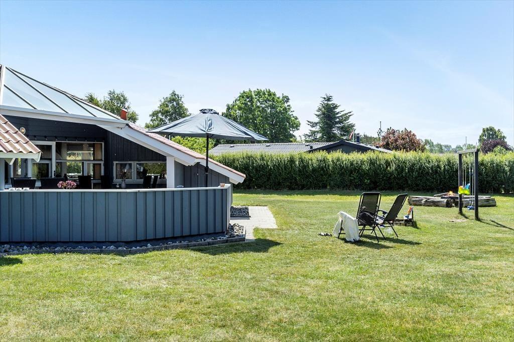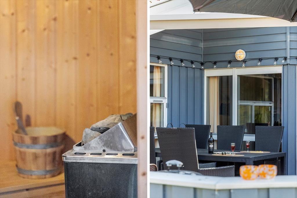 Udenfor venter en stor, velplejet græsplæne, der indbyder til afslapning og leg. Her kan du tage børnene med ud til bålstedet for at riste skumfiduser eller nyde en rolig eftermiddag, mens de svinger sig på gyngestativet eller leger i sandkassen. Trænger du til at komme helt ned i gear, kan du lægge dig på den store træterrasse i baghaven, hvor der er rigeligt med plads til solbadning. Om aftenen kan du tænde op i grillen og nyde et måltid under åben himmel, mens dagens sidste solstråler varmer. Der er også en mindre terrasse ved hovedindgangen, hvor du kan nyde morgenkaffen i stilhed.