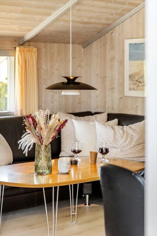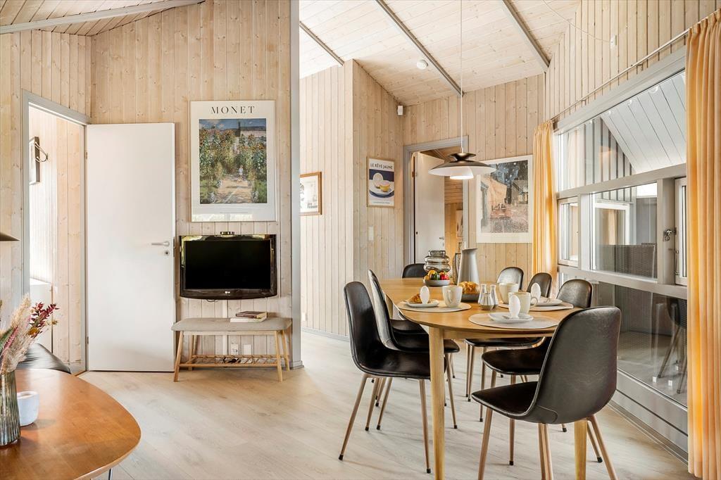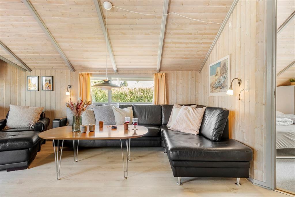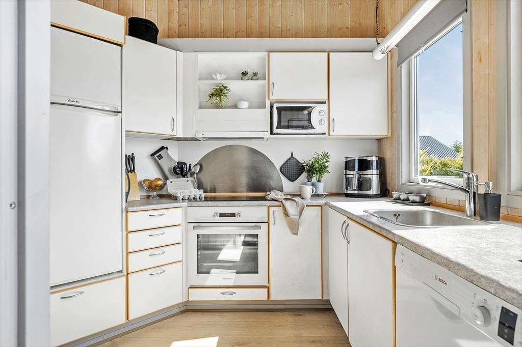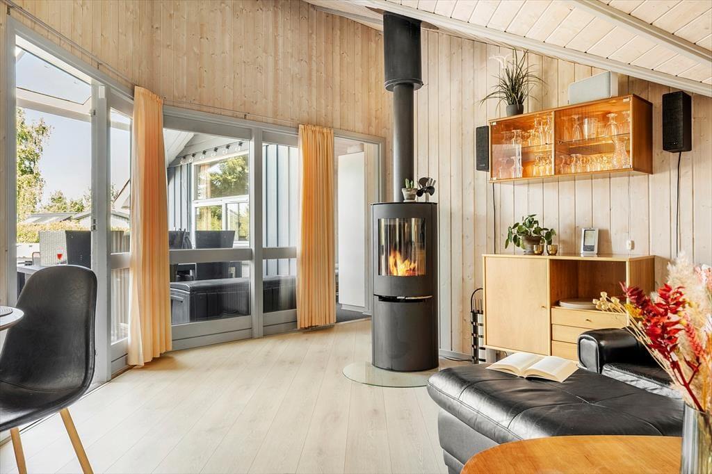 Når du træder indenfor i sommerhuset, mødes du af en lys og rummelig TV-stue med en dejlig brændeovn, der indbyder til hyggestunder på kølige aftener. Her kan du samle familien til en filmaften eller nyde en god bog med knitrende ild i baggrunden. De store vinduer sørger for et skønt lysindfald i rummet, hvor spisepladsen også er placeret, så I kan nyde feriens måltider sammen. Køkkenet ligger i åben forbindelse med stuen, og både køkken og stue har alt, hvad du har brug for til en behagelig ferie. Når du trænger til ekstra afslapning, kan du forkæle dig selv i husets spabad eller sauna, hvor du kan læne dig tilbage og koble helt af.