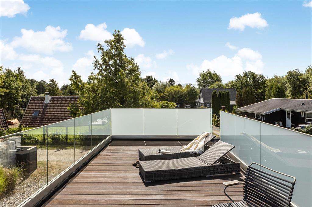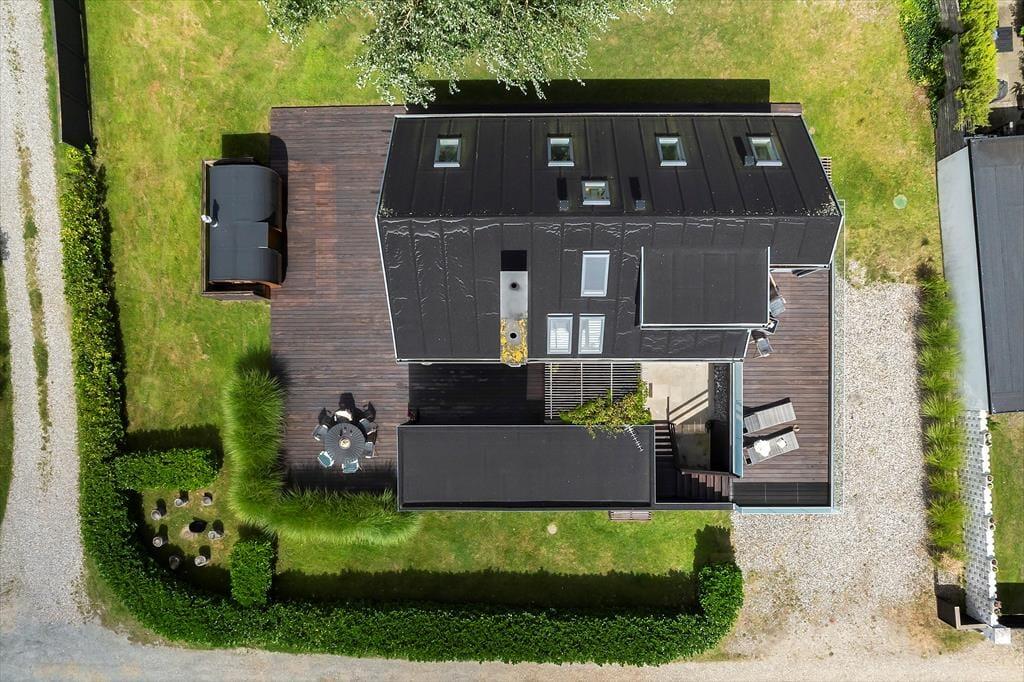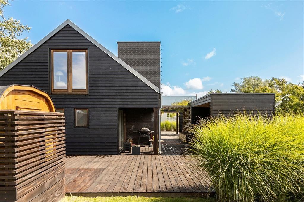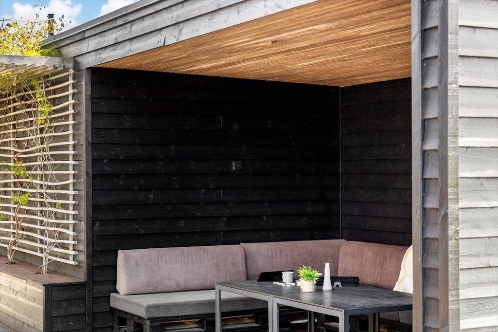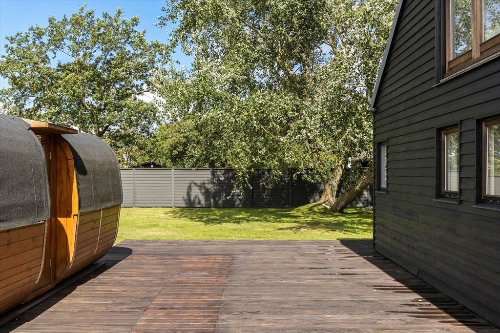 Huset har hele 100 m² terrasse, hvilket gør udelivet til en central del af ferien. Her kan du nyde solen, grille, eller trække dig tilbage til den store overdækkede hyggekrog, hvor du kan sidde lunt og tørt, selv når sommerregnen falder. Den lækre saunatønde giver ekstra wellness-følelse, og fra den øverste tagterrasse kan du slappe af med udsigt til vandet – perfekt til morgenkaffen eller et glas vin ved solnedgang. Det moderne udeområde er skabt til både afslapning og samvær, og der er masser af plads til at nyde ferien under åben himmel.