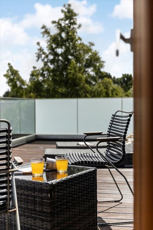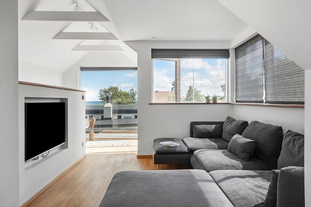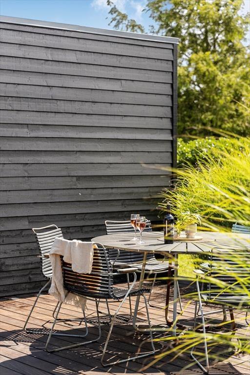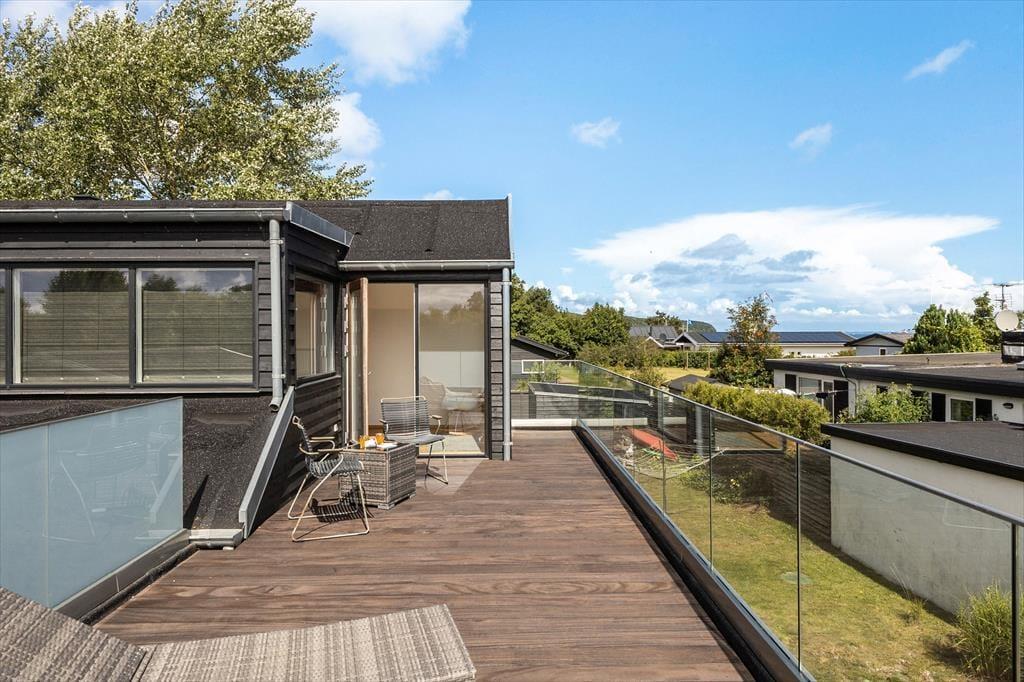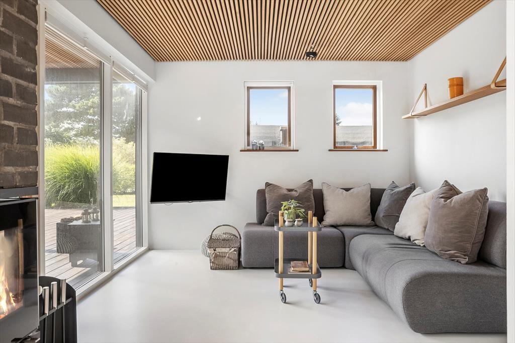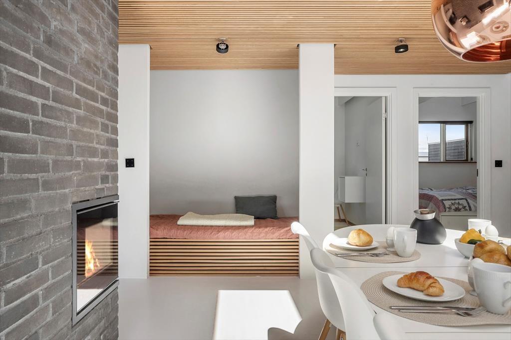 Huset har hele 100 m² terrasse, hvilket gør udelivet til en central del af ferien. Her kan du nyde solen, grille, eller trække dig tilbage til den store overdækkede hyggekrog, hvor du kan sidde lunt og tørt, selv når sommerregnen falder. Den lækre saunatønde giver ekstra wellness-følelse, og fra den øverste tagterrasse kan du slappe af med udsigt til vandet – perfekt til morgenkaffen eller et glas vin ved solnedgang. Det moderne udeområde er skabt til både afslapning og samvær, og der er masser af plads til at nyde ferien under åben himmel.