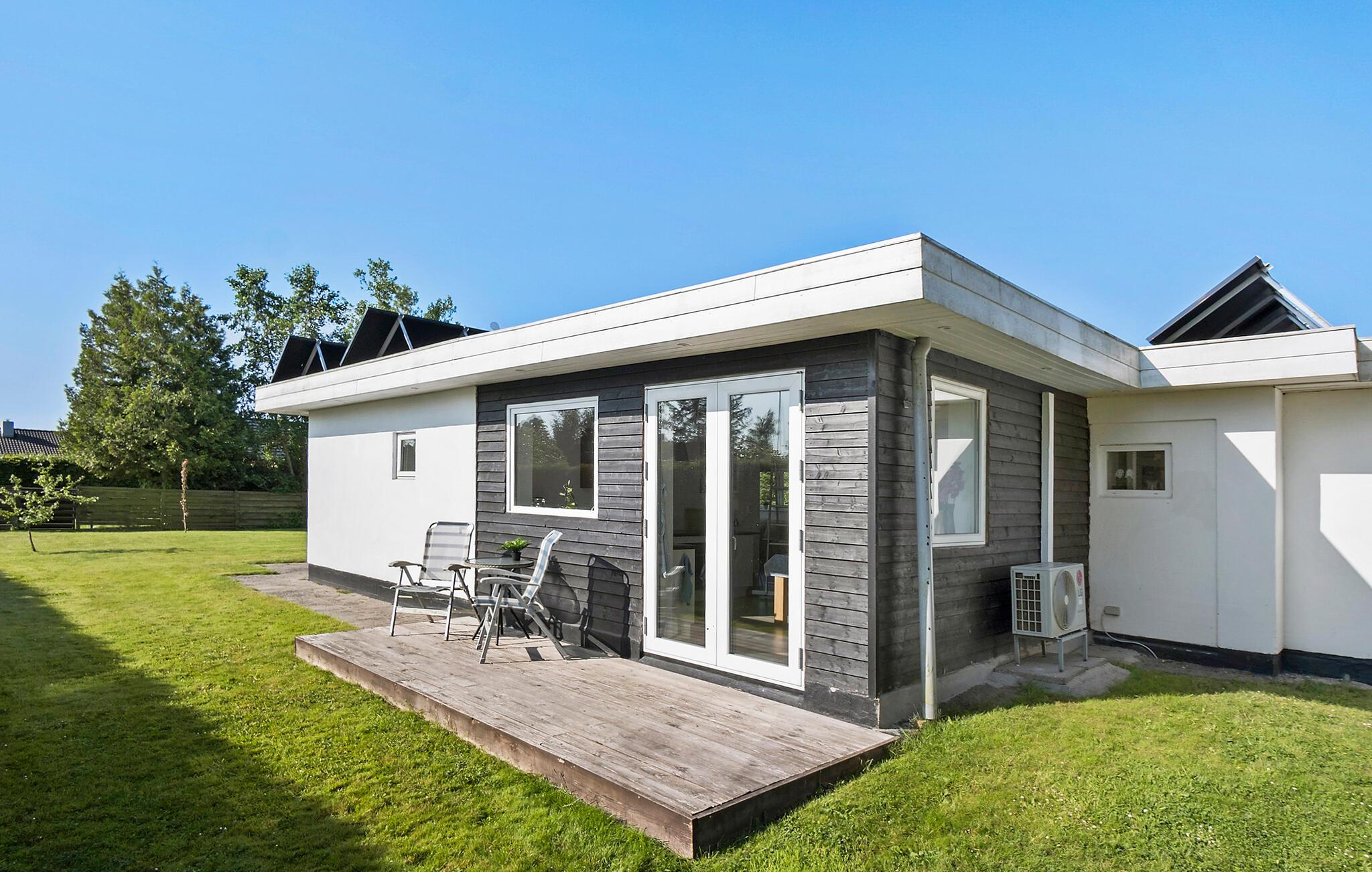 Nyd solrige timer på den smukke terrasse med spisebord og stor parasol. Brug den rummelige have til boldspil, et hyggeligt bål eller blot afslapning i det grønne. Der er også en lille ekstra terrasse bag huset, som er oplagt til morgenkaffe eller et roligt tilflugtssted.