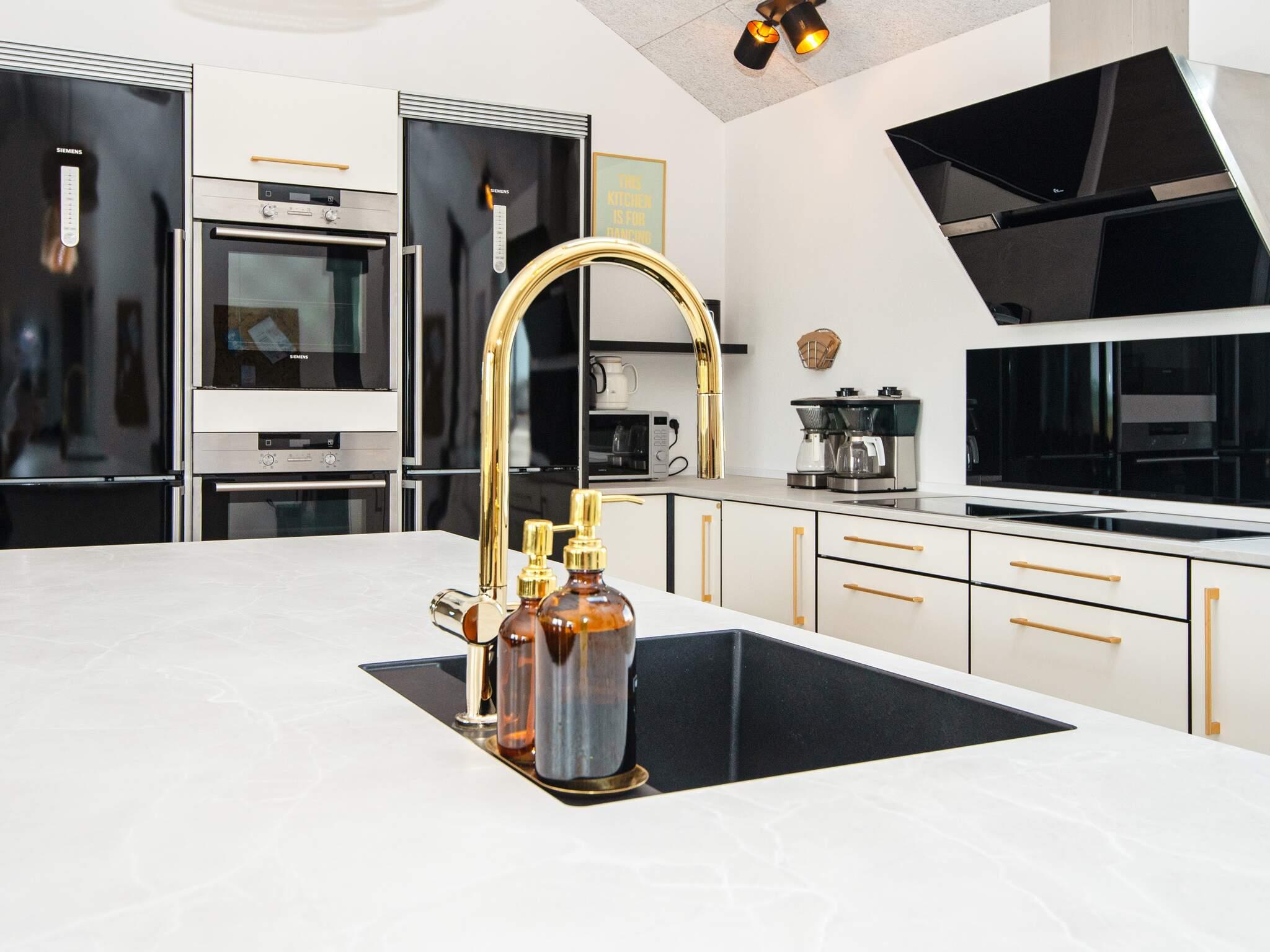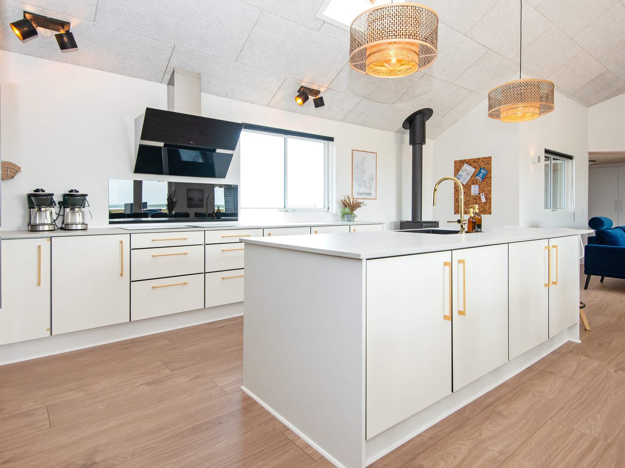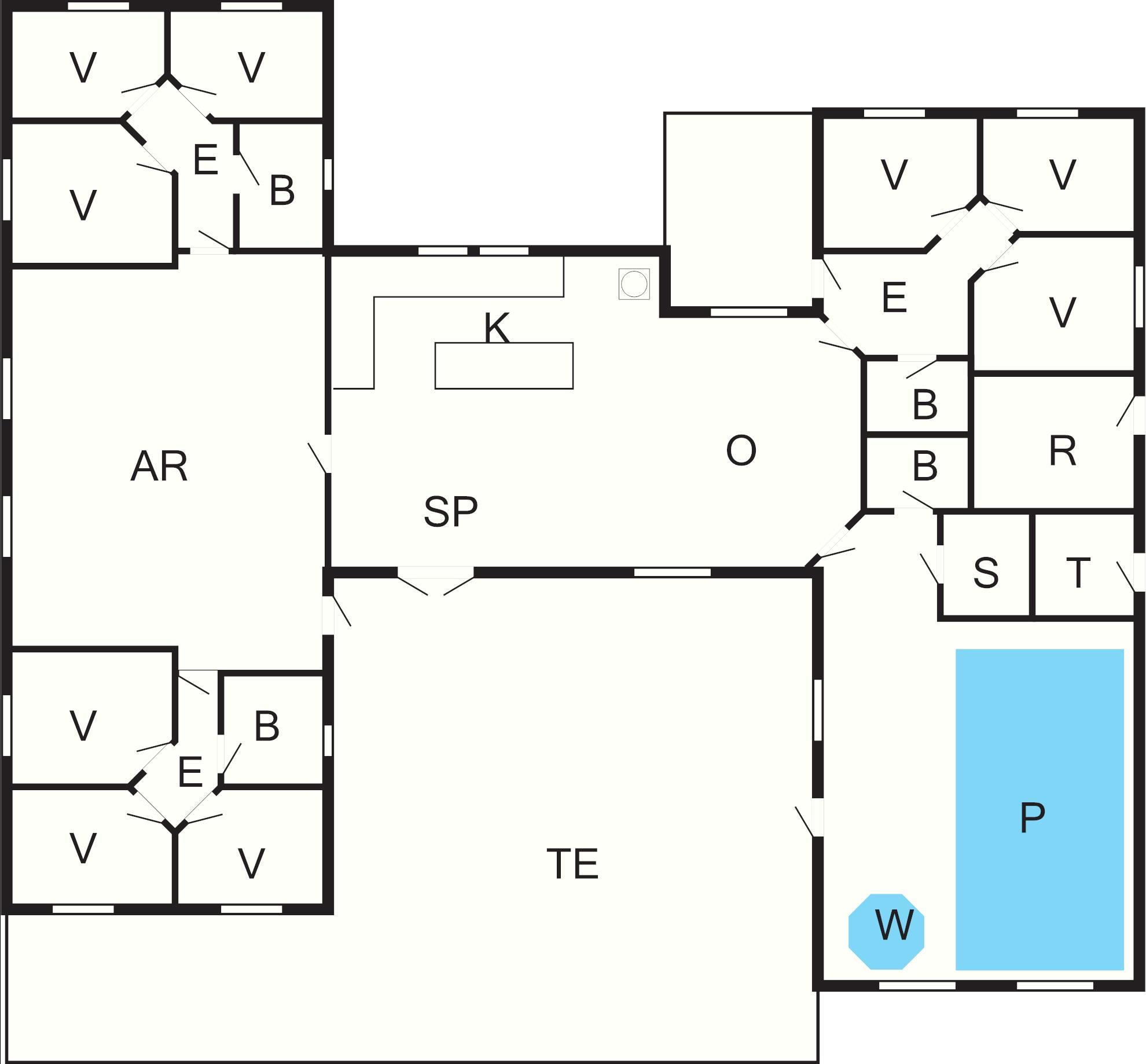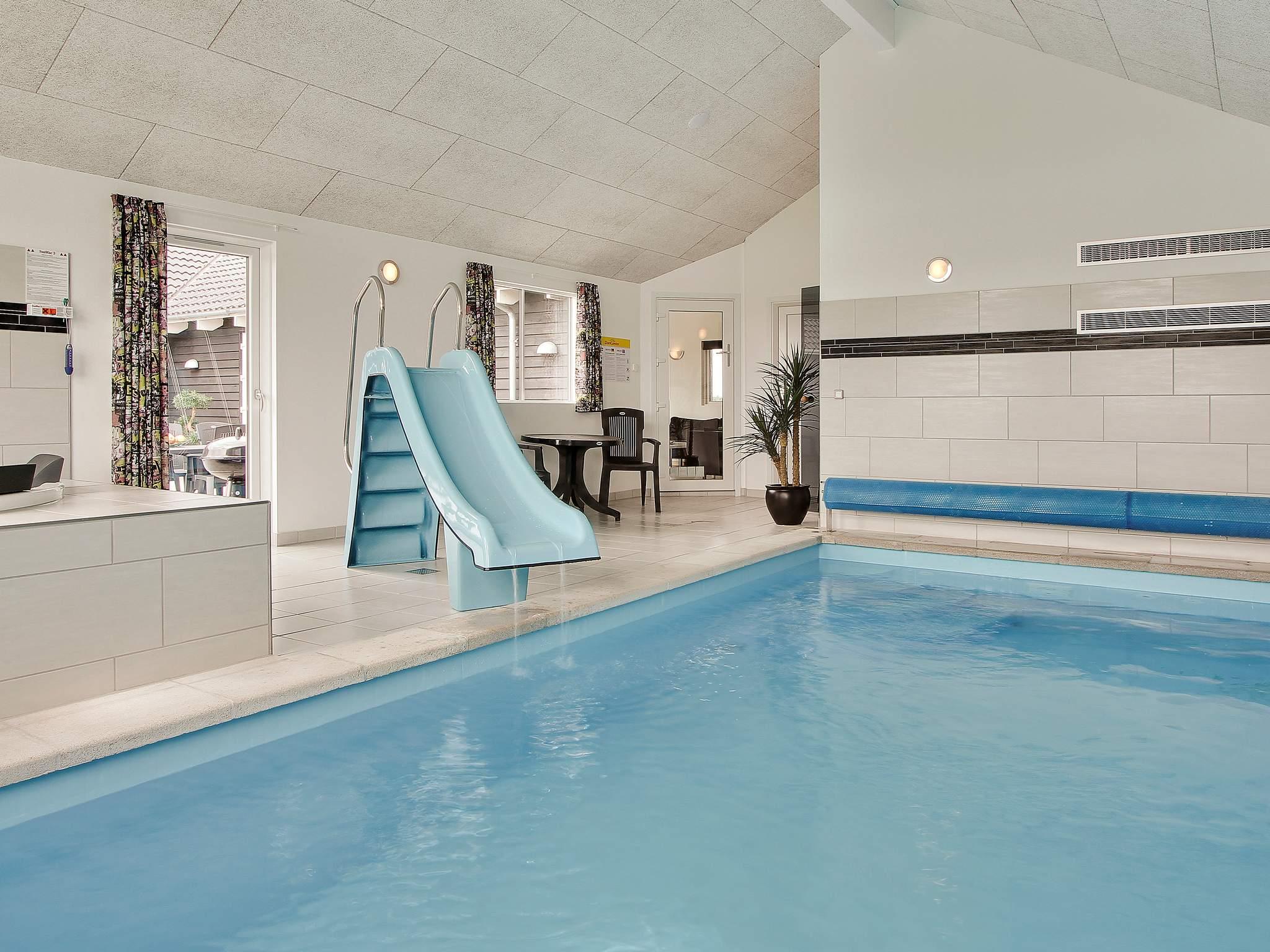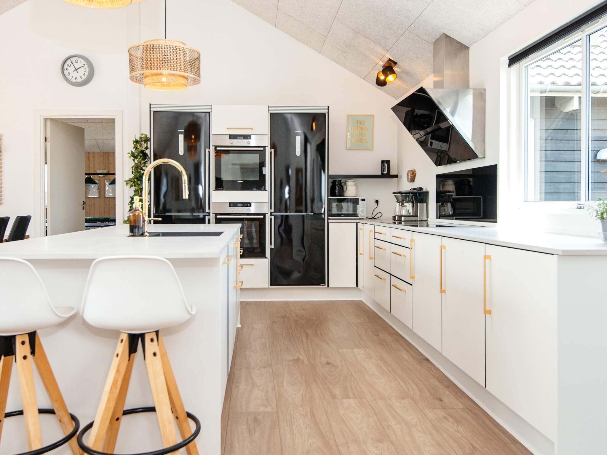 Når energien er opladet efter afslapning udendørs, kan sjove timer bruges i sommerhusets poolafdeling. Her finder I den 20 m2 store pool med vandrutsjebane, romersk trappe og modstrømsanlæg. Poolafdelingen byder tillige på afslapning i den varme spa eller sauna, hvor ren afslapning er at finde. Grinene stopper ikke her – men fortsætter derimod i stor stil i husets aktivitetsrum. Her kan I snuppe et spil billard eller bordtennis, hvorefter I kan dyste i dart, airhockey, eller bordfodbold. Dagens mange aktiviteter kan nemt give sultne maver, og her er sommerhusets velindrettede køkken det bedste sted at afhjælpe dette. Her finder I god plads til, at flere kan samles om madlavningen, for efterfølgende at nyde middagen ved det lange spisebord i midten af rummet. I forlængelse af køkkenet finder I sommerhusets sofaafdeling, hvor aftnerne kan nydes i komfortable møbler.
