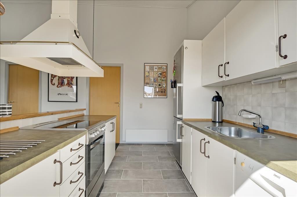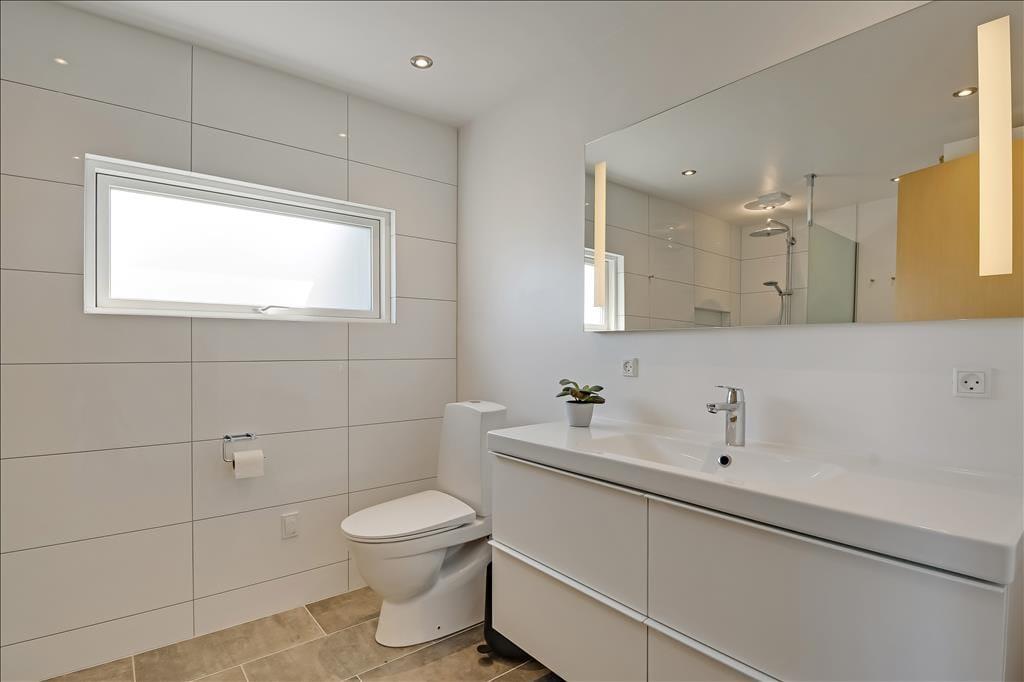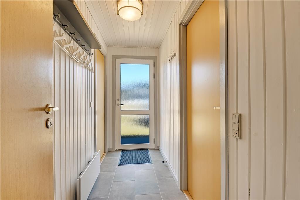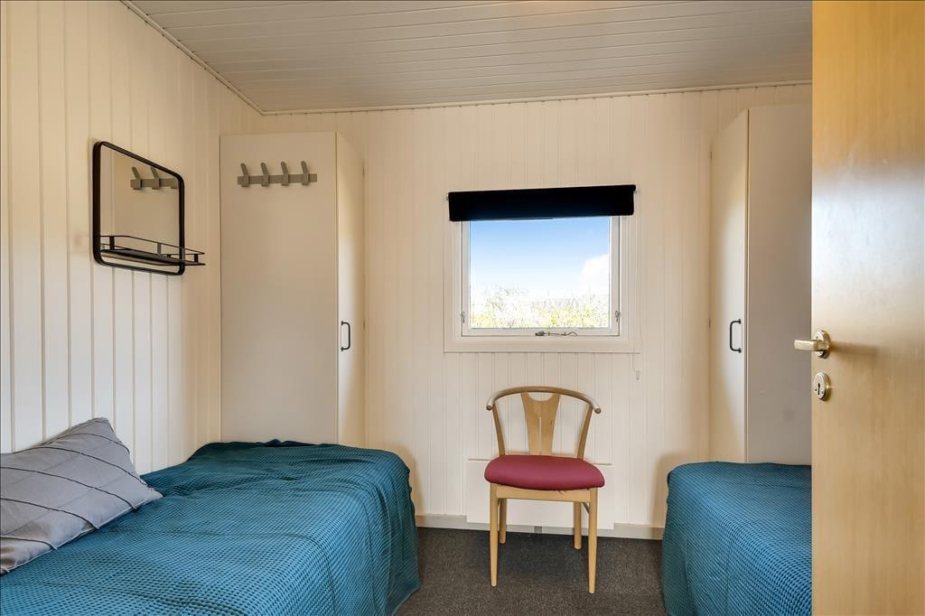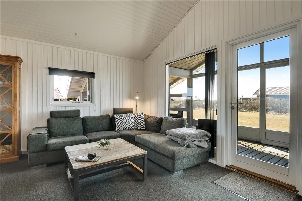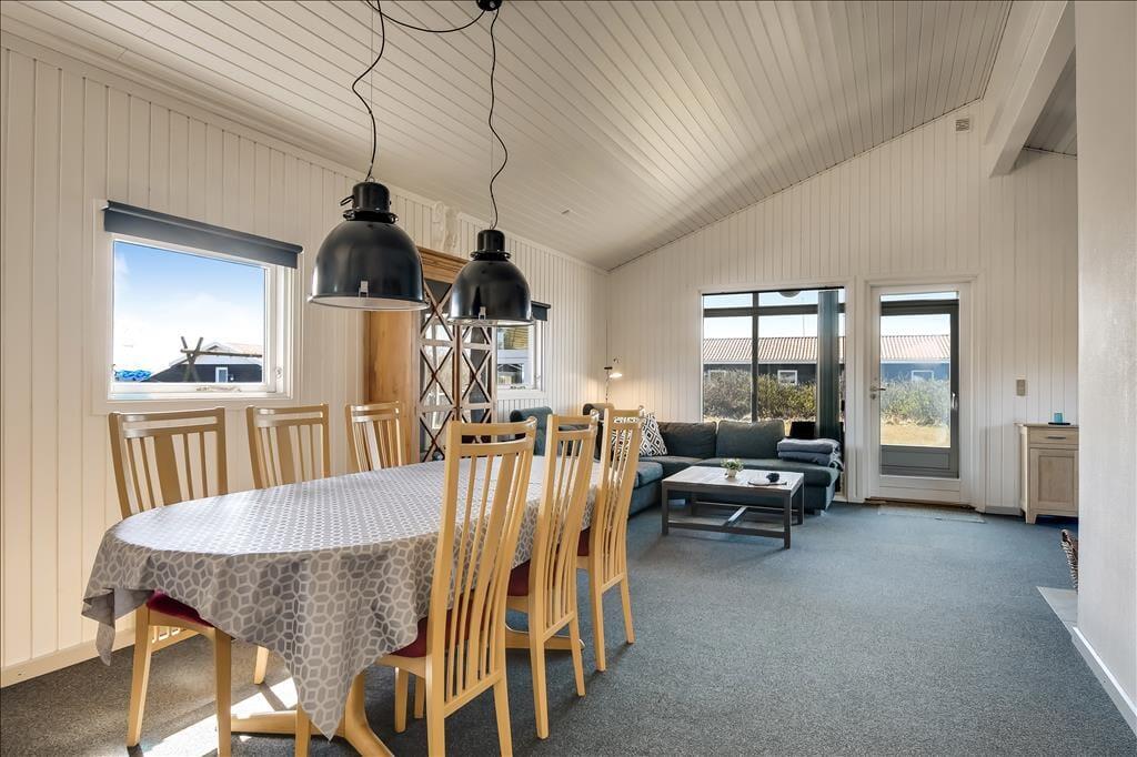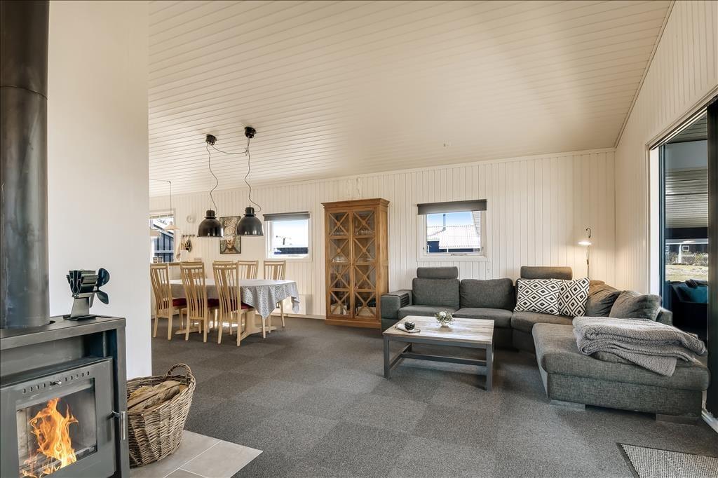Sommerhuset byder dig velkommen med en lys og indbydende indretning, der straks får dig i feriestemning. Husets åbne opholdsrum er samlingspunktet for hele familien med sin kombination af køkken, spiseplads og stue. Brændeovnen i hjørnet skaber en hyggelig stemning på kølige aftener, og gennem de store vinduer kan du nyde det smukke lysindfald fra vestkysten. De tre soveværelser giver plads til afslapning for både små og store feriegæster. Badeværelset er funktionelt indrettet og byder på alt, hvad du har brug for efter en lang dag ved stranden.