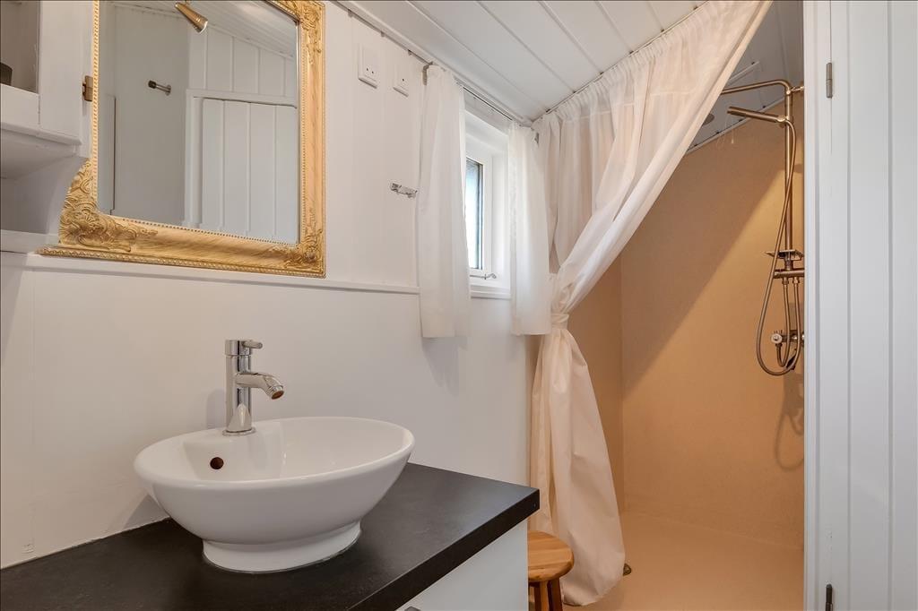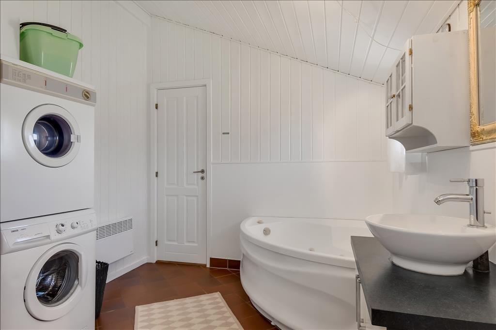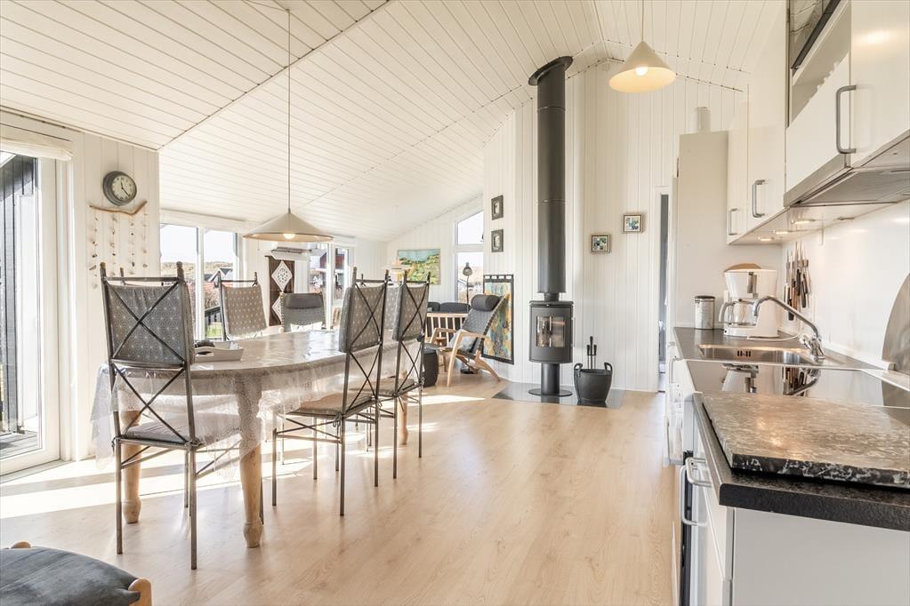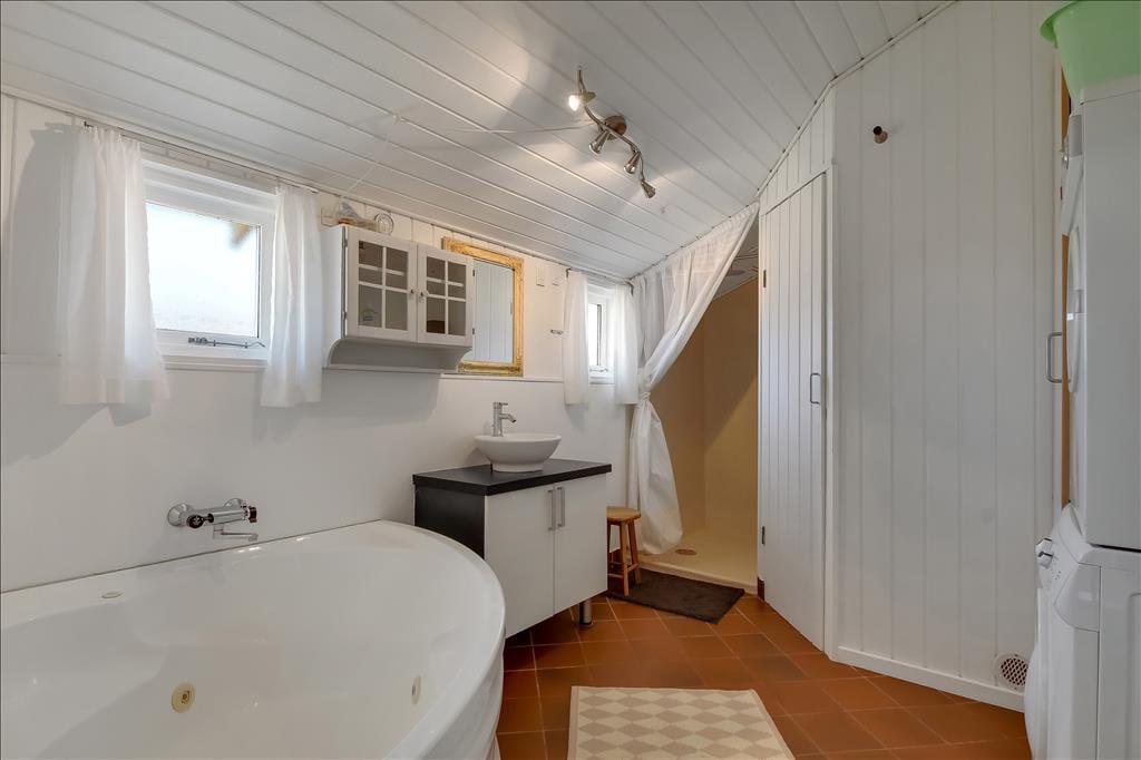 Når du træder ind i dette nyrenoverede sommerhus, mødes du af en lys og rummelig atmosfære. Den åbne planløsning forbinder køkkenet med den hyggelige stue, hvor brændeovnen spreder varme og skaber en afslappende stemning. De fire soveværelser er indrettet med komfortable senge, der sikrer en god nats søvn efter en dag fuld af oplevelser. Badeværelset byder på både spabad og sauna, hvor du kan forkæle dig selv og lade hverdagens stress forsvinde.