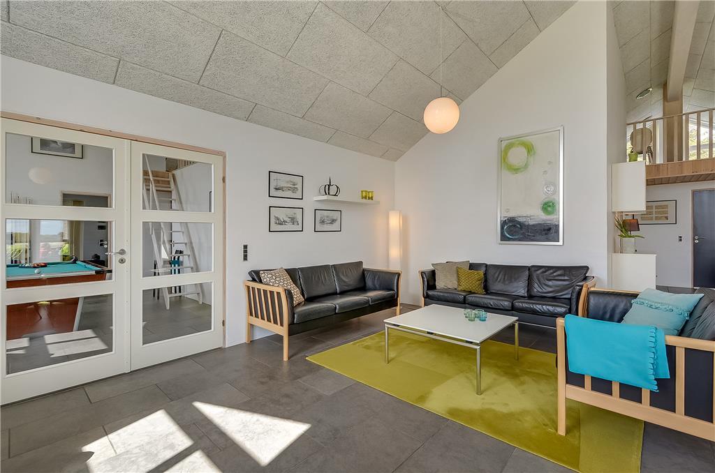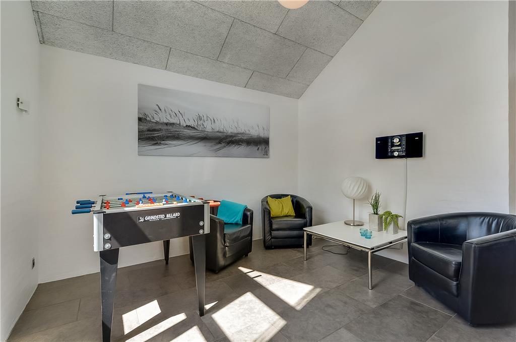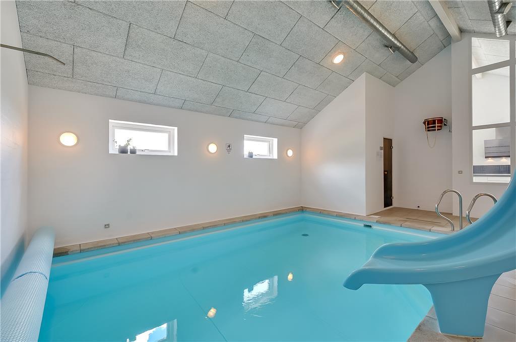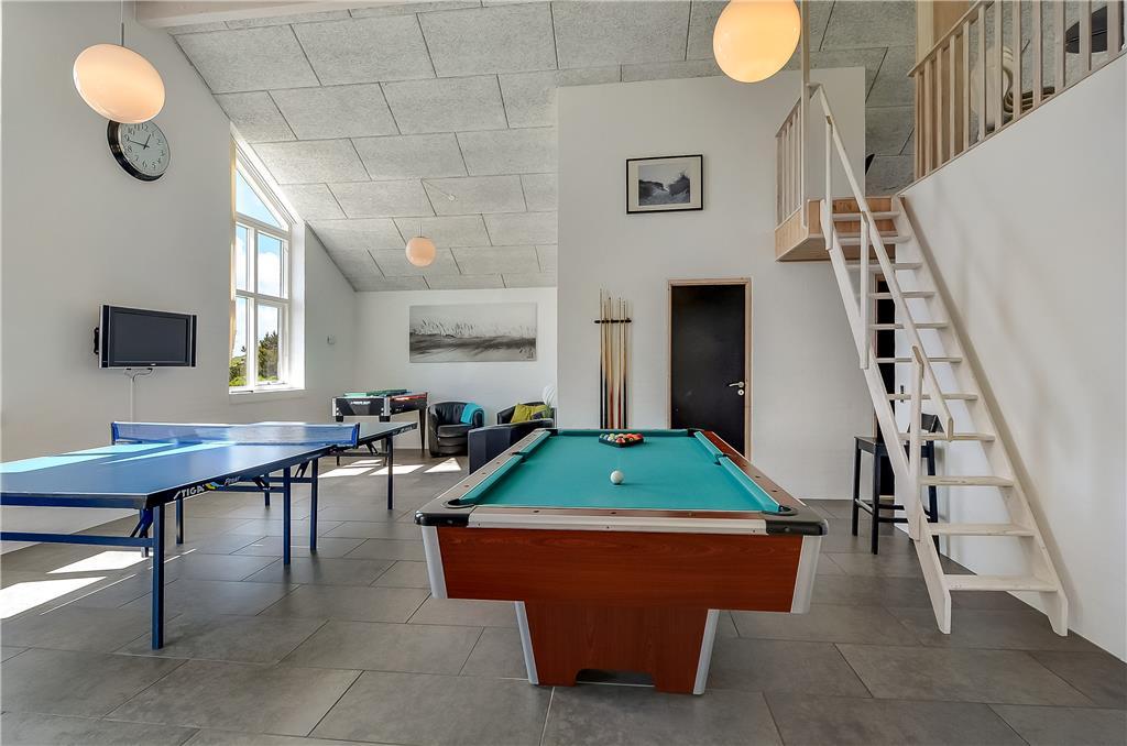 Når I træder indenfor i sommerhuset, bliver I mødt af lyse, rummelige rammer med plads til op til 20 personer. Huset er delt op i tre selvstændige enheder med hver deres opholds- og soveafdelinger, hvilket gør det perfekt til flere familier eller generationer, der gerne vil holde ferie sammen – men med mulighed for at trække sig tilbage. Midtpunktet i huset er det store fællesrum med langbord, køkken og sofaområde – og ikke mindst den imponerende pool afdeling med 20 m² stor swimmingpool, rutsjebane, spabad og sauna. Når I ikke svømmer eller slapper af i boblerne, kan I udfordre hinanden i billard, bordfodbold eller bordtennis – der er med andre ord masser at tage sig til både for store og små.