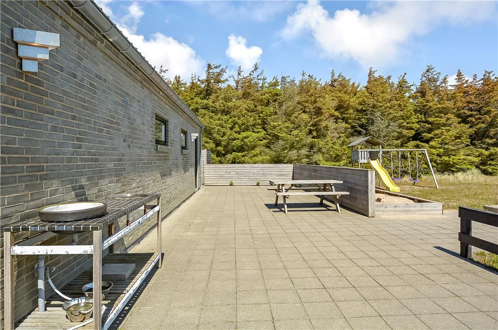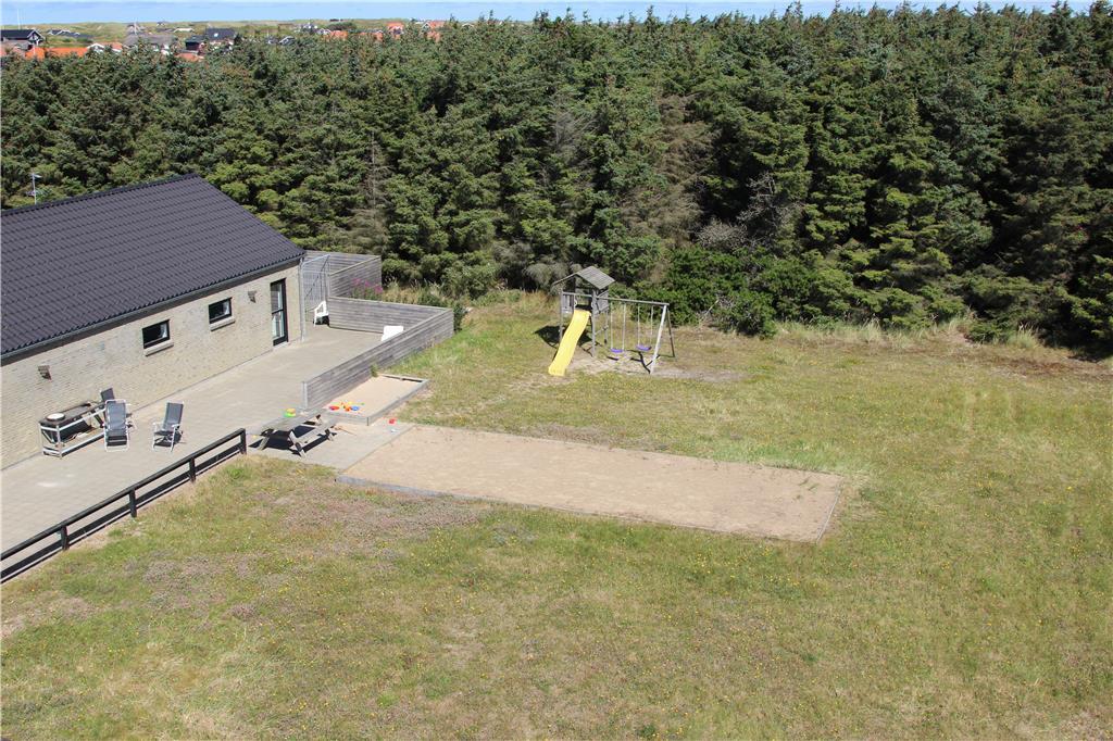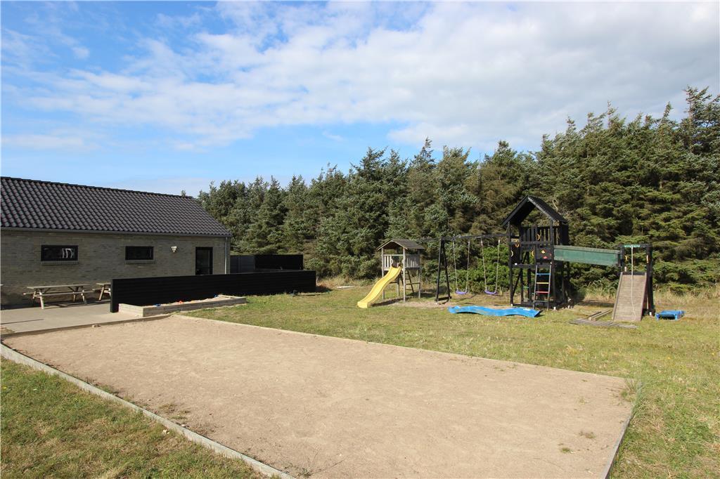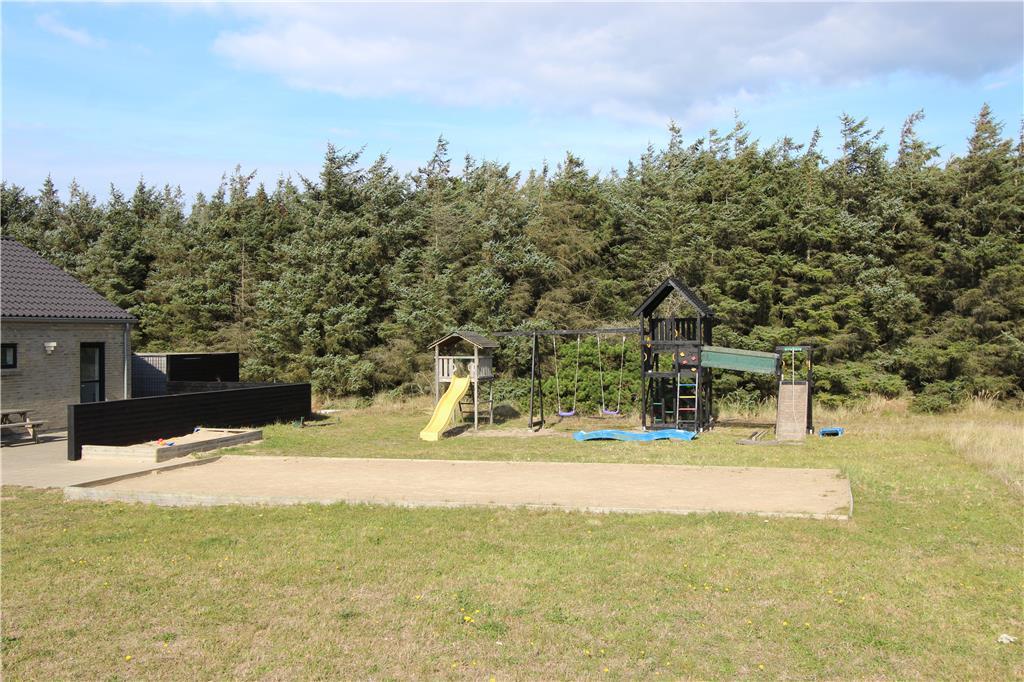 Udenfor fortsætter oplevelserne i det fri. Sommerhuset ligger på en stor, indbydende grund med god plads til både afslapning og leg. Den store terrasse indbyder til fælles måltider i solen, afslappede stunder i loungemøblerne eller måske bare en stille stund med en bog og fuglesang i baggrunden. Til børnene er der masser at give sig til i haven, hvor både et stort legetårn og gynger venter – og til de voksne (eller konkurrencelystne børn) er der en petanquebane klar til mange hyggelige timer. Hele området omkring huset føles fredeligt og privat, og med mulighed for at tage hunden med på ferie, bliver det hele familiens frirum.