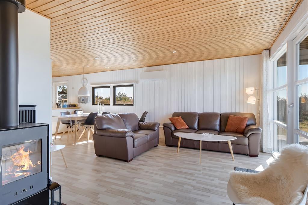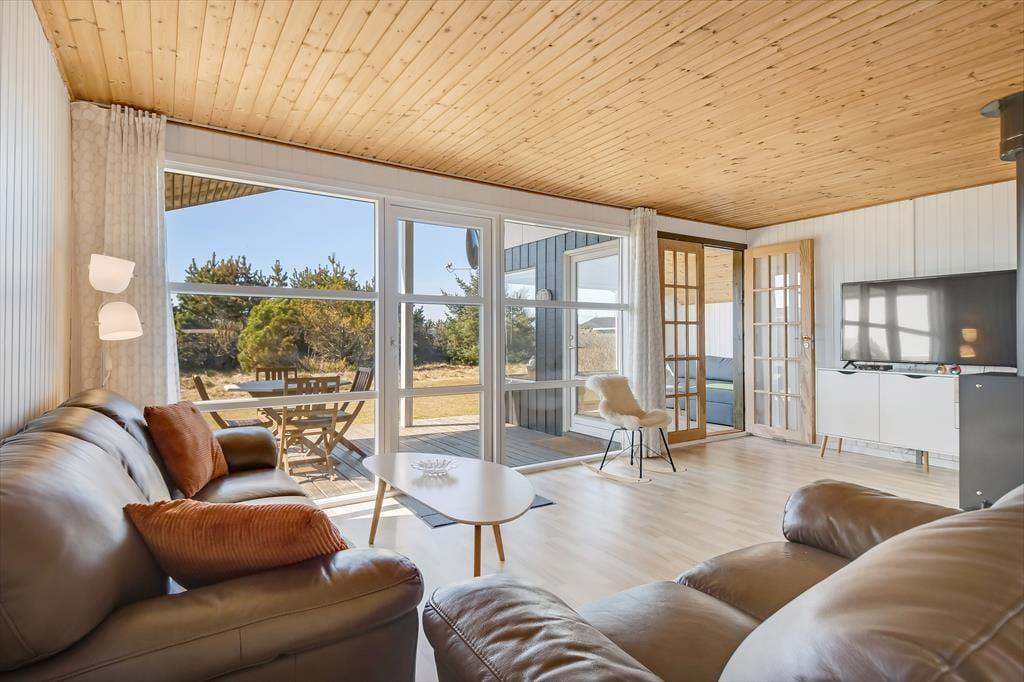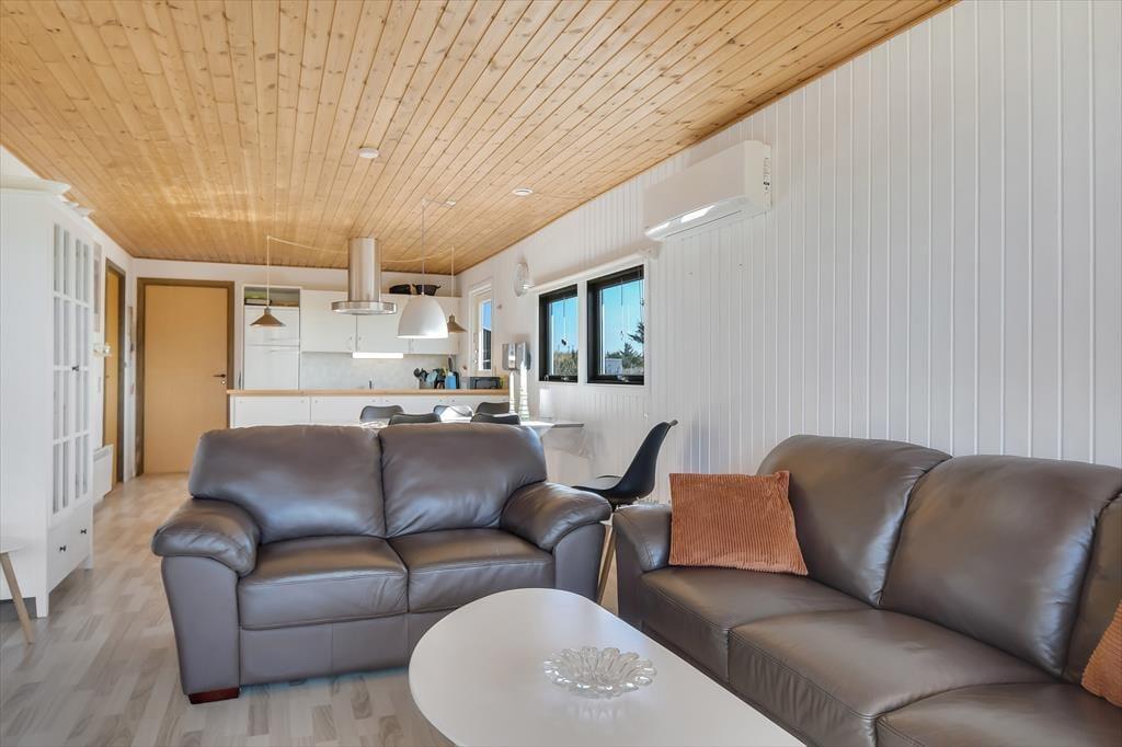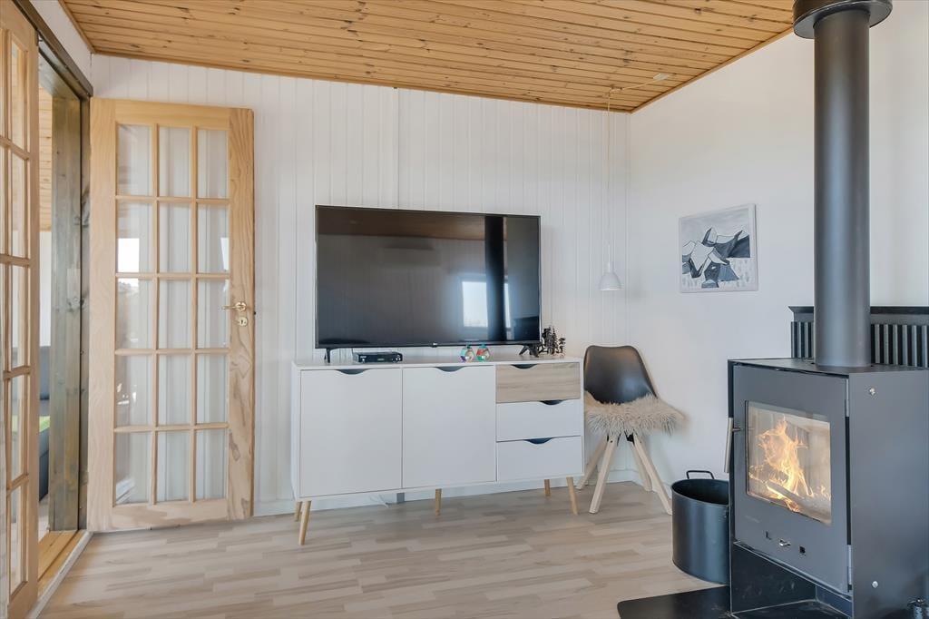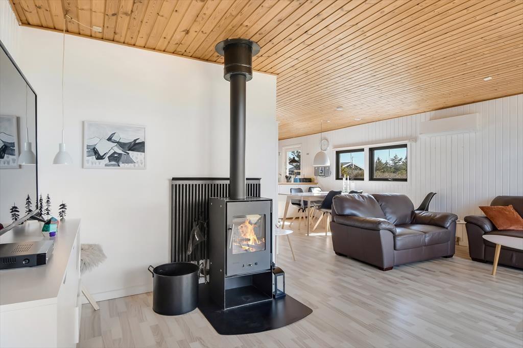Når du træder indenfor, mærker du straks den varme og indbydende atmosfære, som præger sommerhuset. Huset er indrettet med fokus på hygge og komfort, og stuen er det perfekte samlingspunkt for familie og venner. Sæt dig til rette i sofaen, tænd op i brændeovnen, og nyd den særlige ro, som kun findes på en ferie ved vestkysten. Husets køkken ligger i åben forbindelse med stuen, så fælles madlavning og hyggelige stunder kan foregå side om side. De lyse rum og store vinduer inviterer naturens lys ind og giver en skøn udsigt til haven. Sommerhuset rummer også sovepladser til hele familien og har et badeværelse med fine faciliteter.