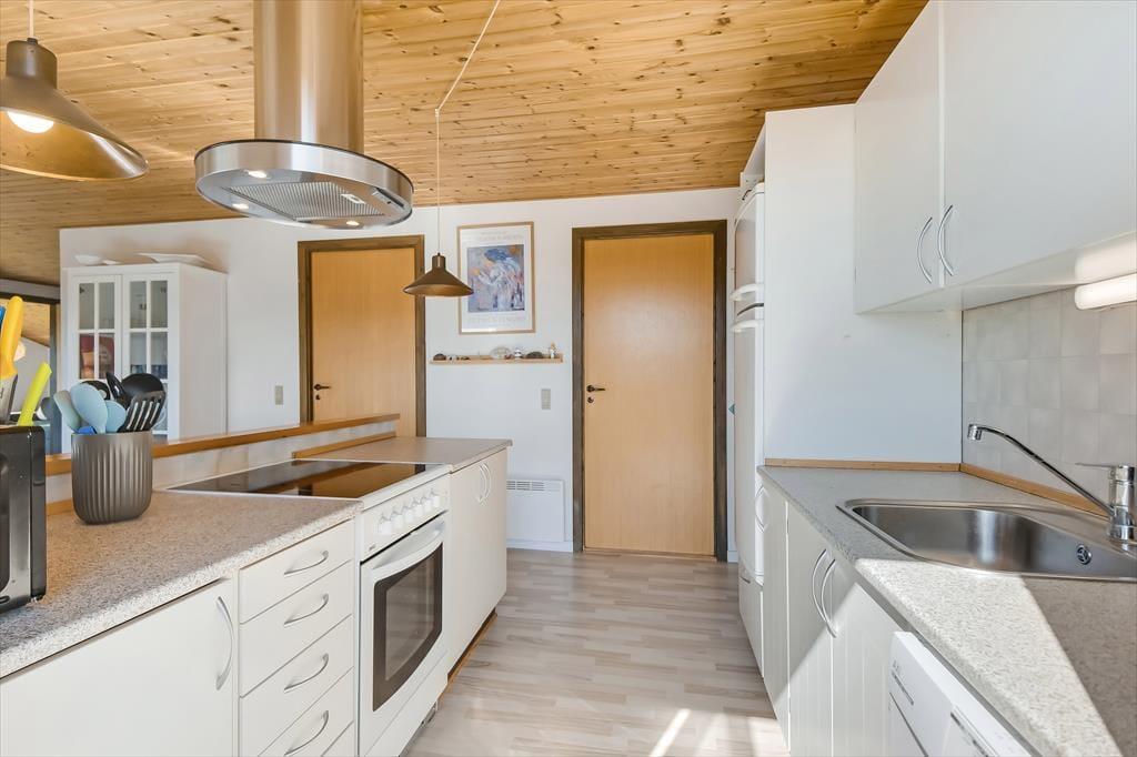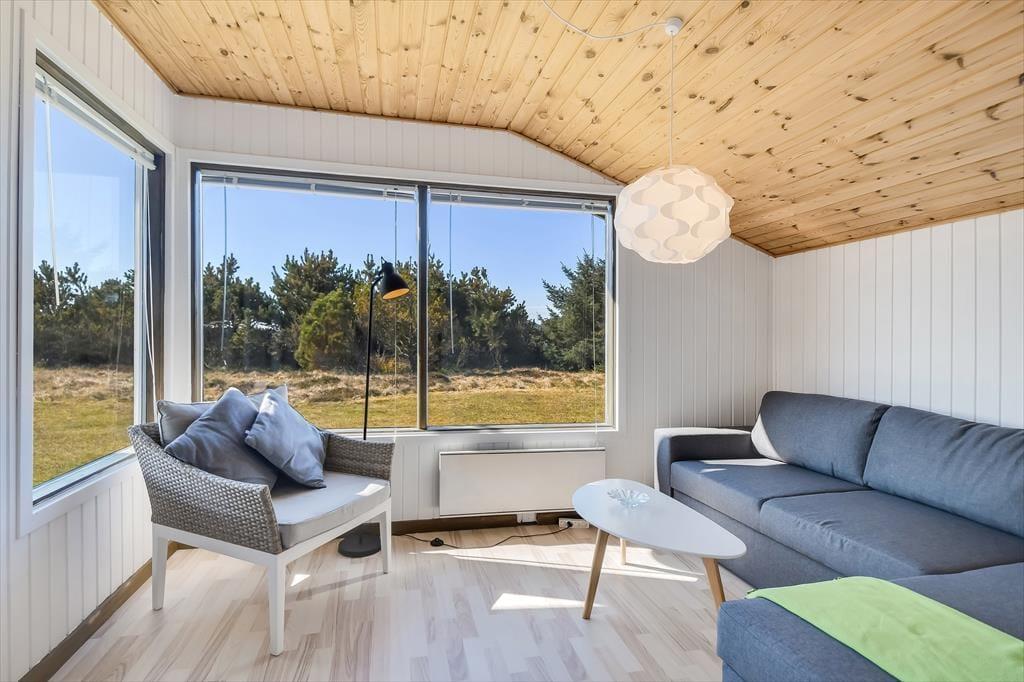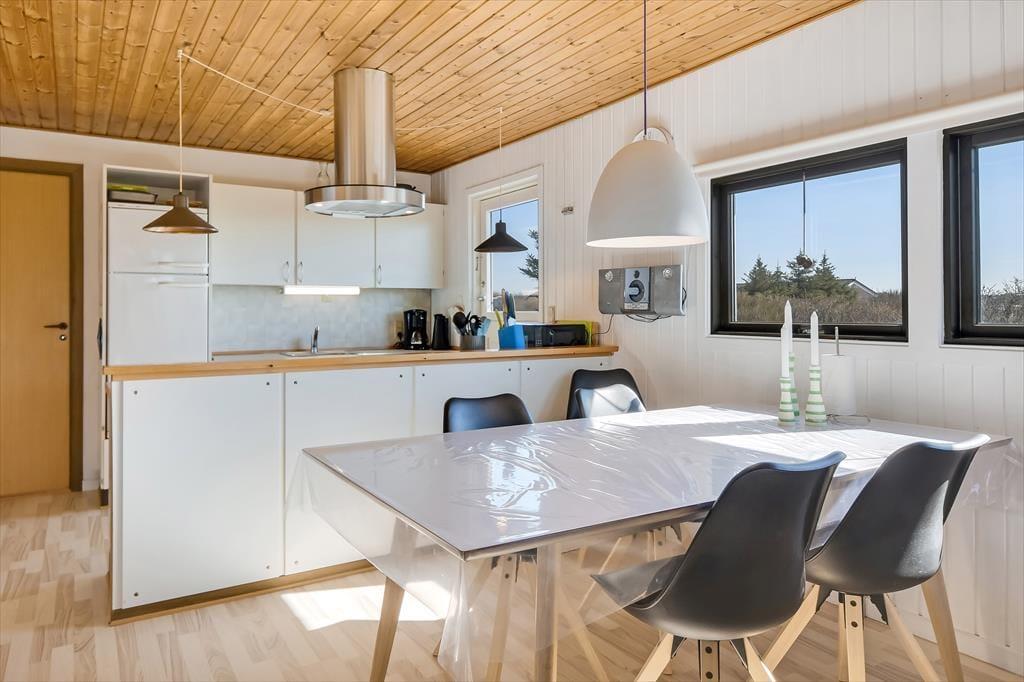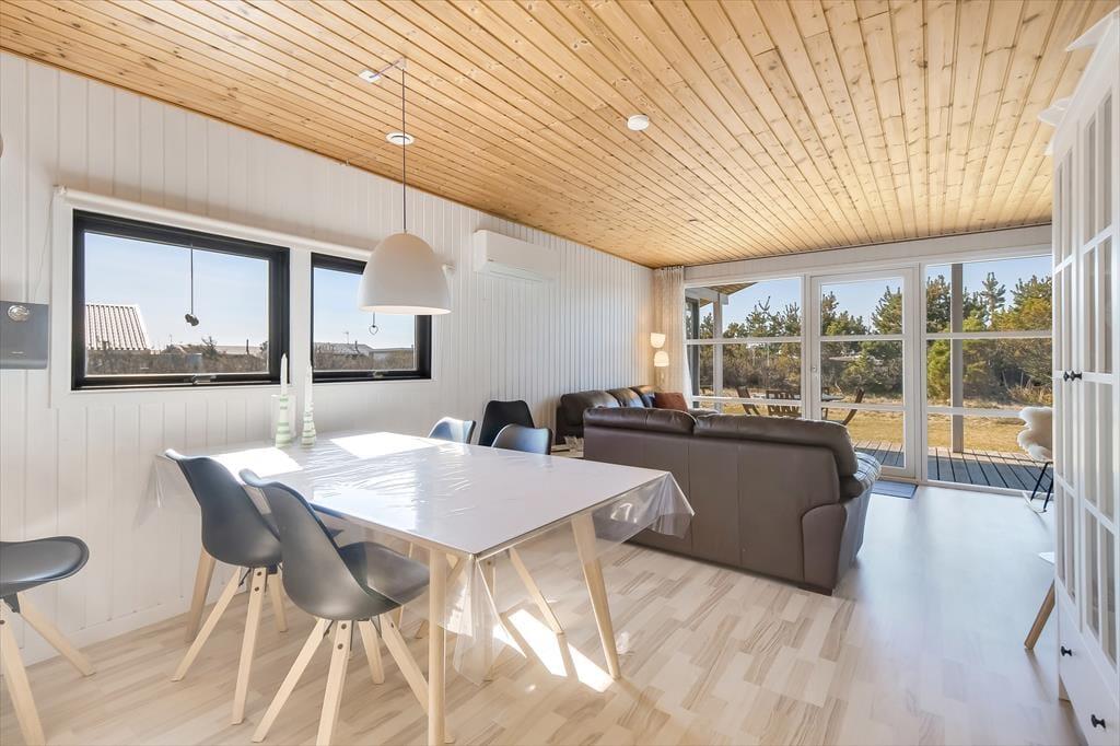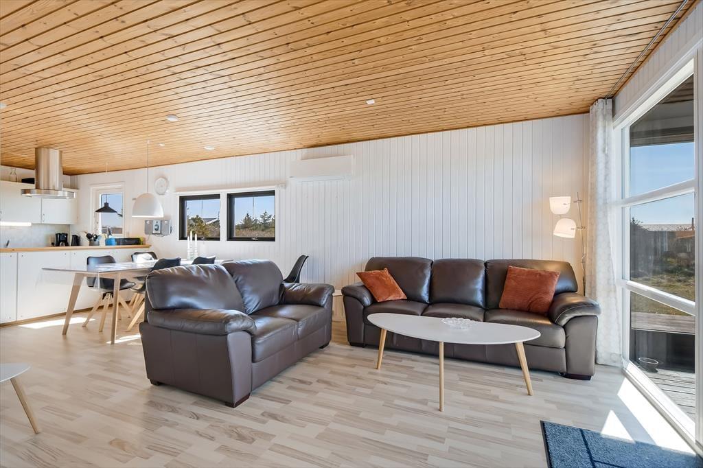 Når du træder indenfor, mærker du straks den varme og indbydende atmosfære, som præger sommerhuset. Huset er indrettet med fokus på hygge og komfort, og stuen er det perfekte samlingspunkt for familie og venner. Sæt dig til rette i sofaen, tænd op i brændeovnen, og nyd den særlige ro, som kun findes på en ferie ved vestkysten. Husets køkken ligger i åben forbindelse med stuen, så fælles madlavning og hyggelige stunder kan foregå side om side. De lyse rum og store vinduer inviterer naturens lys ind og giver en skøn udsigt til haven. Sommerhuset rummer også sovepladser til hele familien og har et badeværelse med fine faciliteter.