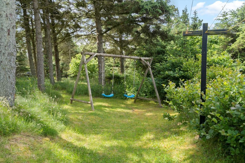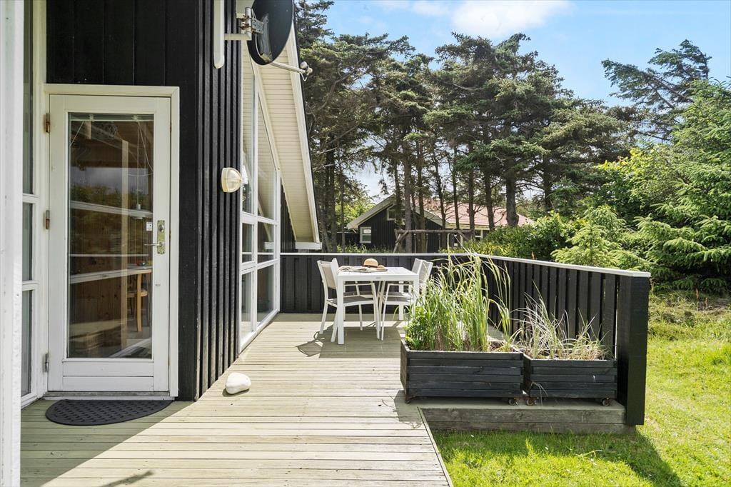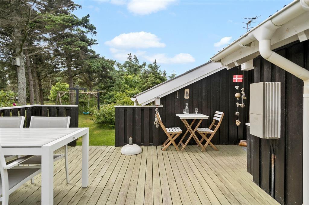 Huset ligger omgivet af en skovlignende bevoksning, der skaber en dejlig ramme for fred og ro. Den store terrasse inviterer til afslappende stunder, hvor du kan nyde solen eller tage et måltid under åben himmel. Grillen står klar til at gøre aftensmaden ekstra hyggelig, og børnene kan trygt lege på grunden, som er skærmet af den naturlige bevoksning. Hvis du har hund med, vil den elske at snuse rundt blandt træerne og buskene, der omkranser sommerhuset.