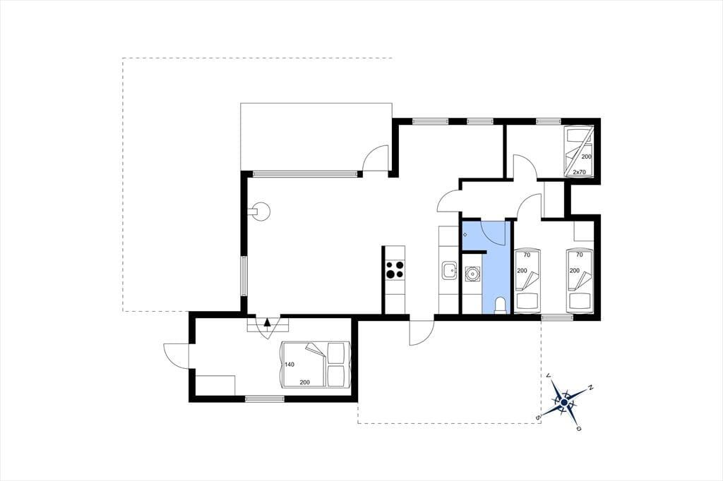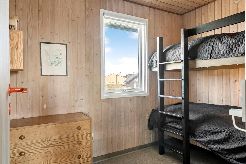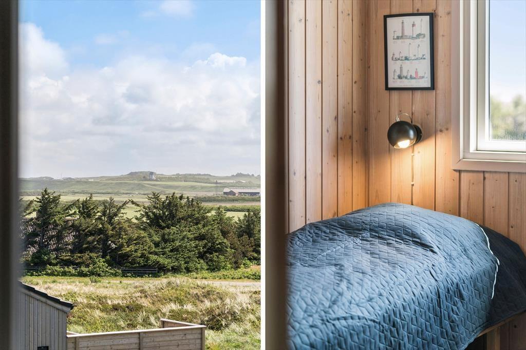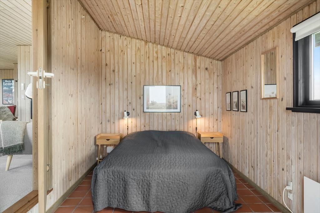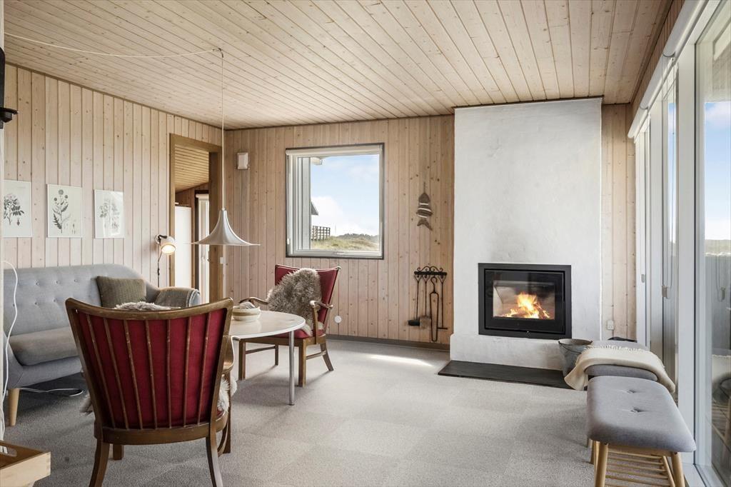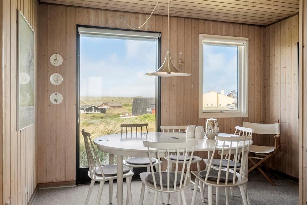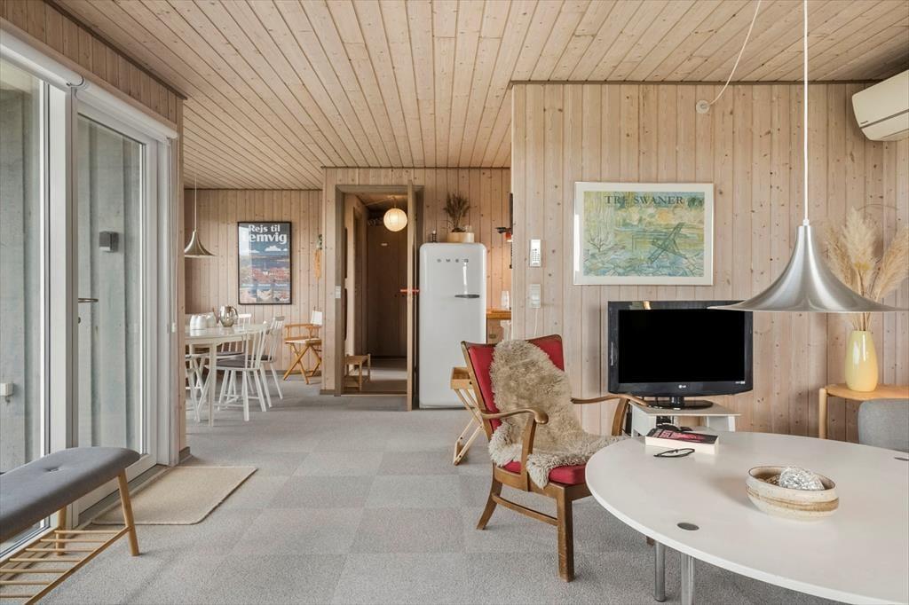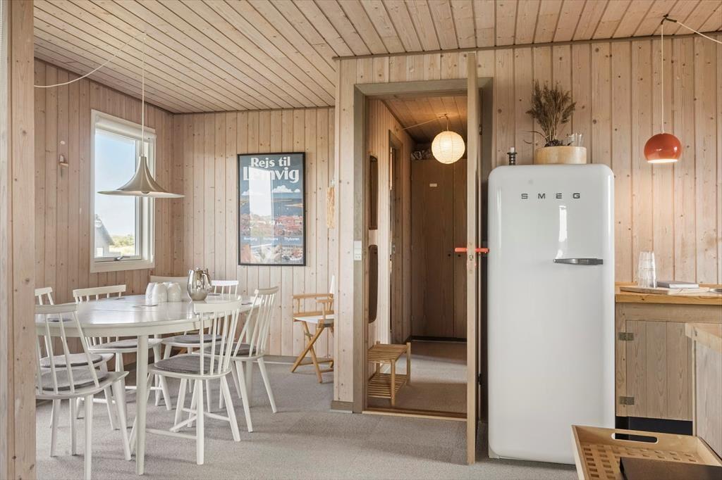 Indenfor mødes du af et indbydende køkkenalrum, hvor stue og køkken smelter sammen. Den hyggelige spiseplads og sofagruppen ved pejsen skaber rammerne for afslappende stunder med familie eller venner. Gennem vinduerne kan du nyde synet af de majestætiske klitter, mens pejsens knitren spreder varme. Huset rummer tre komfortable soveværelser og et badeværelse med bruseniche, der sikrer en behagelig base efter en dag fuld af oplevelser.