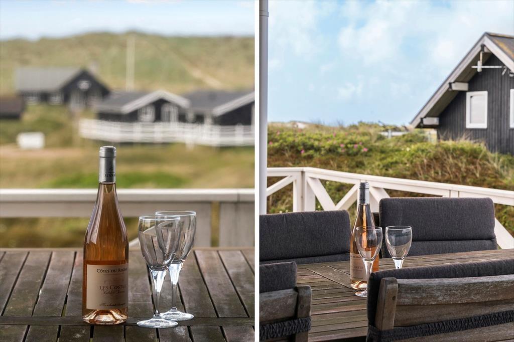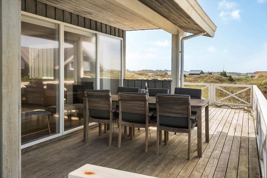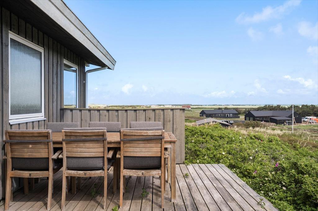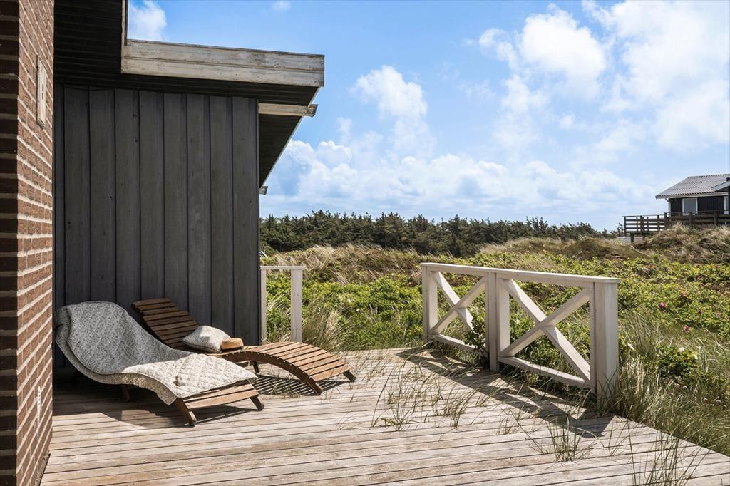 Udendørs venter flere terrasser udstyret med havemøbler, liggestole og grill, der indbyder til afslapning i solens stråler hele dagen. Forestil dig at starte morgenen med en kop kaffe på terrassen, mens du lytter til havets brusen i baggrunden. Om aftenen kan du samle familien til en lækker grillmiddag, mens solen langsomt går ned over klitlandskabet. Den fantastiske udsigt og lyden af bølgerne skaber en unik atmosfære, der gør hvert øjeblik specielt.