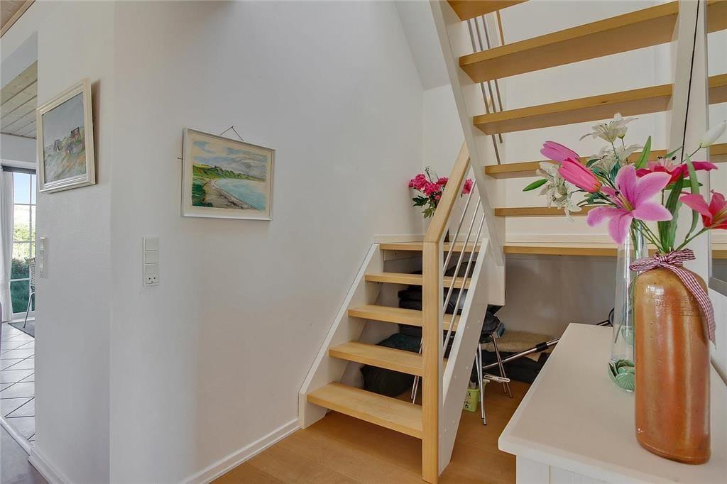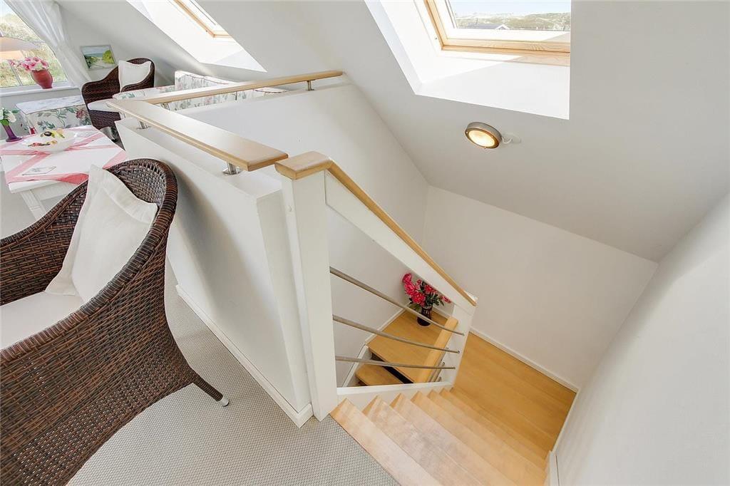 I stueetagen møder du et kombineret køkken-alrum og stue, indrettet med pæne møbler og direkte udgang til terrassen. Huset byder på to badeværelser, hvoraf det ene er udstyret med sauna og spa – perfekt til afslapning efter en dag ved stranden. Et dejligt soveværelse med god skabsplads fuldender stueetagen. På første sal finder du to yderligere soveværelser samt en hyggelig stue i ægte sommerhusstil. Fra stuen er der adgang til en skøn balkon med udsigt mod vester.