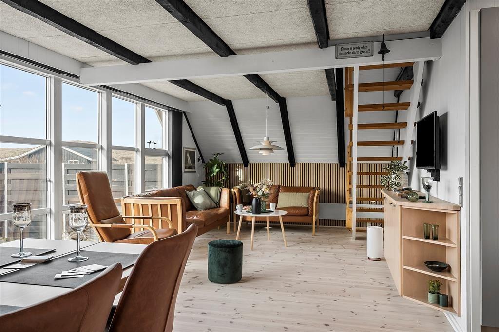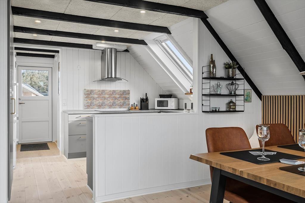 Fra det øjeblik du åbner døren, mødes du af en frisk atmosfære præget af moderne elegance – sommerhusets stueplan er nemlig gennemrenoveret i 2024. Her træder nye, stilfulde møbler og en smagfuld indretning i rolige farvetoner frem, som skaber en stemning, du vil elske at vende tilbage til efter en lang dag i klitterne. Køkkenet er lyst, moderne og indbyder til fælles madlavning med friske lokale råvarer, mens det lækre nye badeværelse giver dig følelsen af velvære på alle tider af døgnet.