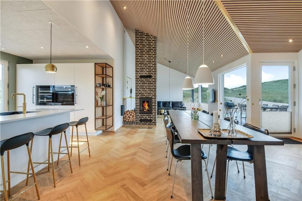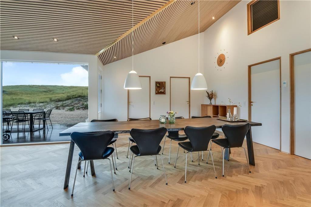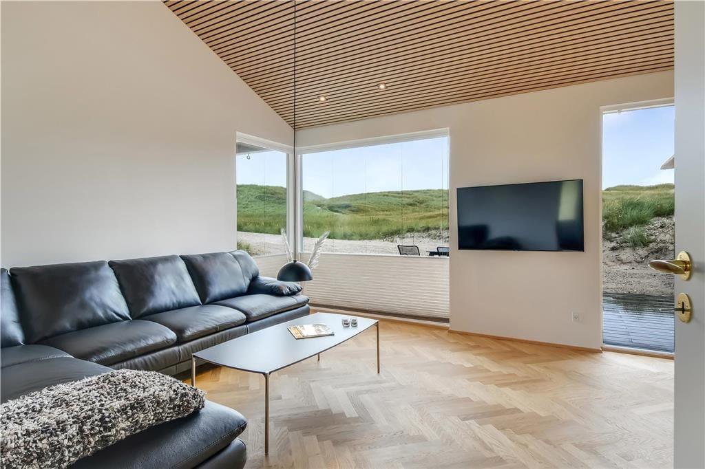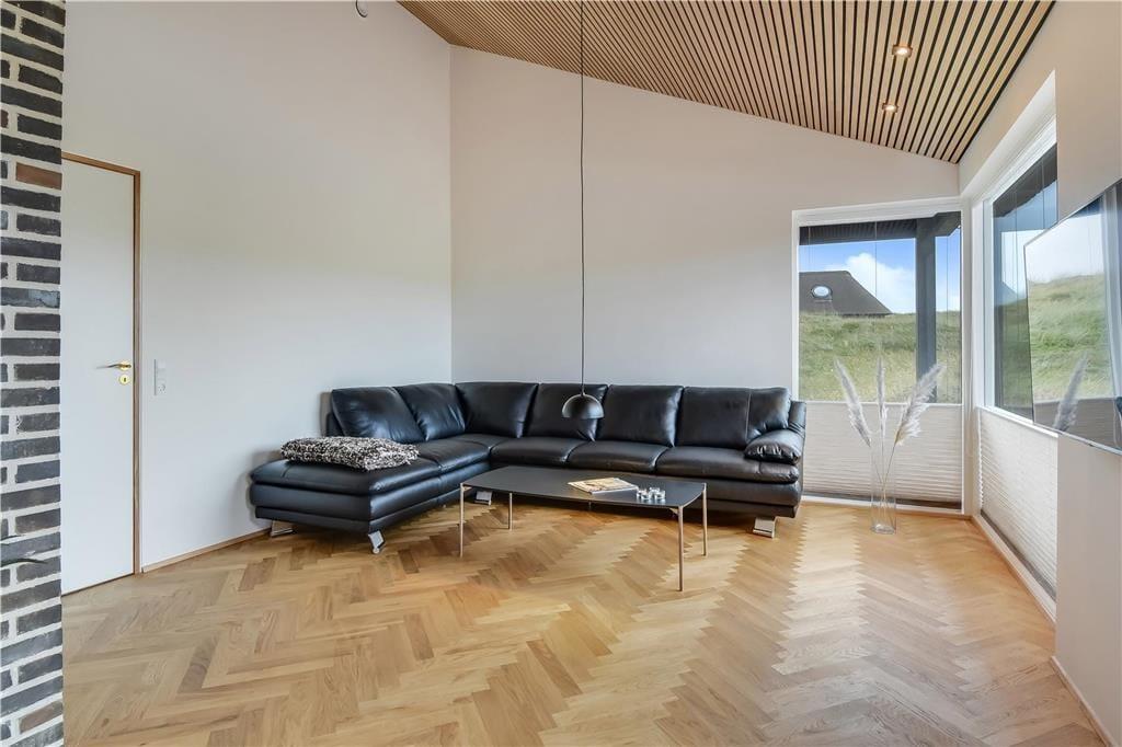 Bag det klassiske ydre gemmer der sig en stilfuld og moderne indretning, der straks får dig til at føle dig godt tilpas. Huset byder på et lyst og åbent opholdsrum, hvor stue og køkken går op i en højere enhed. Her er der højt til loftet, smukke materialevalg og plads til både ro og fællesskab. Skråvægge og store vinduespartier tilfører rummet karakter og masser af naturligt lys, og uanset om I nyder morgenmaden eller en aften foran fjernsynet, er der udsigt til klitlandskabet udenfor. Efter en lang dag ved stranden kan du lade skuldrene sænke sig i det indendørs spabad eller nyde varmen i saunaen. For børn og barnlige sjæle er hemsen et hyggeligt frirum, perfekt til leg eller en stille stund med en god bog.