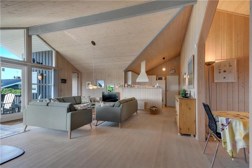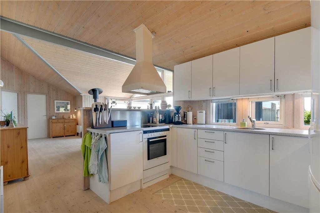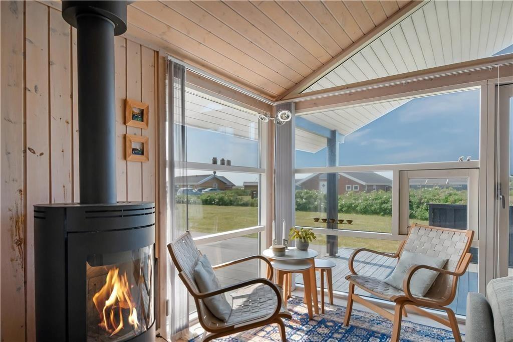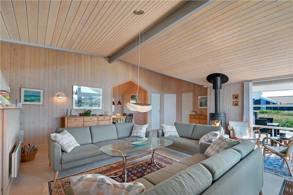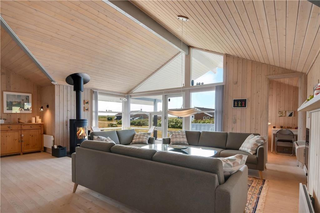 Sommerhuset byder på en lys og rummelig indretning med god plads til både afslapning og samvær. Det åbne opholdsrum med stue og køkken i ét skaber et naturligt samlingspunkt, hvor du kan nyde roen og hinandens selskab – hvad enten det er over et spil, en fælles madlavningssession eller foran den knitrende brændeovn på kølige aftener. De store vinduer lukker lyset ind og bringer dig tæt på naturen – og efter en dag i Vesterhavets salte brise kan du slappe helt af i husets spa, der er placeret på det ene af de to badeværelser. Alt er indrettet med øje for både funktionalitet og hygge, og det føles let at falde til og bare være.