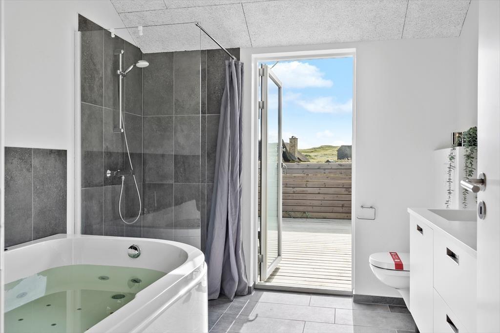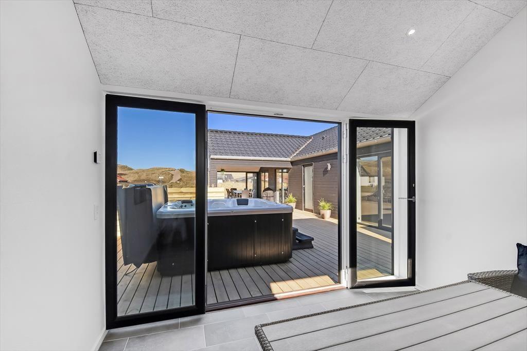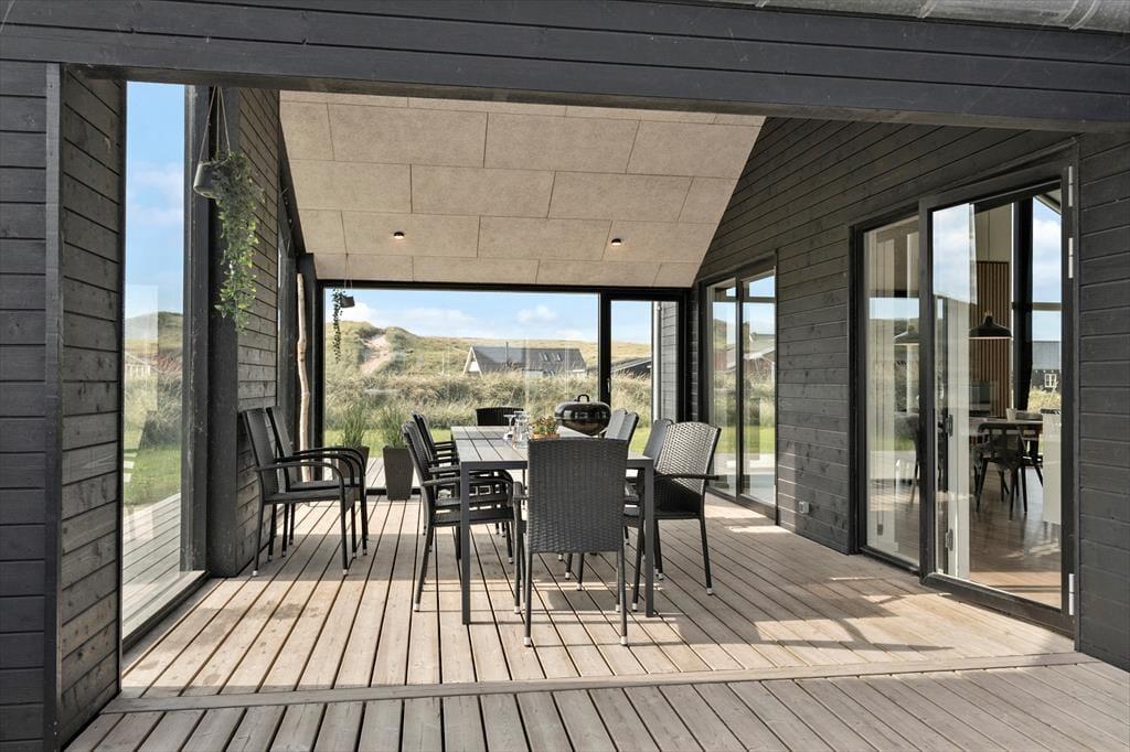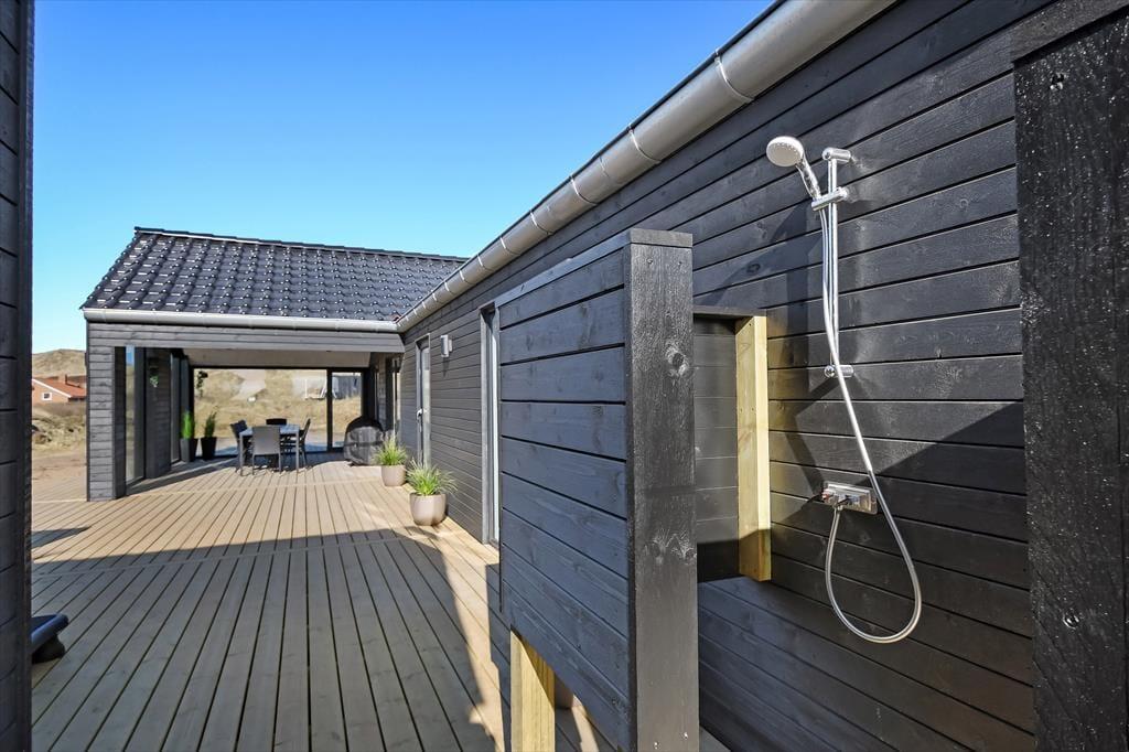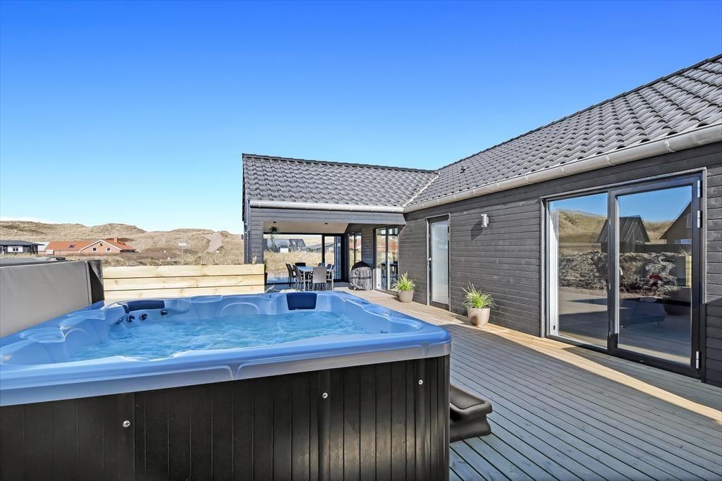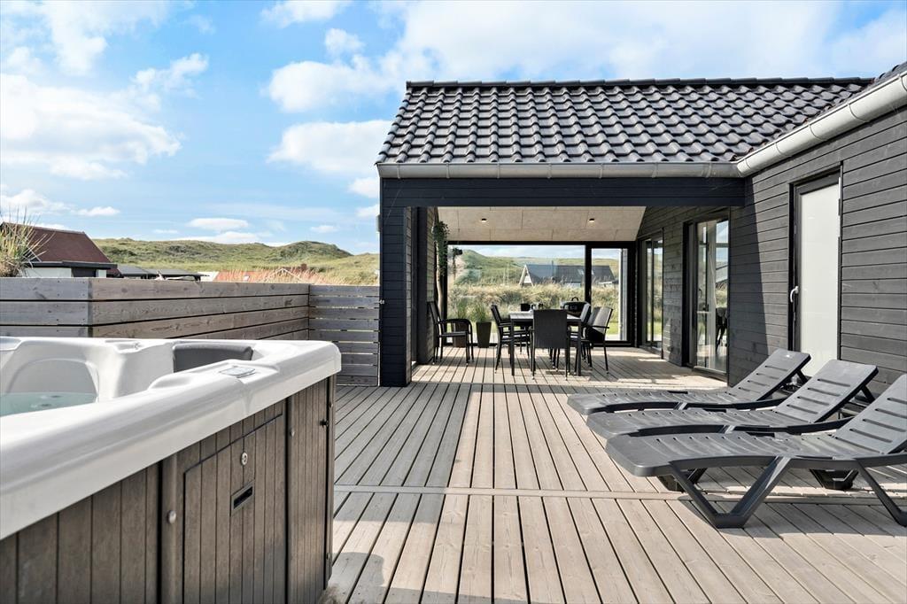 Den imponerende 100 m² store terrasse er som skabt til livsnydere. Her kan I lade jer synke ned i det varme vand i udespaen eller få varmen i saunaen, mens den friske havluft fylder jeres lunger. Terrassen er udstyret med komfortable havemøbler og en grill, så I kan tilberede og nyde jeres måltider under åben himmel. Efter middagen er det oplagt at slappe af i liggestolene og lade dagens indtryk bundfælde sig, mens solen går ned over klitterne.