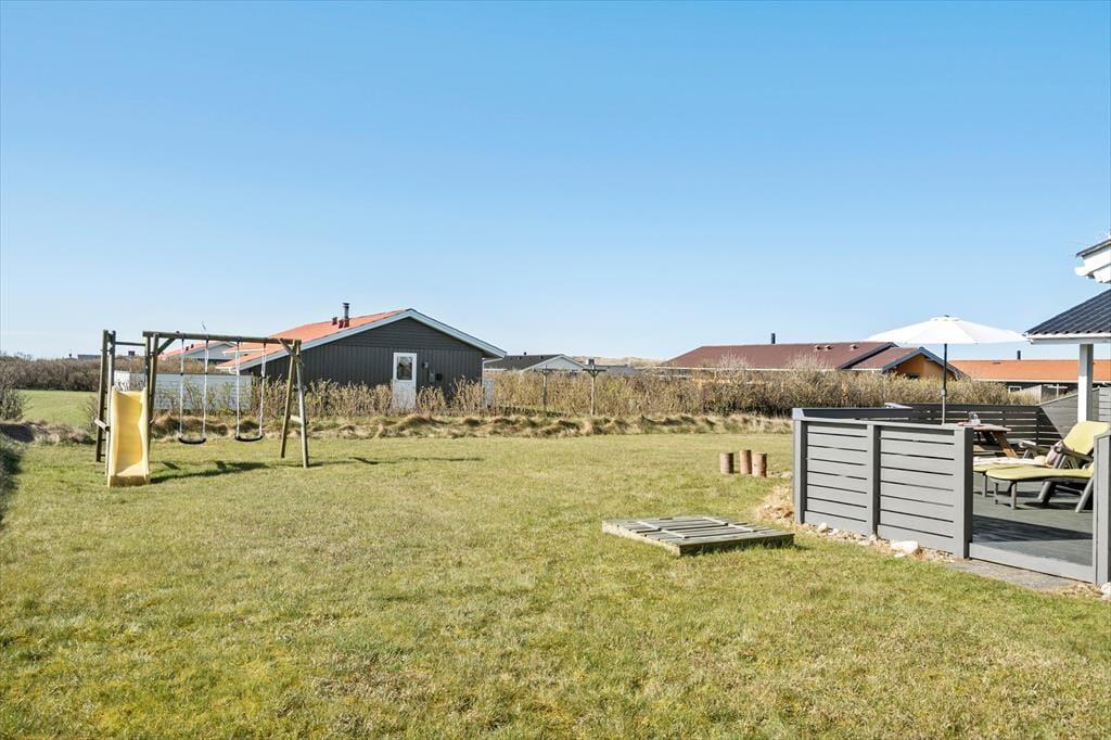I haven er der plads til både afslapning og aktivitet. De yngste kan slå sig løs i sandkassen eller svinge sig i gyngerne, mens du finder en god plads i solen med en kop kaffe. Når aftenen falder på, bliver bålstedet et naturligt samlingspunkt for både snobrød, varme tæpper og hyggelige samtaler under stjernerne. Der er noget ganske særligt ved udelivet her – måske er det havbrisen, den stille ro eller synet af klitterne i horisonten, der får skuldrene til at sænke sig.