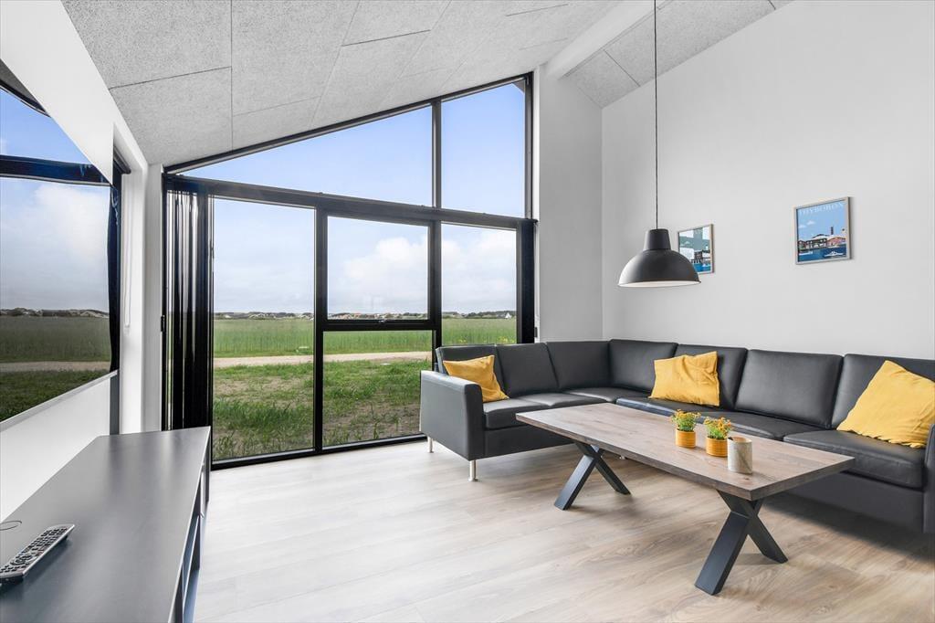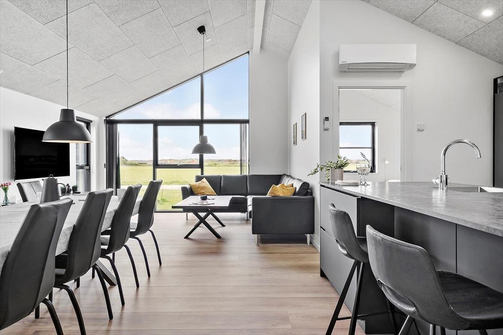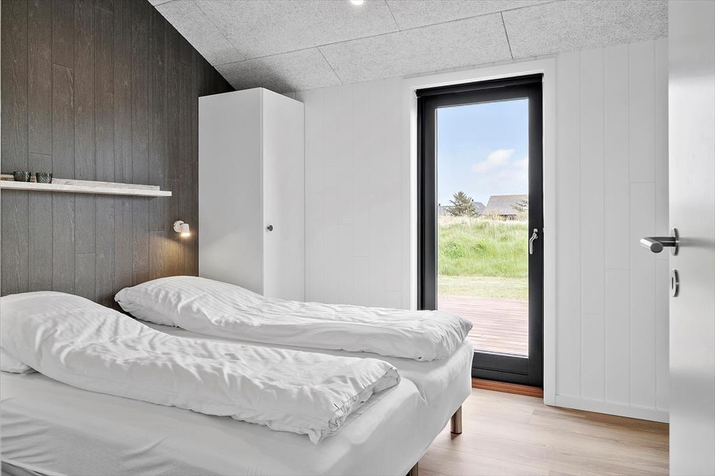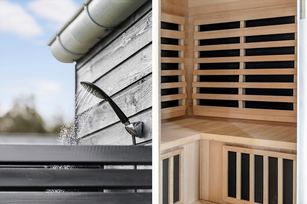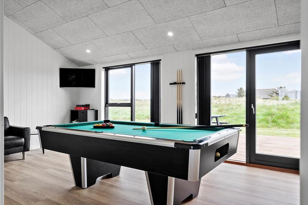 Sommerhuset, opført i 2022, byder på en lys og rummelig atmosfære med højt til loftet og store vinduespartier, der lader dagslyset strømme ind. De fem soveværelser er indrettet med komfortable senge, hvoraf tre har dobbeltsenge og to har enkeltsenge, hvilket gør huset velegnet til op til ti personer. De to badeværelser er strategisk placeret i hver sin ende af huset; det største er udstyret med en indbydende sauna og har direkte adgang til terrassen, hvor en udendørs bruser og spabad venter. Opholdsrummet kombinerer køkken, spiseplads og stue i ét åbent område, perfekt til fælles madlavning og hyggelige stunder foran fladskærms-tv'et. Det tilstødende aktivitetsrum med poolbord sikrer underholdning for alle aldre, og udestuen med fleksible glaspartier giver mulighed for at nyde naturen uanset vejret.
