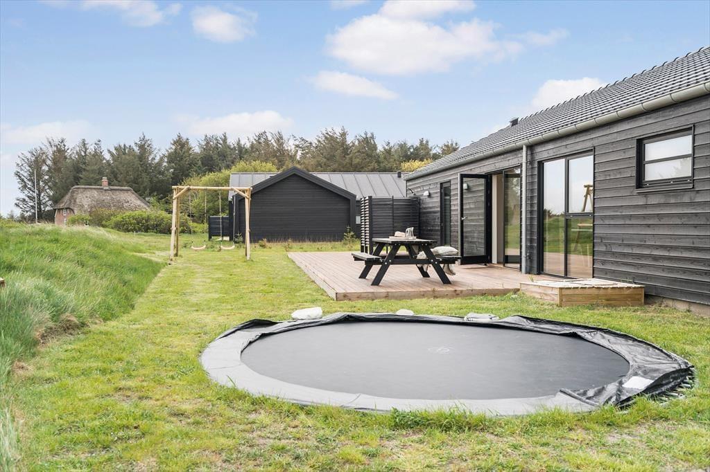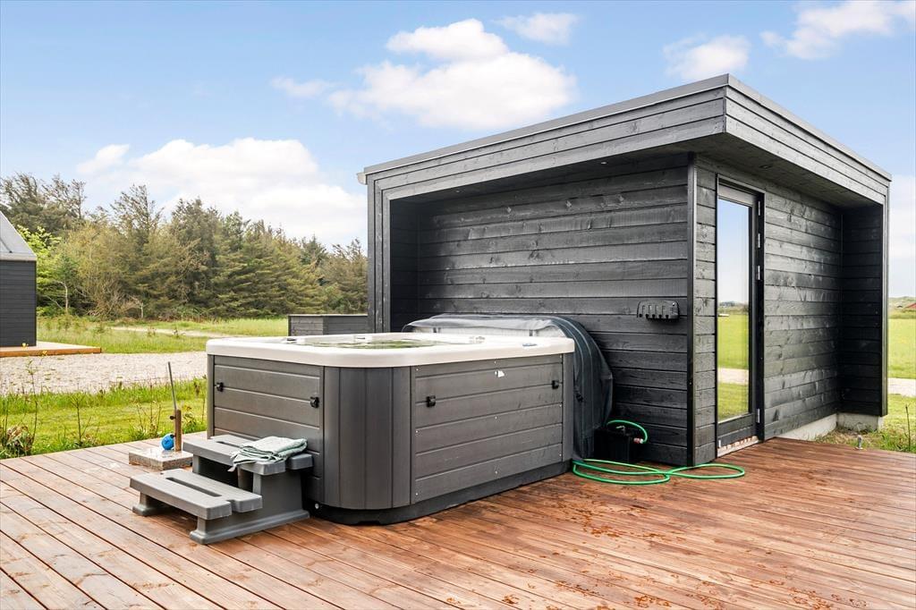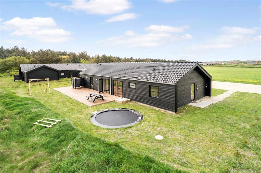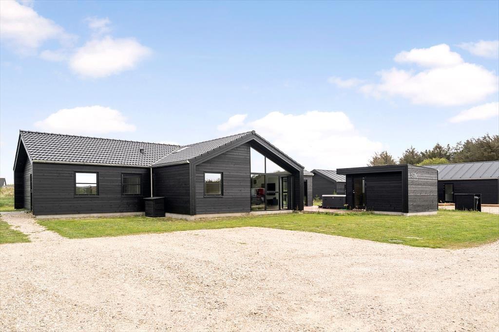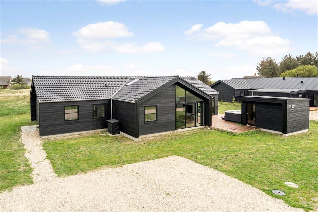 Dette nybyggede sommerhus på Strandvejen 158 C i Vejlby Klit tilbyder en luksuriøs ferieoplevelse med faciliteter som sauna, udendørs spabad og et aktivitetsrum med poolbord. Beliggende kun 650 meter fra Vesterhavets bølger er det ideelt for dem, der ønsker både afslapning og sjov tæt på stranden.