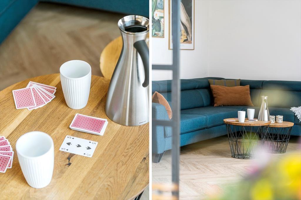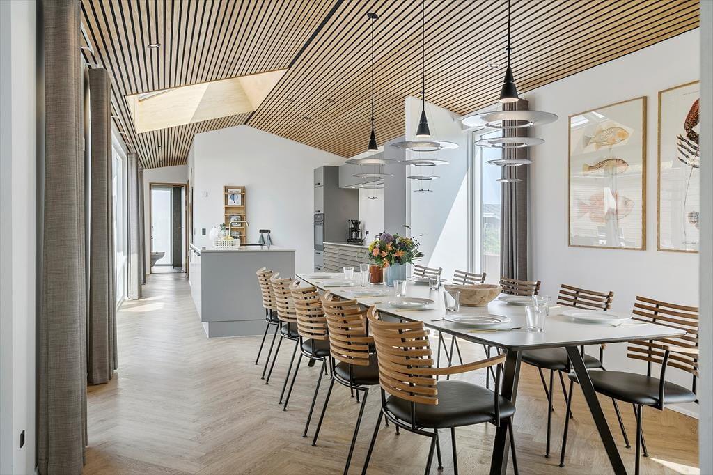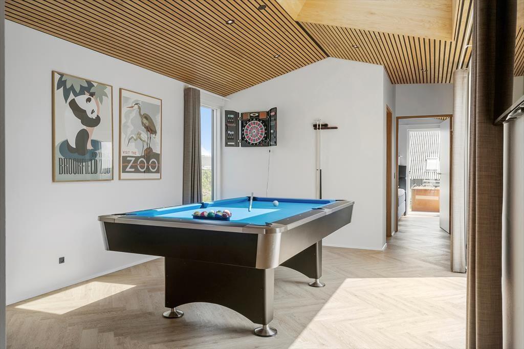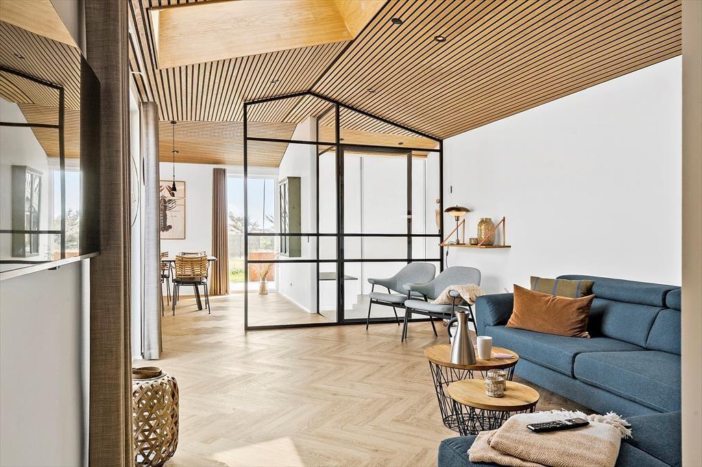 Allerede når du træder ind i sommerhuset, mærker du, at her er der kræset for detaljerne. Den indbydende indretning er både elegant og hjemlig med sine varme træoverflader, smagfulde møbler og lysindfald fra de store vinduespartier. I det åbne opholdsrum glider køkken, spiseplads og stue naturligt sammen og skaber en oplagt ramme for hyggelige feriestunder – uanset om du tilbereder aftensmaden, spiller spil. Har du lyst til leg og konkurrence, kan du gå i aktivitetsrummet, hvor et pool bord indbyder til timer med sjov og latter. Det er et hus, hvor både æstetik og funktionalitet går hånd i hånd, og hvor du straks føler dig hjemme.