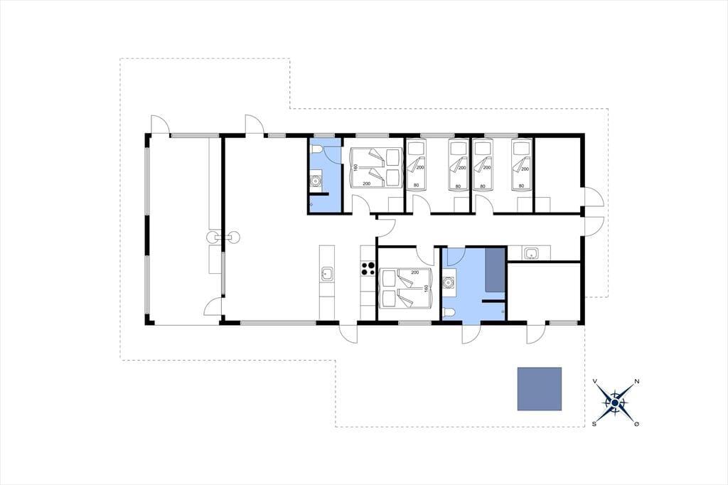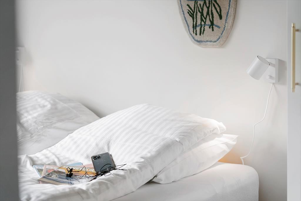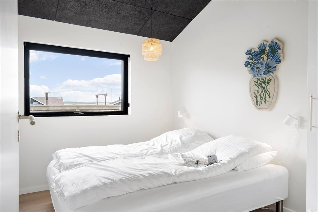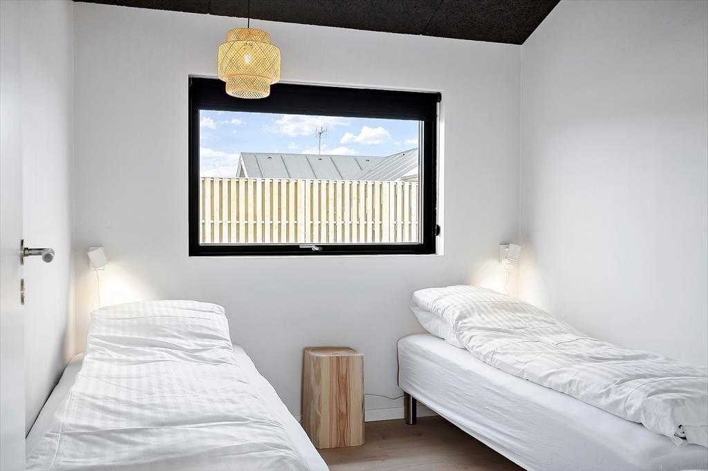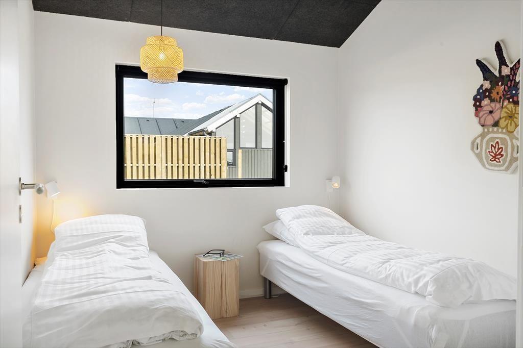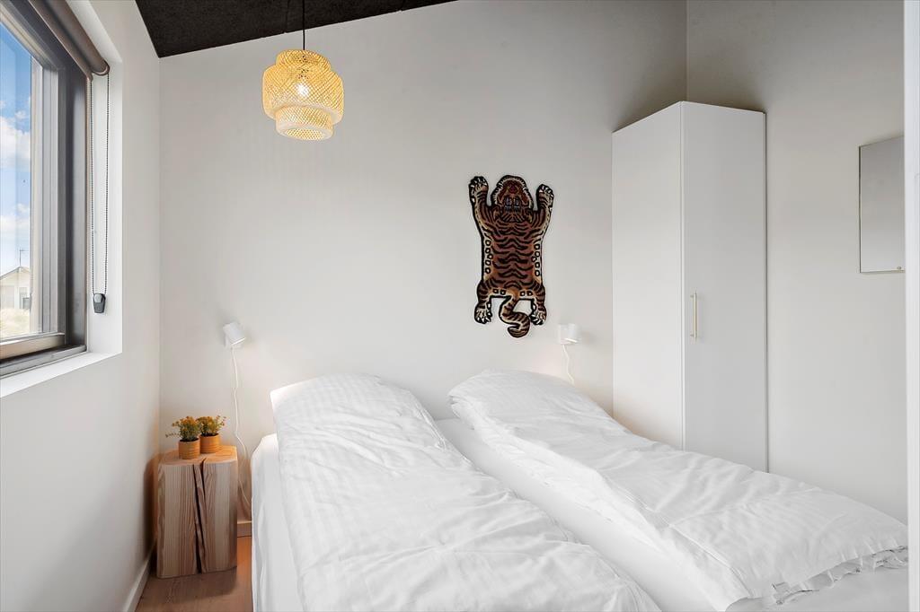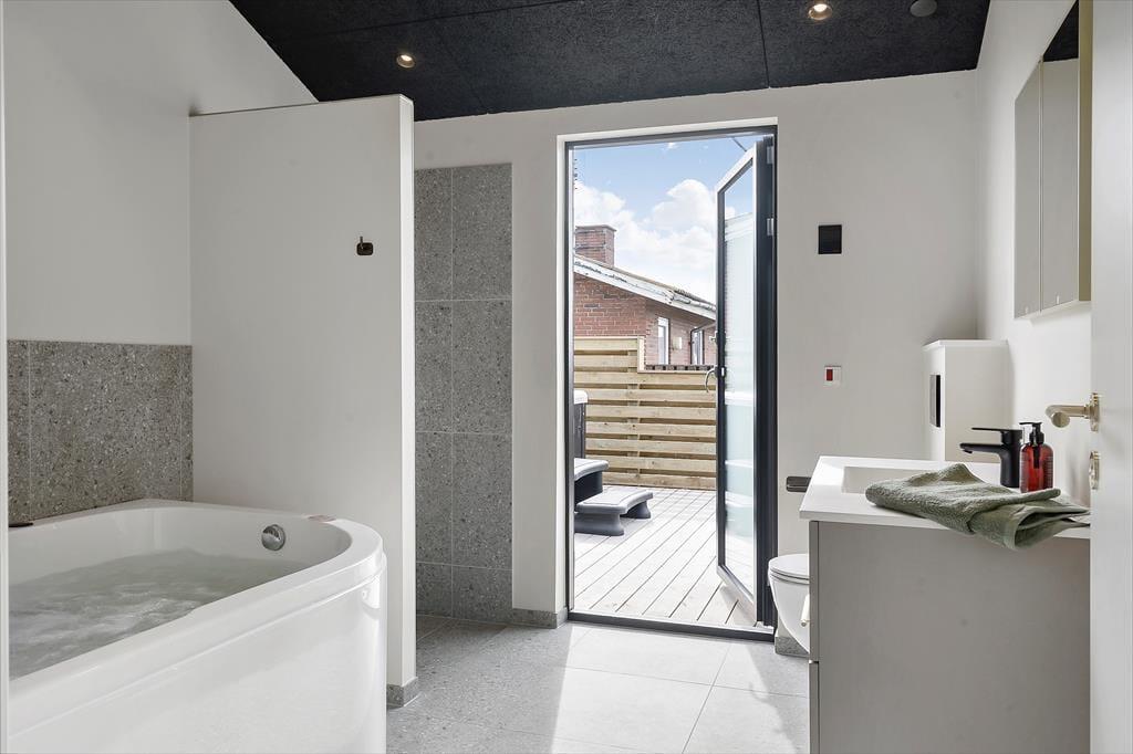 Sommerhusets fire soveværelser er alle udstyret med komfortable senge og praktiske garderobeskabe, og i et vaskerum ved siden af entréen finder I vaskemaskinen og tørretumbleren. Et af soveværelserne har eget badeværelse, mens husets store spabadeværelse har dør ud til terrassen, hvor I finder det udendørs wellnessområde.